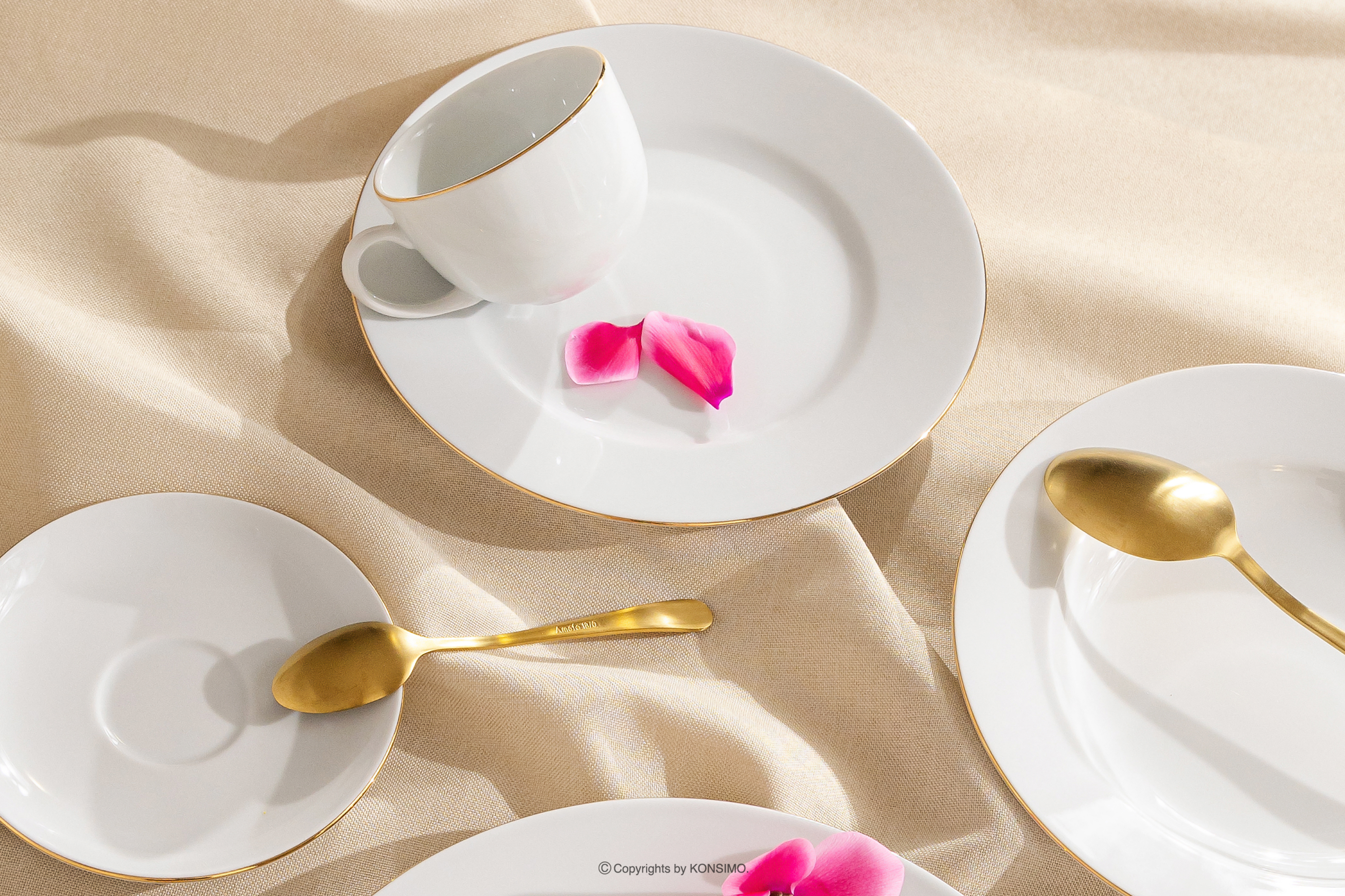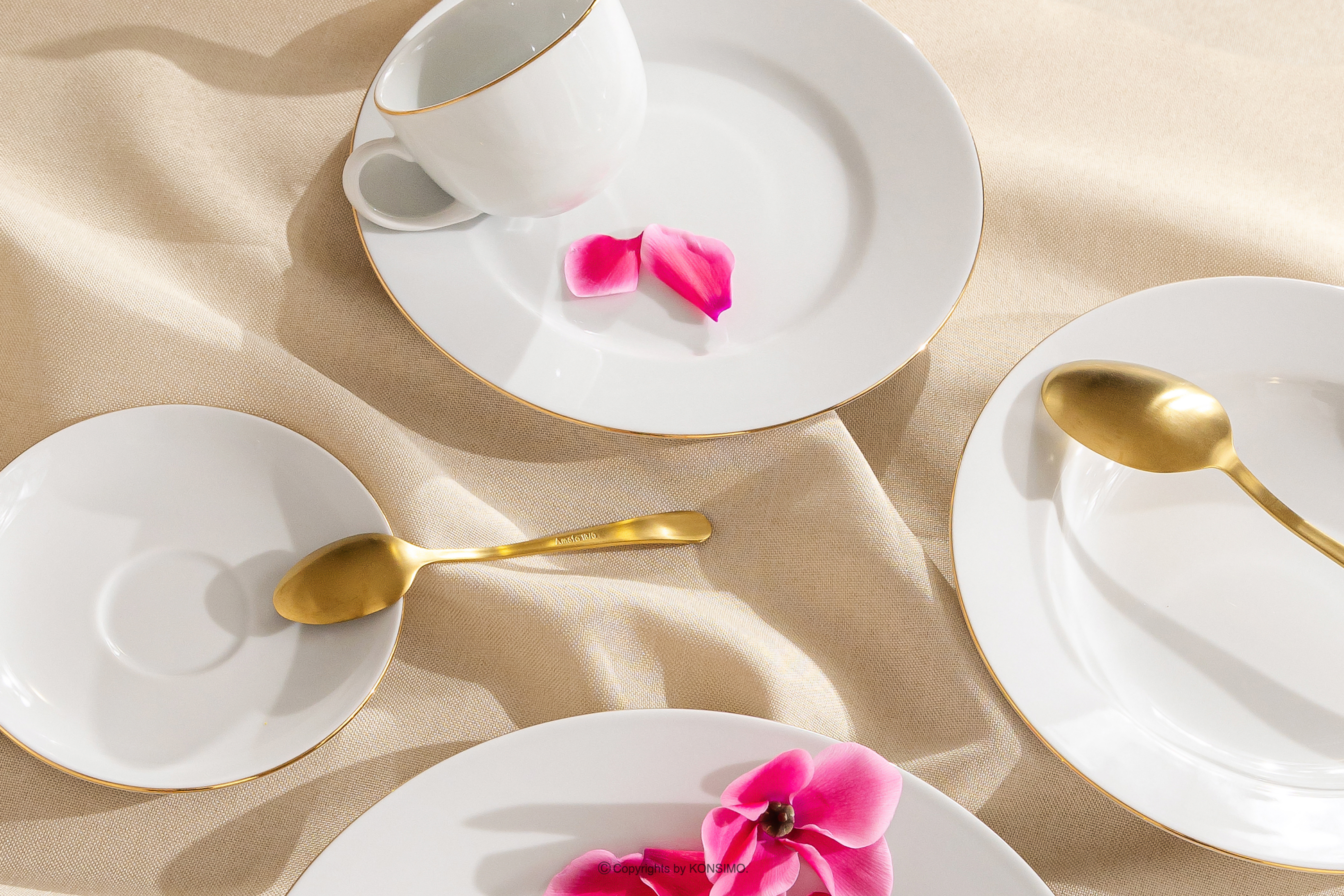 Elegantný dezertný tanier 6 ks zlatej línie je dokonalou kombináciou elegancie a funkčnosti. Jemnosť jemného okraja robí tanier MUSCARI jedinečným a upúta pozornosť svojím sofistikovaným štýlom. Vysoká kvalita porcelánu použitého na výrobu tejto súpravy sa premieta nielen do estetického vzhľadu, ale predovšetkým zaručuje trvanlivosť a odolnosť voči poškodeniu. Porcelán je materiál, ktorý zaujme svojou jemnosťou a zároveň je odolný a pevný.