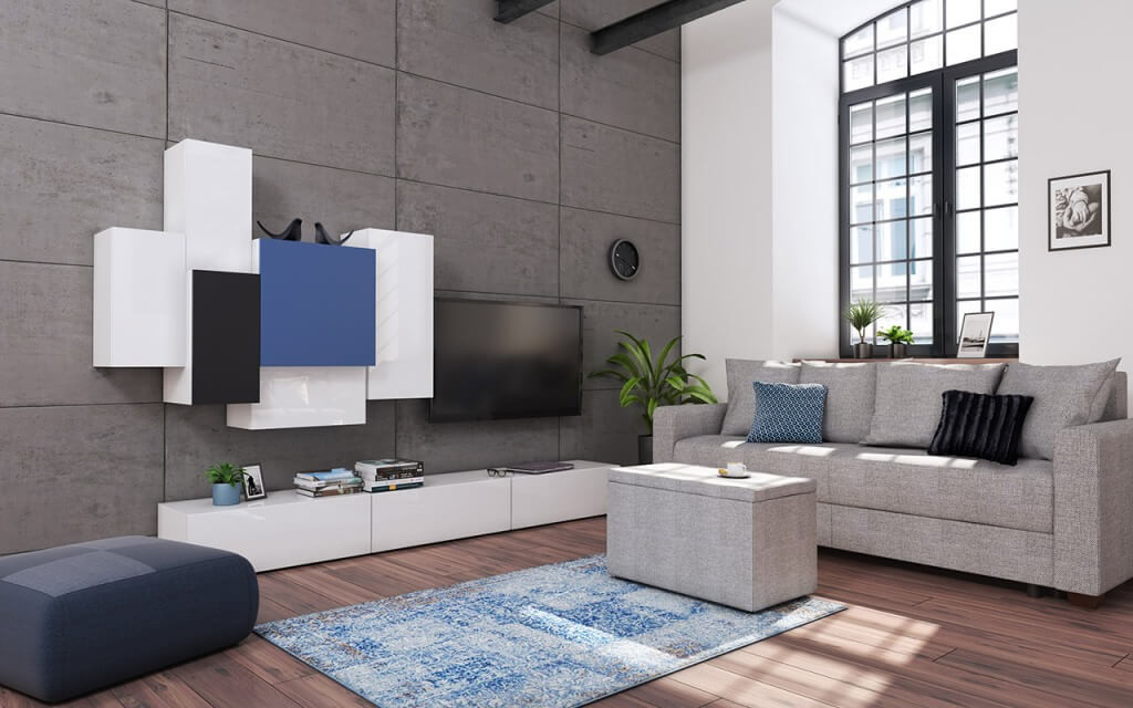 SCAVO Objav celú kolekciu Farebná závesná knižnica biela / čierna / modrá- farba bílá/bílý lesk/modrý lesk/černý lesk