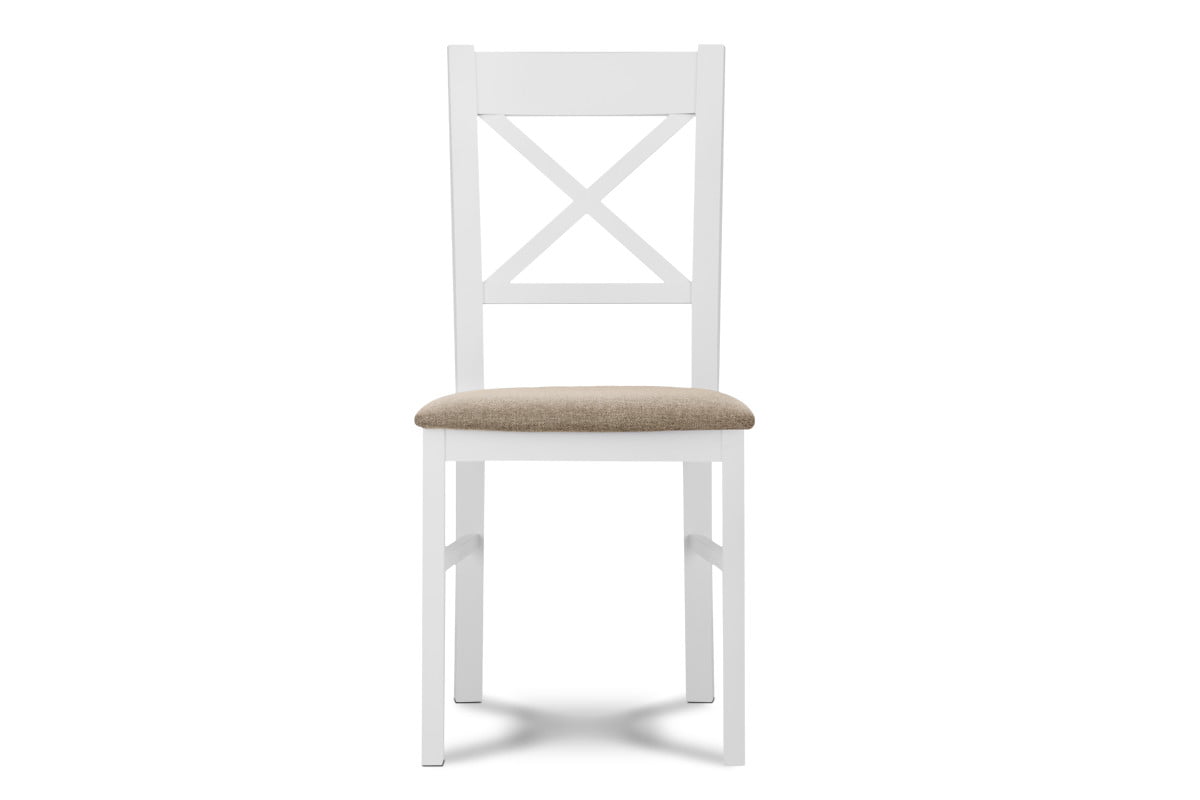 CRAM Jednoduchá biela drevená stolička s krížom v operadle, buk, béžová tkaná látka