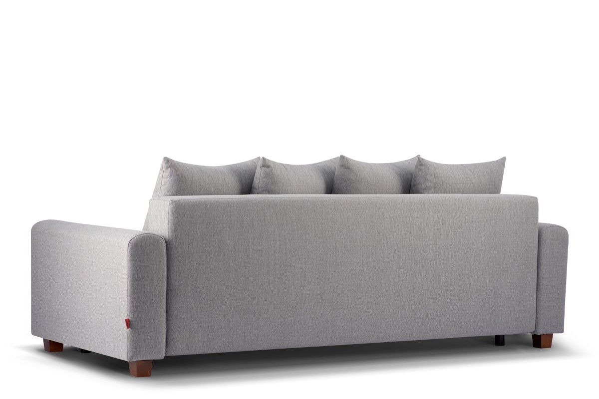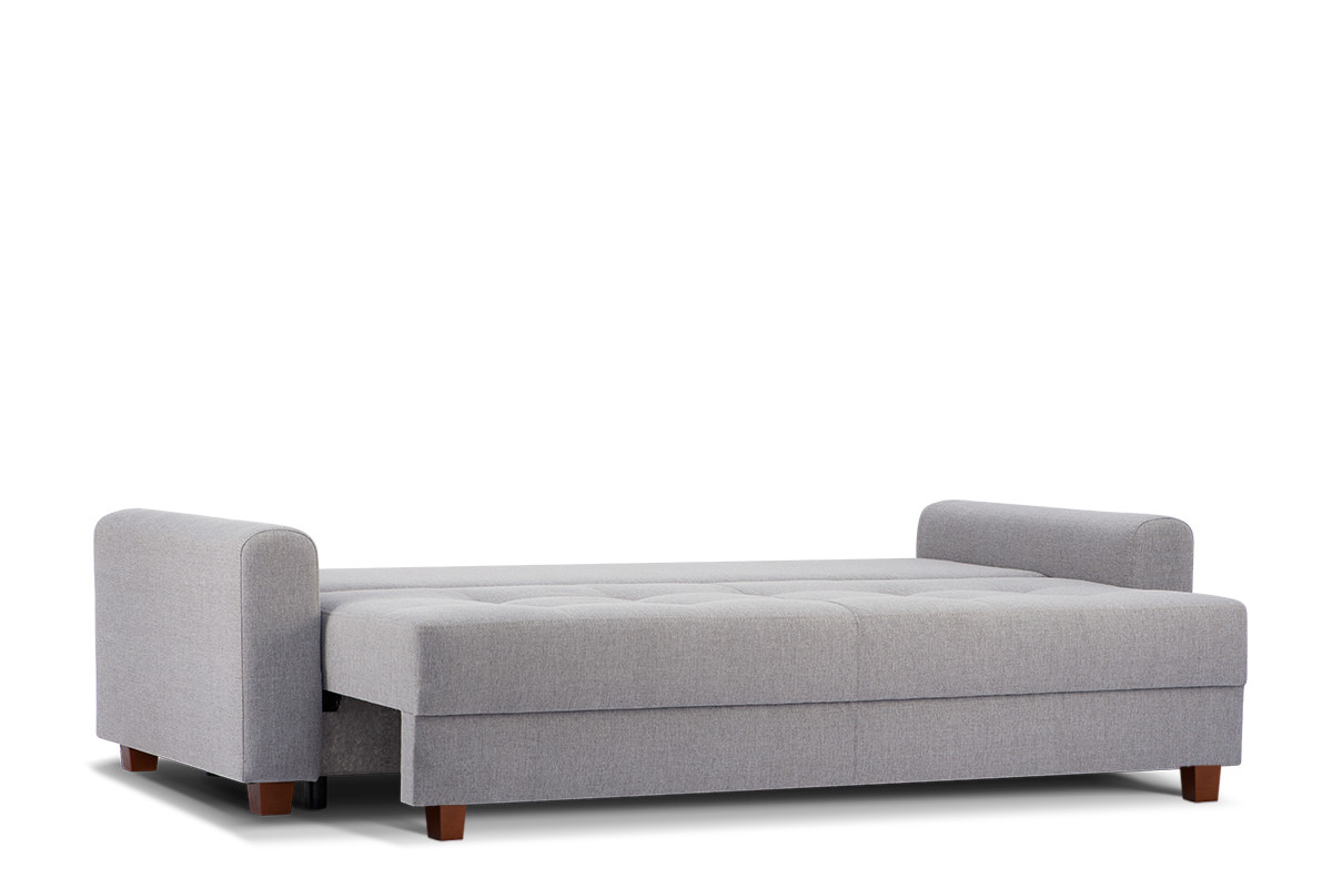 Moderná svetlosivá pohovka REVO s funkciou spania, navrhnutá s ohľadom na funkčnosť, funguje cez deň ako pohodlná pohovka a v noci sa zmení na širokú a praktickú posteľ. Vďaka rozkladaciemu mechanizmu DL sa pohovka rýchlo a efektívne rozloží - stačí len vyklopiť zadnú časť nábytku dopredu. Do veľkého úložného priestoru sa zmestia lôžkoviny a iné predmety.