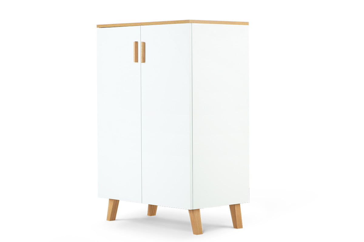 Biela škandinávska komoda z kolekcie FRISK je funkčný kus nábytku, ktorý sa bude dobre vynímať v spálni, ale aj v obývačke alebo v izbe pre hostí. Moderný dizajn, biele lamino, drevené nohy a úchyty podčiarkujú škandinávsky módny charakter tejto komody. Veľký objem a nastaviteľné police z nej robia veľmi funkčný kus nábytku.