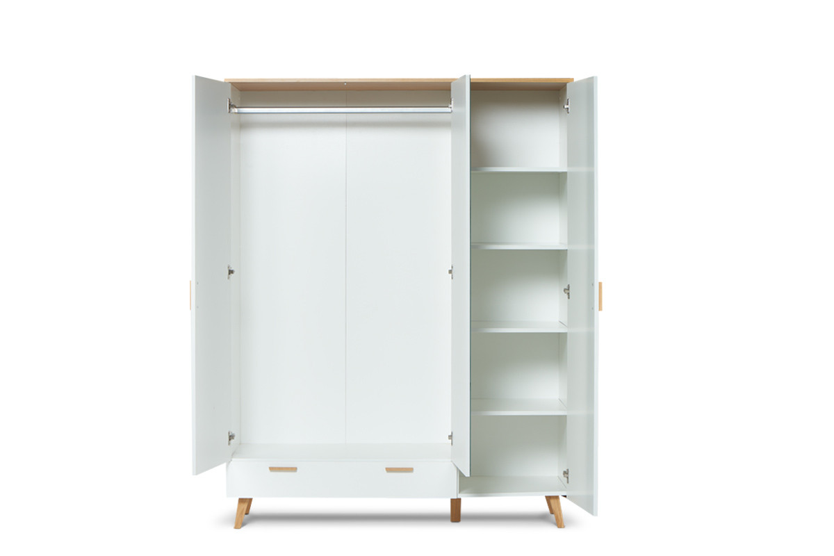 Módna biela škandinávska šatníková skriňa z kolekcie FRISK bola vyrobená pre ľudí, ktorí oceňujú moderný a jednoduchý štýl - dokonale sa hodí do škandinávskeho štýlu alebo do miestnosti s minimalistickým, moderným charakterom. Biela farba lamina, drevených nôh a lamiel podčiarkuje škandinávsky štýl a dodáva jej elegantný vzhľad. Ide o cenovo dostupný výrobok, ktorý dodá vašej miestnosti jedinečný výraz.