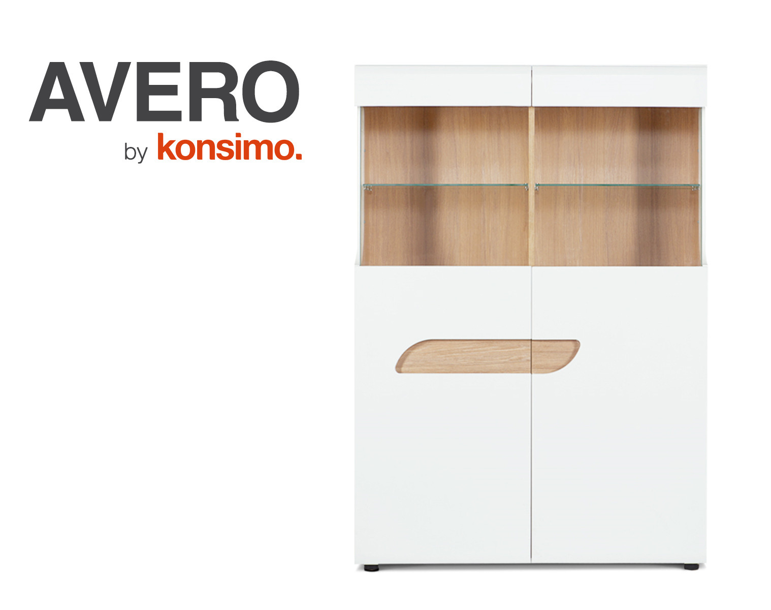 Dizajnová a moderná vitrína z kolekcie AVERO je perfektnou voľbou do štýlovej obývacej izby, jedálne alebo haly. Veľké police poskytujú dostatok priestoru na uloženie najrôznejších predmetov. Na druhú stranu zasklenie z tvrdeného skla vám umožní vystaviť tie najštýlovejšie dekorácie a prvky bytového zariadenia. Frézované priehlbiny vo dverách zdôrazňujú moderný štýl tohto webu a dodávajú mu jedinečné kúzlo.
