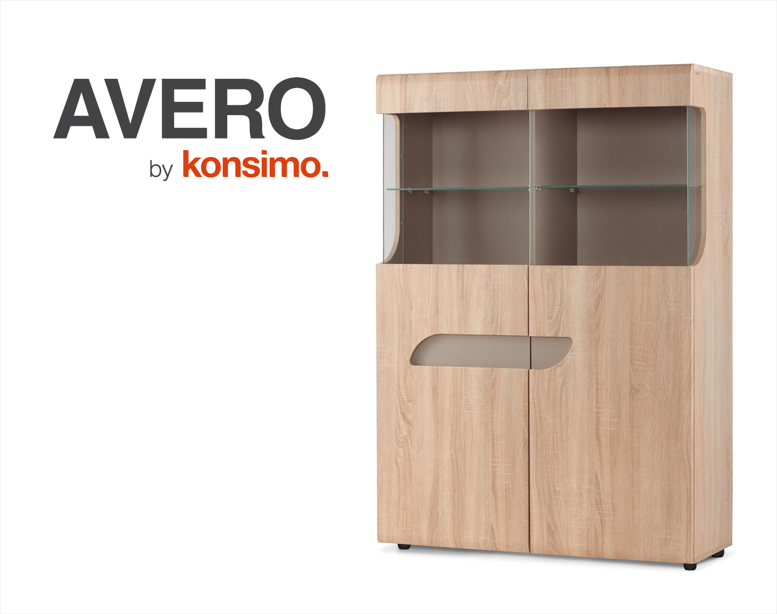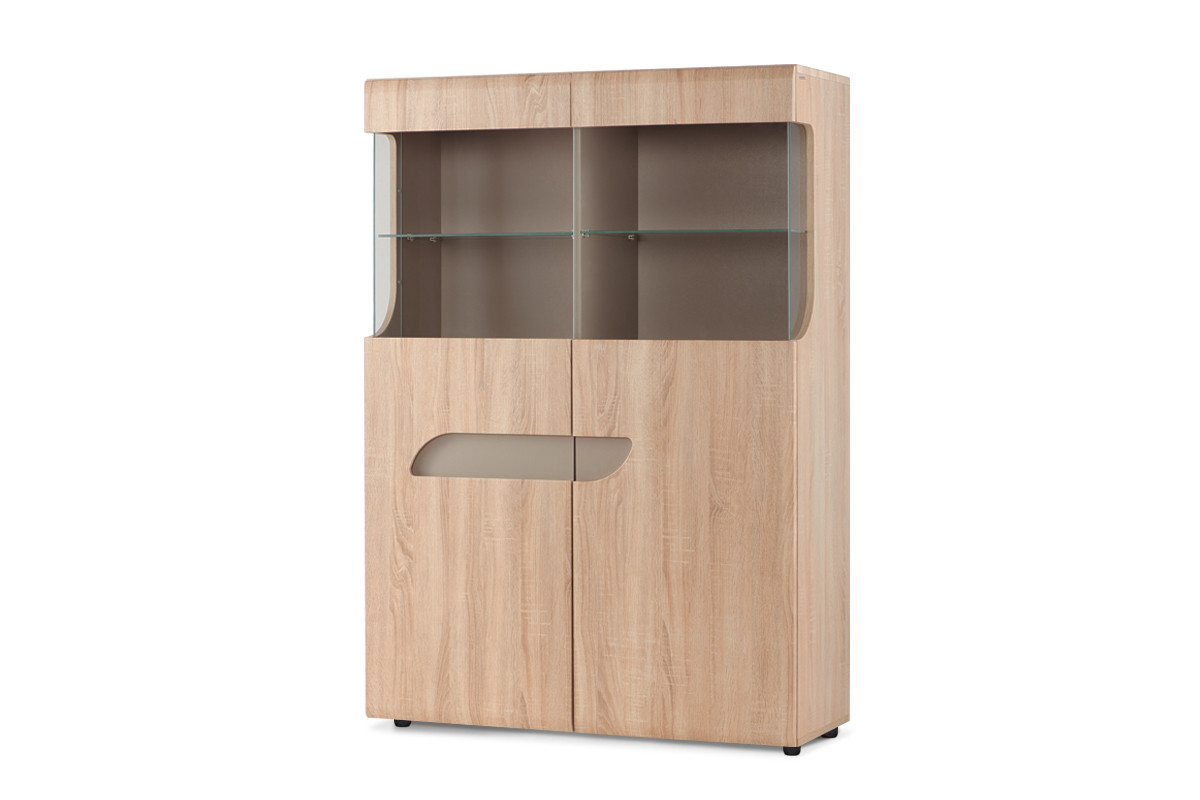 Dizajnová a moderná vitrína z kolekcie AVERO je perfektnou voľbou do štýlovej obývacej izby, jedálne alebo haly. Veľké police poskytujú dostatok priestoru na uloženie najrôznejších predmetov. Na druhú stranu zasklenie z tvrdeného skla vám umožní vystaviť tie najštýlovejšie dekorácie a prvky bytového zariadenia. Frézované priehlbiny vo dverách zdôrazňujú moderný štýl tohto webu a dodávajú mu jedinečné kúzlo.