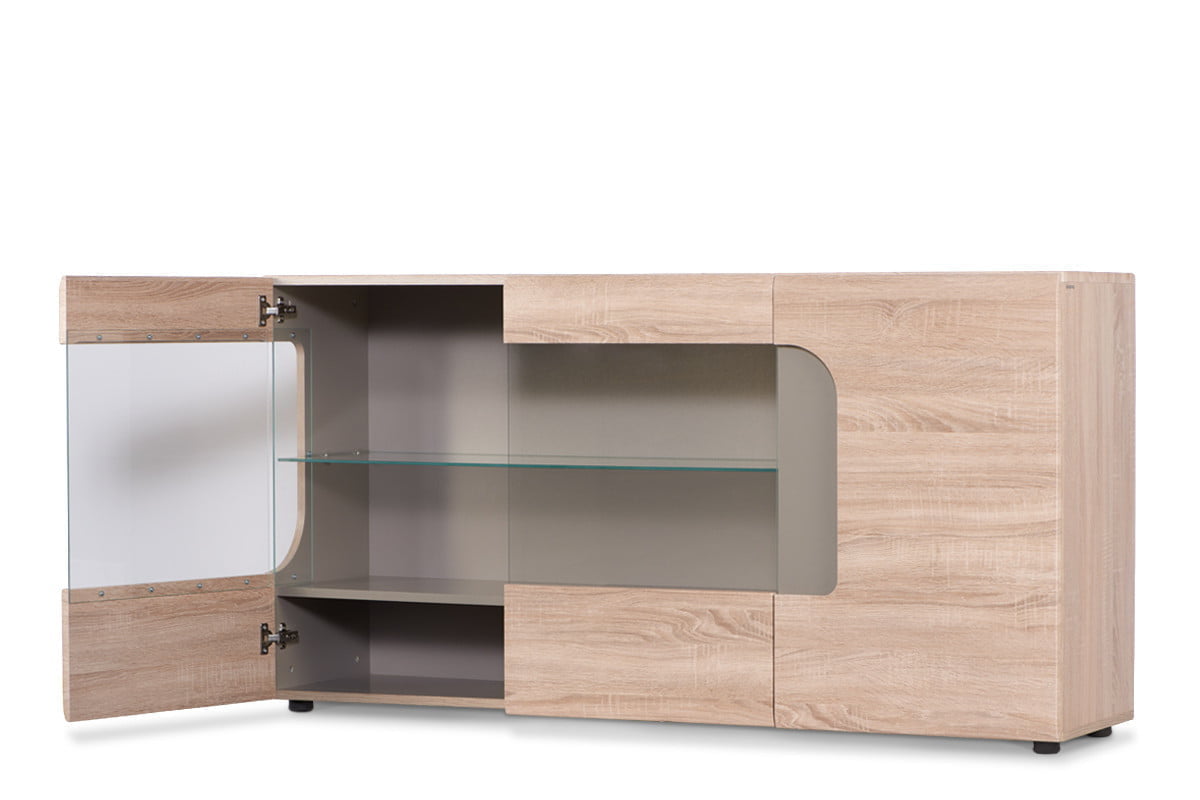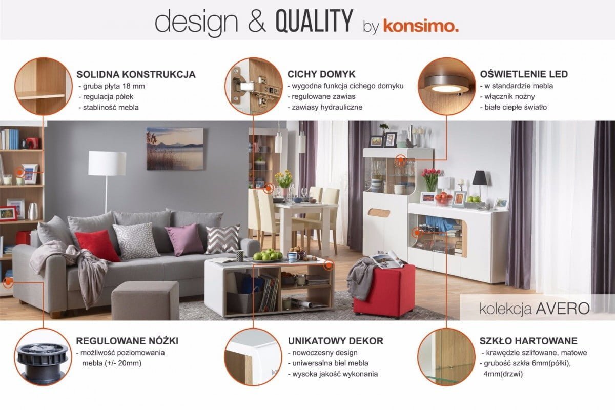 Krásna a moderná komoda z kolekcie AVERO je funkčným nábytkom, ktorý sa bude dobre vynímať v obývacej izbe alebo obývacej izbe a izbe pre hostí. Ozdobné frézované prelisy a presklené dvierka zdôrazňujú moderný štýl a módny charakter tejto komody. Veľká kapacita skríň umožňuje uložiť mnoho vecí a vďaka preskleným dvierkam môžete vystaviť tie najatraktívnejšie prvky vybavenia.