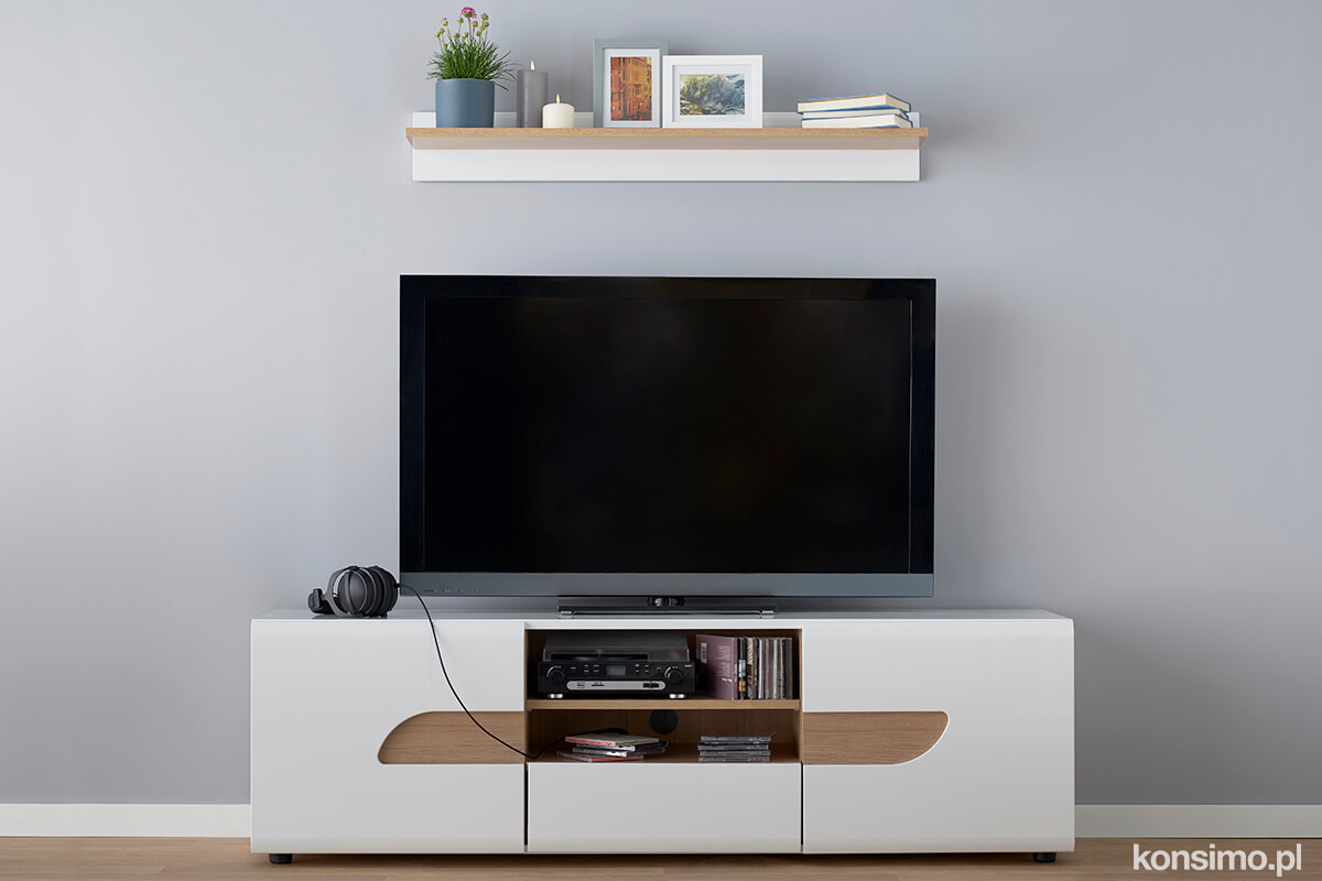 Veľká doska stola, priestranné police a jedna zásuvka poskytujú dostatok priestoru pre elektroniku, noviny alebo CD. K dispozícii v bielej farbe alebo lamináte podobnému drevu. Prelisy na dverách skrine zdôrazňujú moderný štýl skrine a dodávajú jej inovatívny charakter. Skrinka má 3 police a jednu zásuvku s funkciou mäkkého dovierania a otváraním push to open.