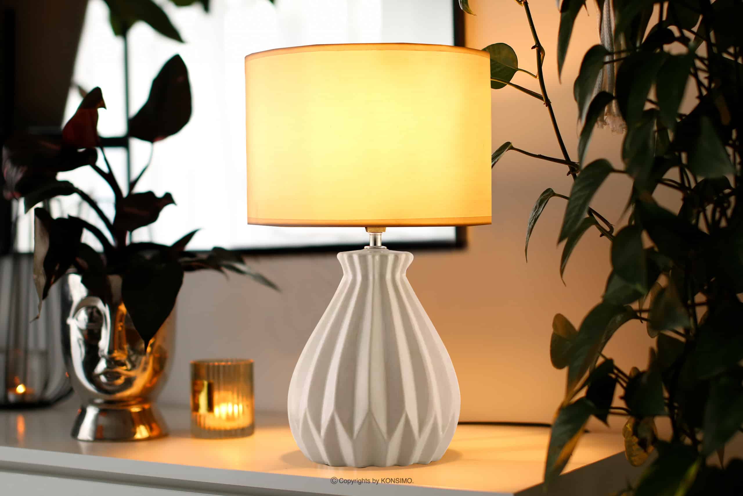 Podstavec je z keramiky, zatiaľ čo tienidlo je latkové.