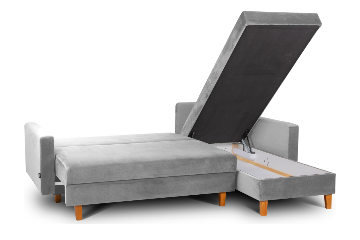 Rohová sedacia súprava do obývačky v škandinávskom štýle zo sivého velúru je vyrobená z kvalitných materiálov, má pevnú a stabilnú konštrukciu a zabezpečí pohodlný odpočinok pre členov domácnosti a hostí. Pohodlne sa rozkladá vďaka automatickému mechanizmu DL a poskytuje priestor na spanie - ideálne riešenie nielen pre hostí. Je ideálna aj do malých bytov, kde možno pohovku využiť ako posteľ.