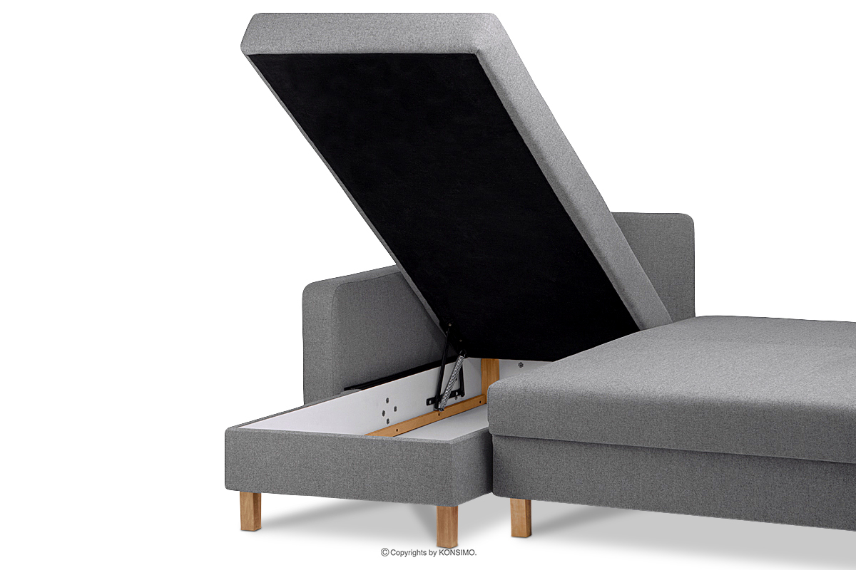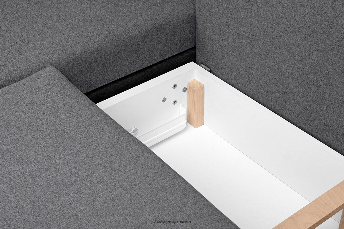 Do veľkej nádoby na lôžkoviny s vetracími otvormi sa zmestí všetko, čo potrebujete uložiť cez deň a čo potrebujete v noci. Vysokokvalitná tkaná látka vyniká odolnosťou proti oderu a poškodeniu a ľahko sa udržiava v čistote. Opierka chrbta a ozdobné vankúše majú v tuneloch zipsy, takže poťahy sa dajú ľahko vybrať a vyprať. Táto funkčná škandinávska rohová pohovka je mimoriadne pohodlná a praktická - bude vyzerať dobre nielen doma, ale aj v hoteli alebo čakárni.