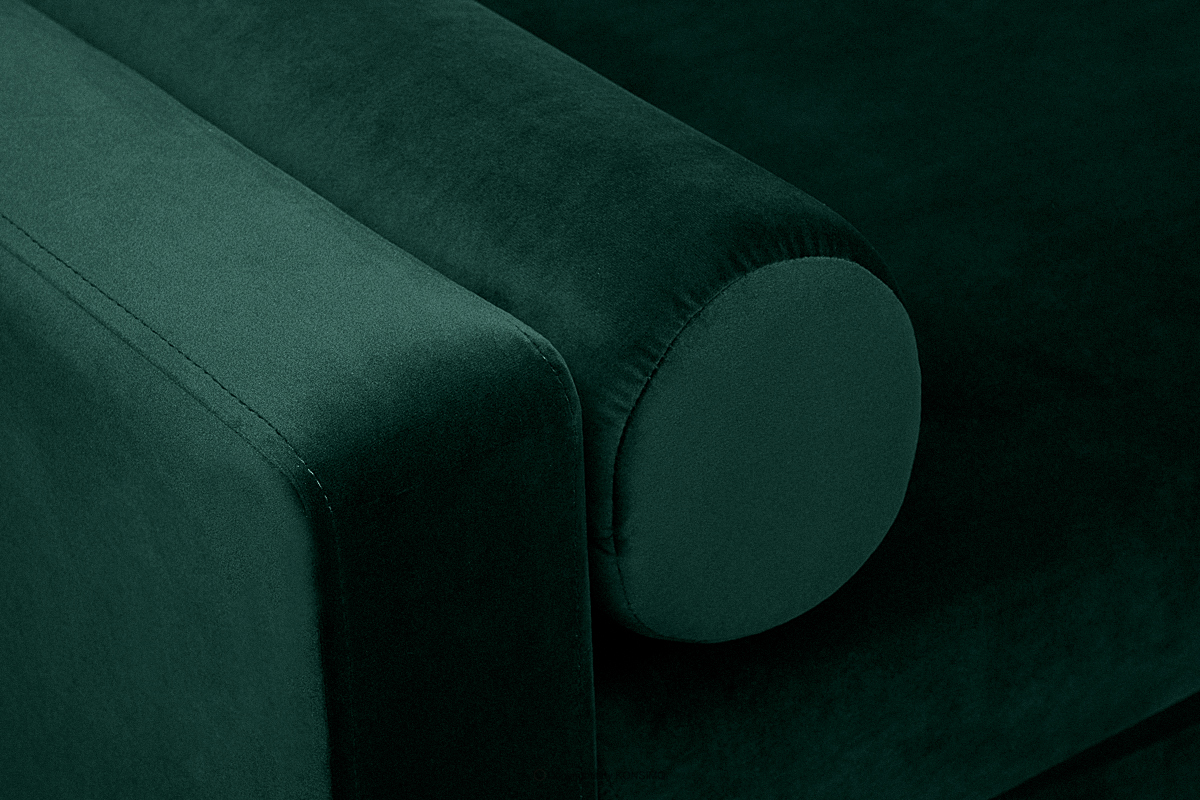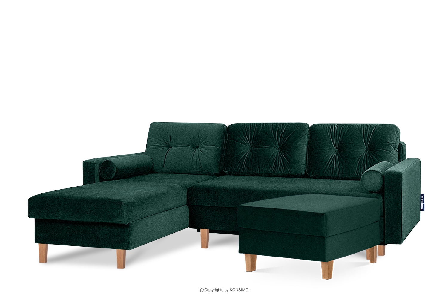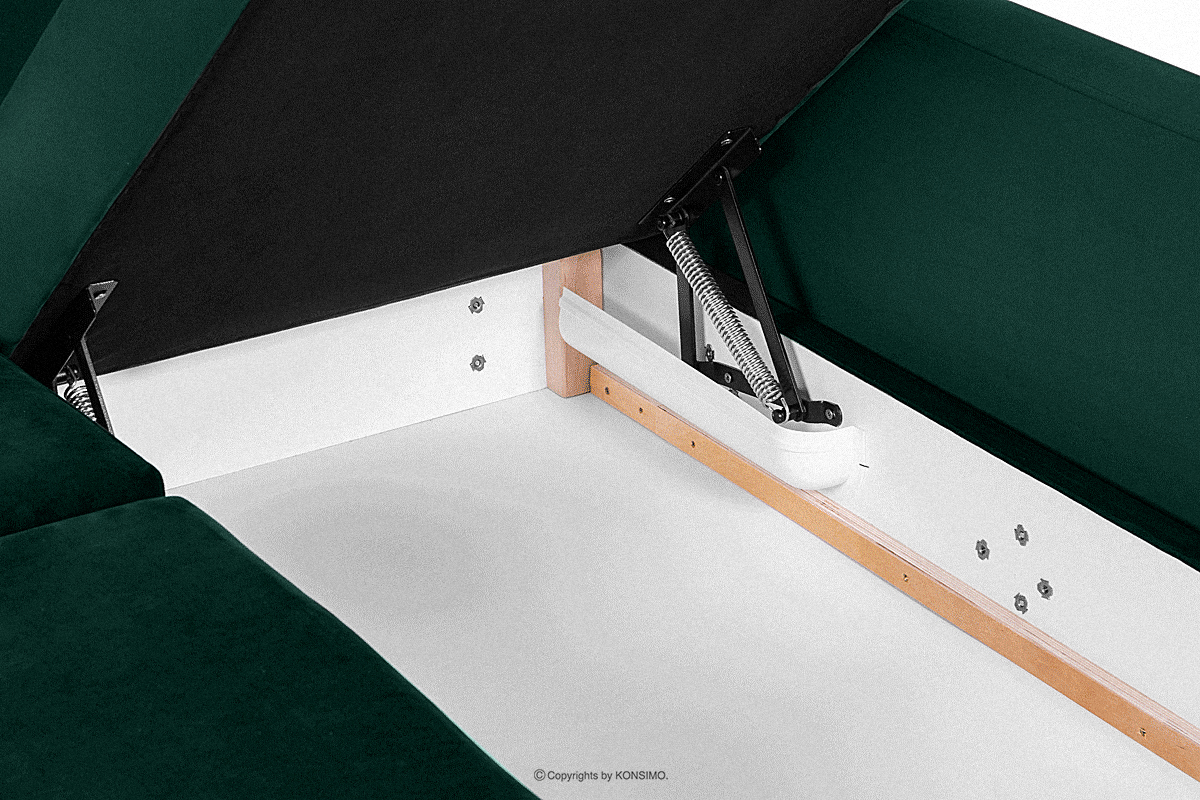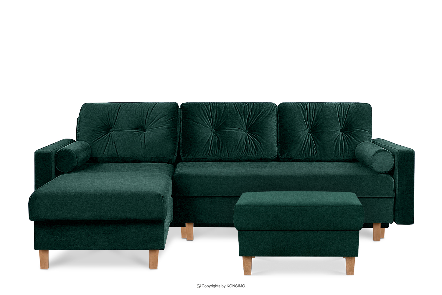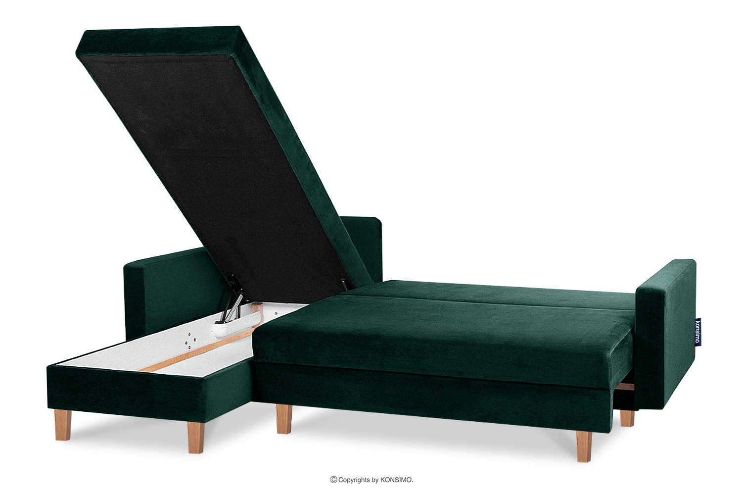 Rohová sedacia súprava vo fľaškovo zelenom velúre do obývačky v škandinávskom štýle je vyrobená z kvalitných materiálov, má pevnú a stabilnú konštrukciu a zabezpečí pohodlný odpočinok pre členov domácnosti a hostí. Pohodlne sa rozkladá vďaka automatickému mechanizmu DL a poskytuje priestor na spanie - ideálne riešenie nielen pre hostí. Je ideálna aj do malých bytov, kde možno pohovku využiť ako posteľ.