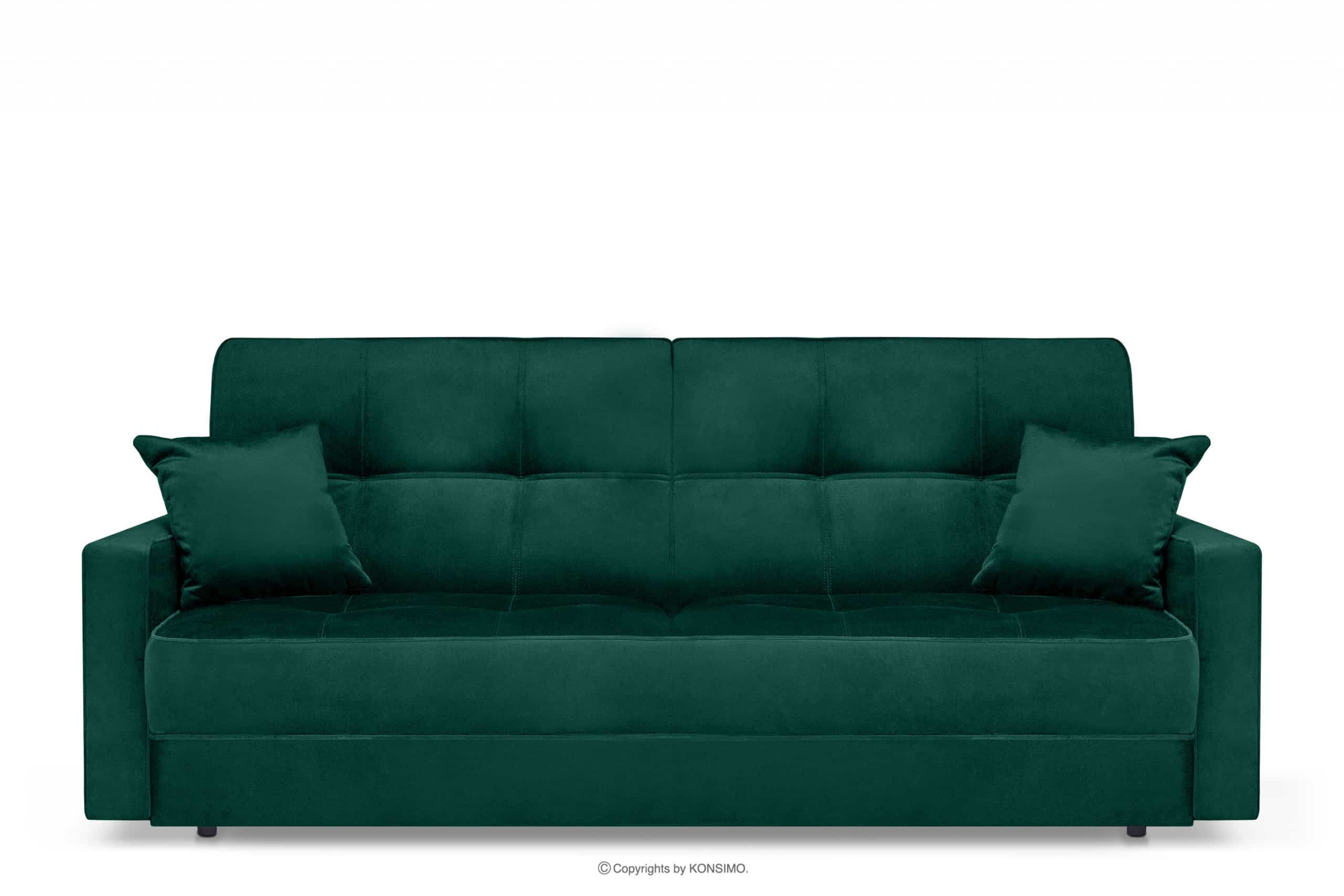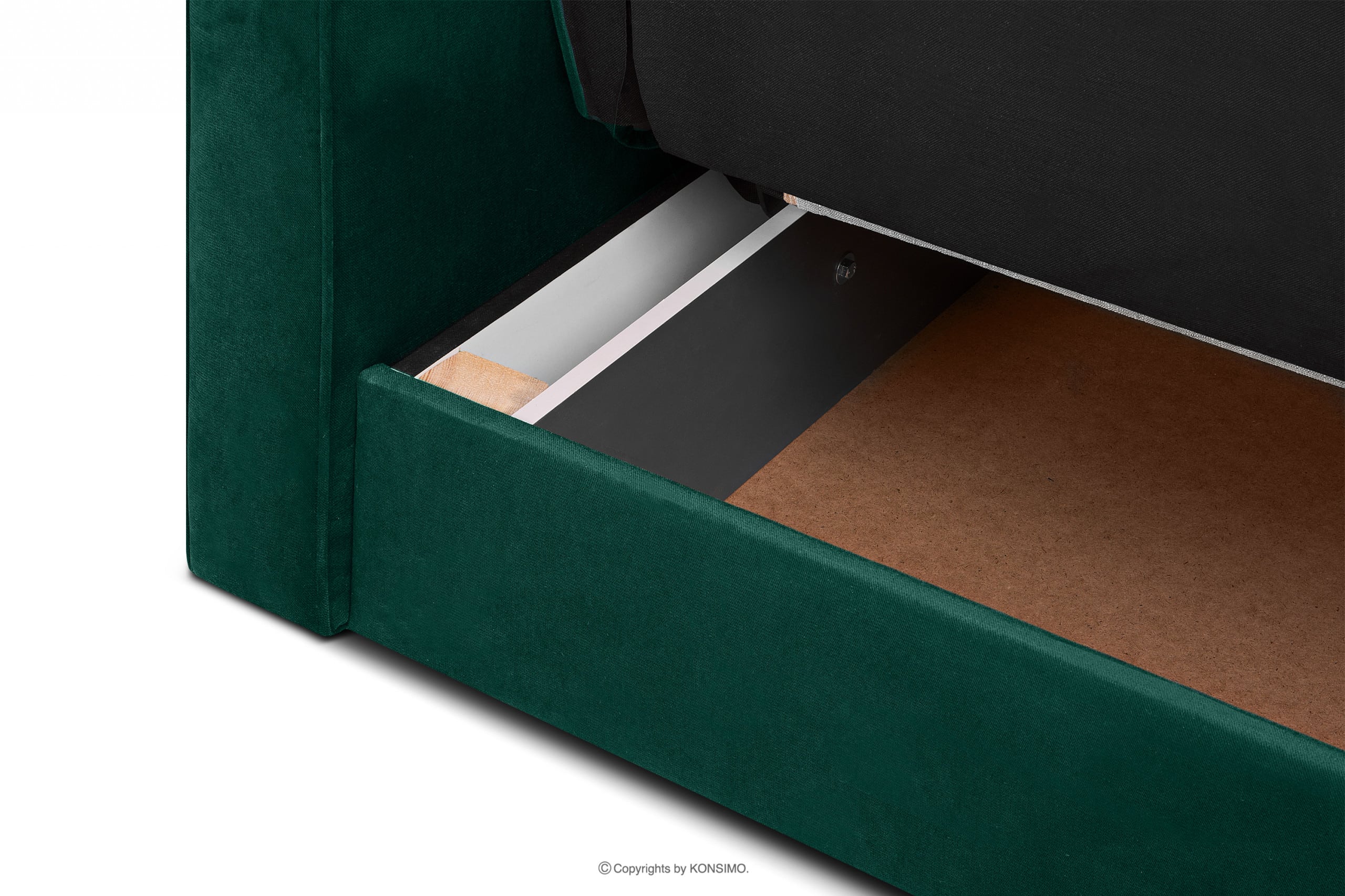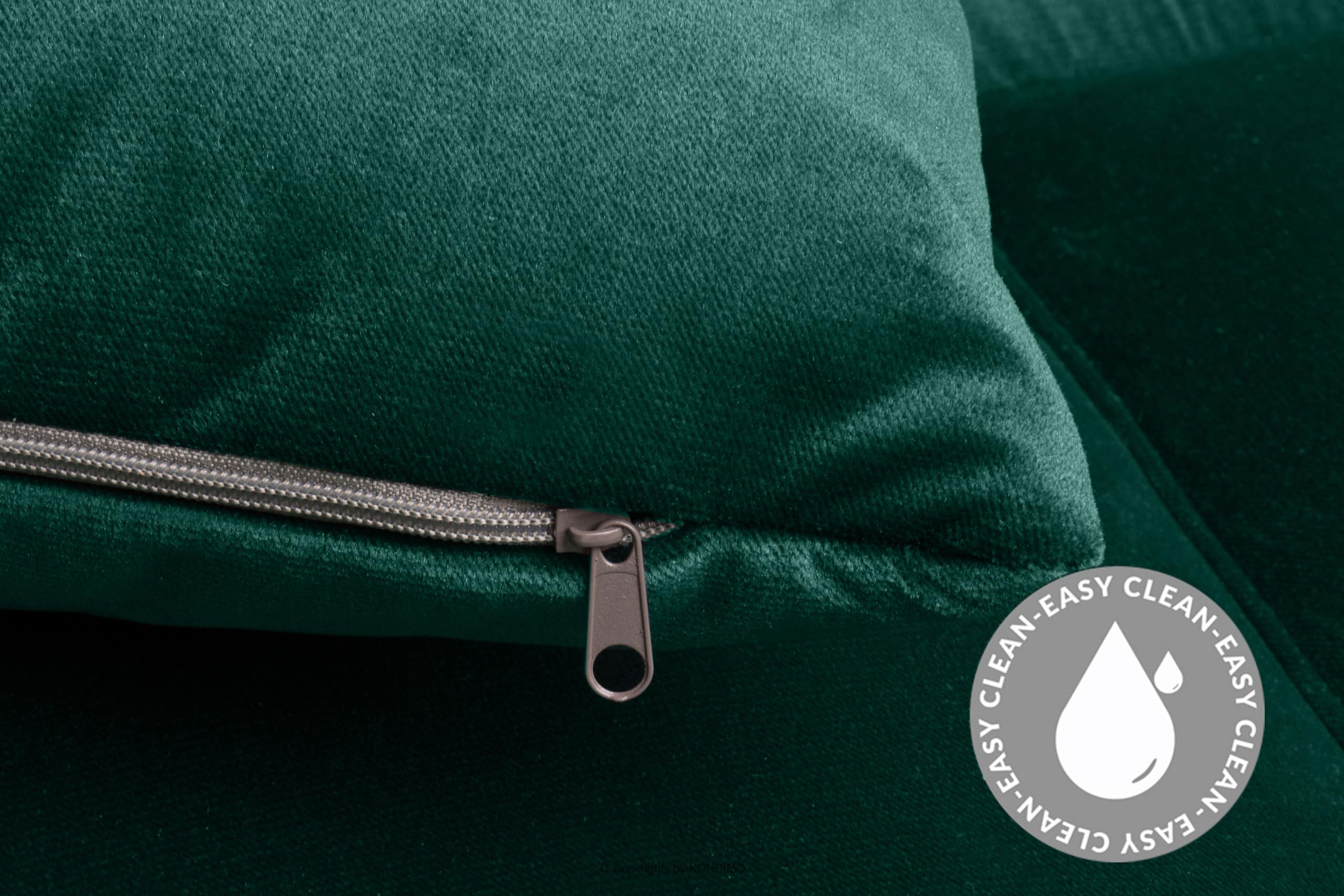 Zelená velurová rozkládací pohovka do obývacího pokoje je navržena v módním elegantním stylu a přes den se stane funkční pohovkou pro celou rodinu a v noci velkou a pohodlnou postelí. Praktický mechanismus funkce spaní - automatické rozkládání - výrazně usnadňuje rozkládání a skládání této moderní pohovky. Je vybaven prostorným kontejnerem na lůžkoviny.