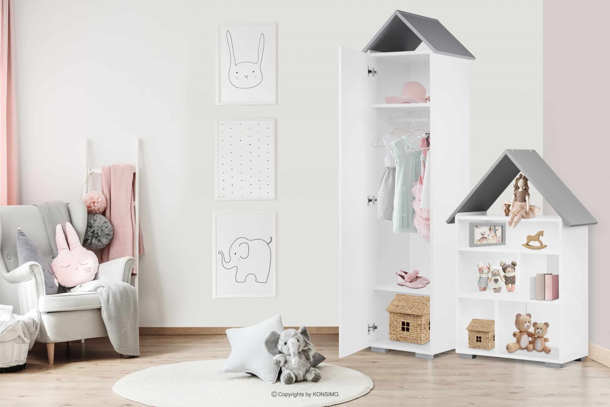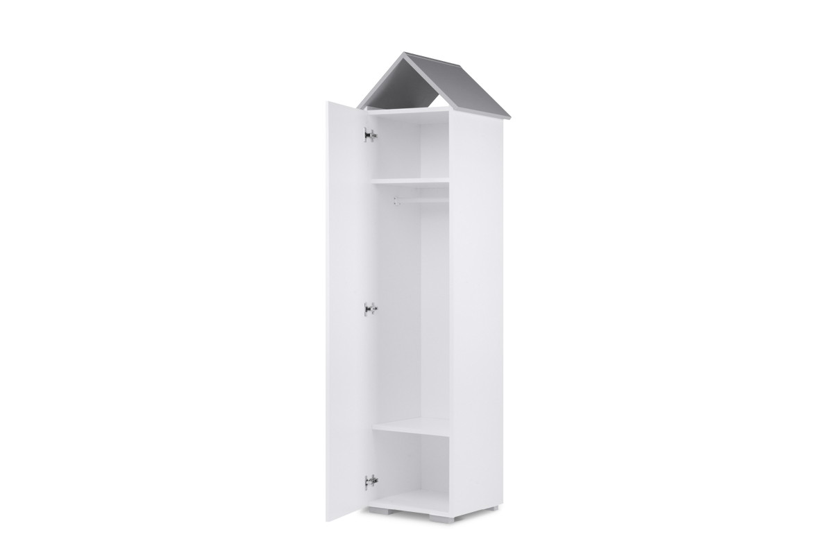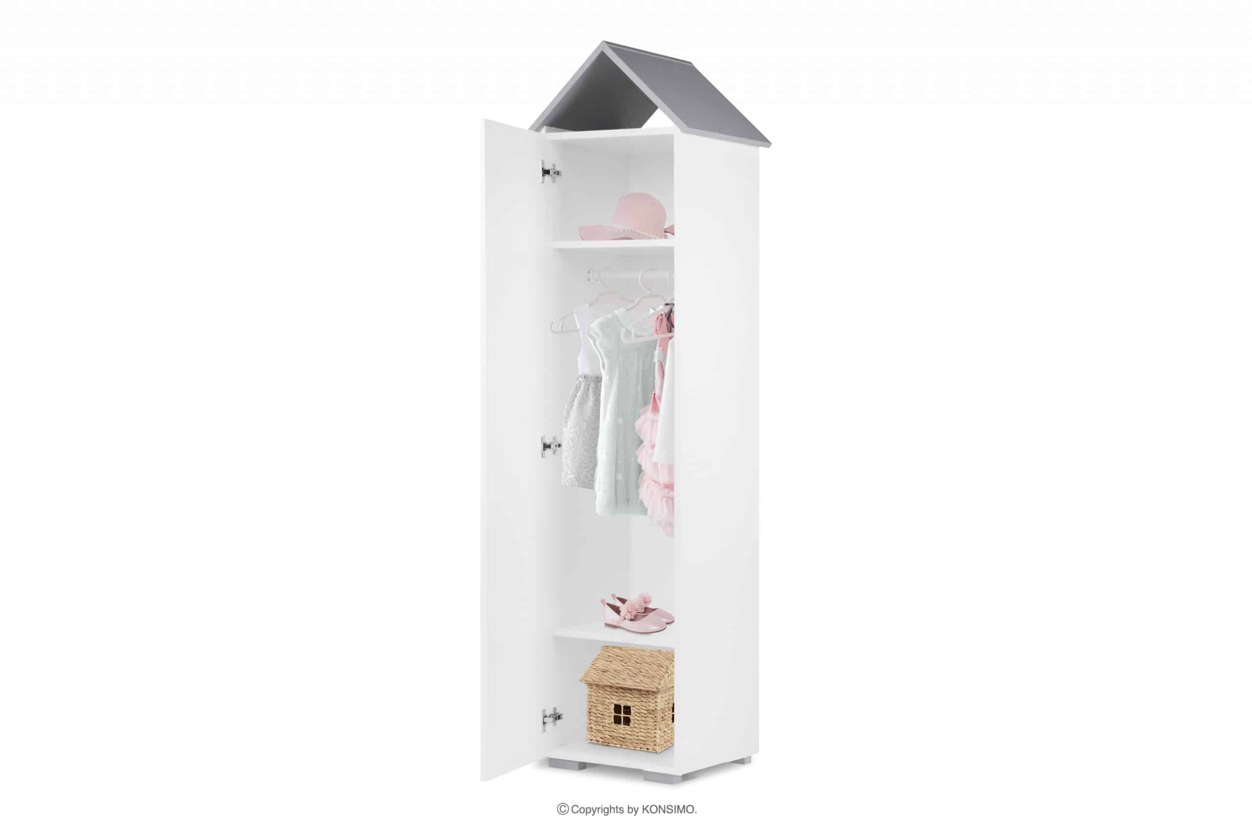 Dobrá organizácia je nevyhnutná, ak chce mať dieťa vo svojej izbe poriadok a poriadok. Biela detská šatníková skriňa PABIS so strieškou je vybavená nielen dvoma priestrannými policami, ale aj tyčou na ramienka. Vďaka tomuto riešeniu sa elegantné oblečenie nebude stláčať a bude vždy po ruke. Odolná konštrukcia so špeciálnym upevnením zadnej steny úspešne odoláva aj veľkému zaťaženiu.