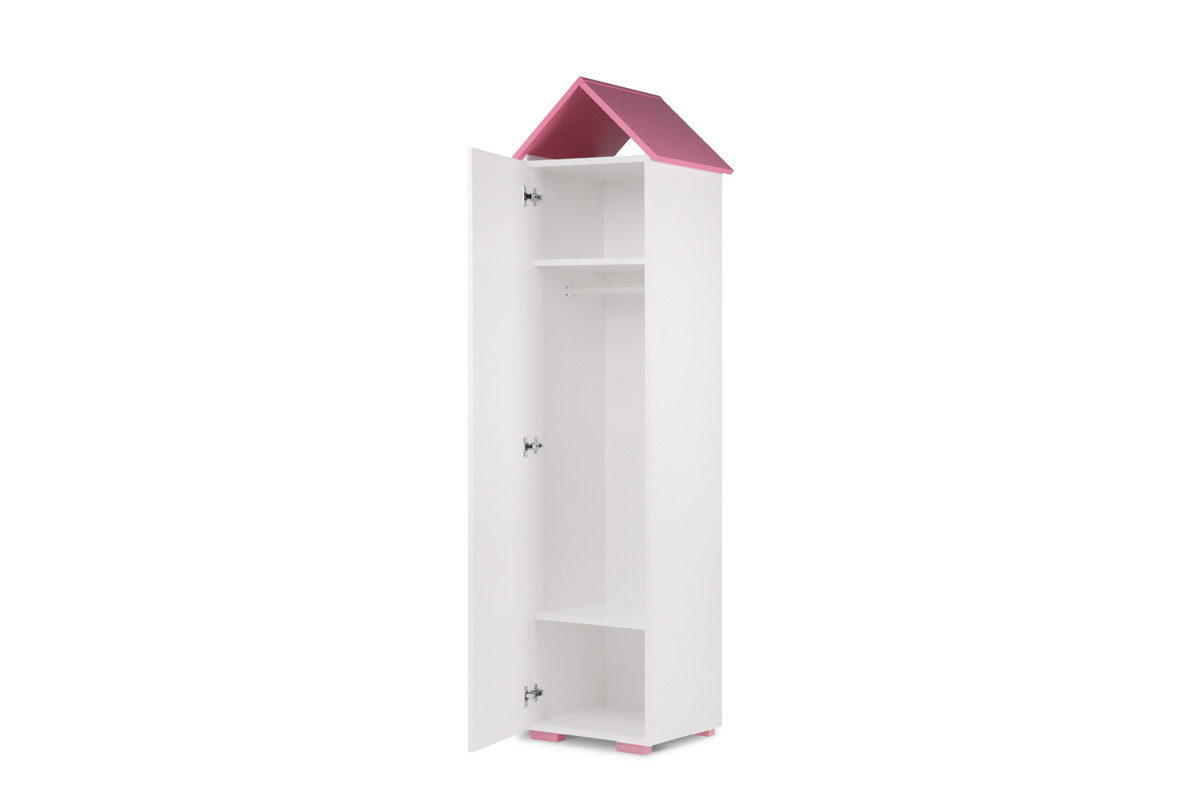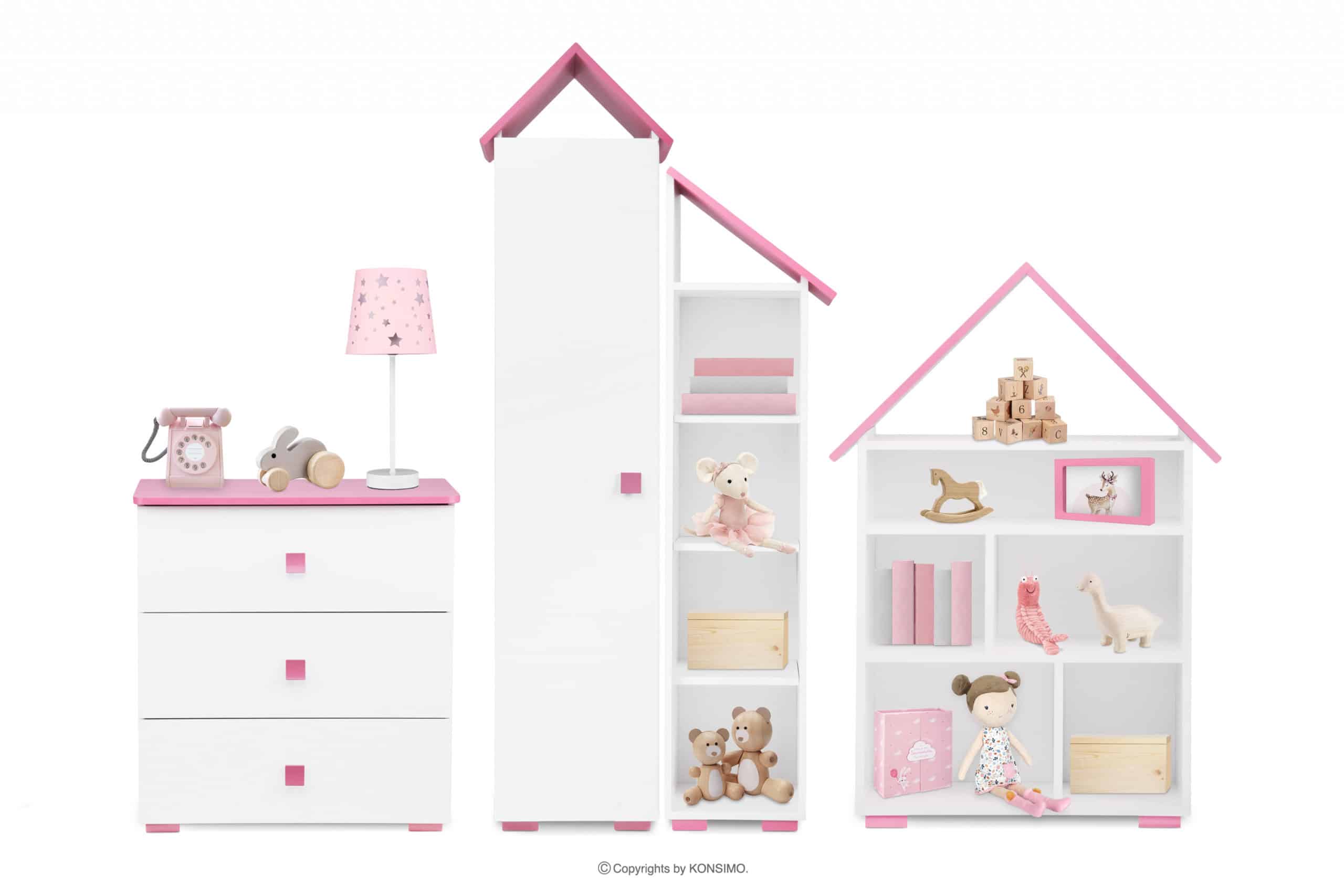 Detský nábytok PABIS, navrhnutý s ohľadom na najmenších užívateľov, je mimoriadne pevný a odolný. Sú vyrobené zo silnej dosky so skosenými hranami - pevné a bezpečné. Dodatočné upevnenie zadných stien zaručuje stabilitu nábytku. Sada obsahuje dve detské knižnice so strieškou, priestrannú komodu a očarujúcu detskú šatníkovú skriňu so strieškou. Celok vytvára rozprávkovú ulicu domčekov v izbičke predškoláka.