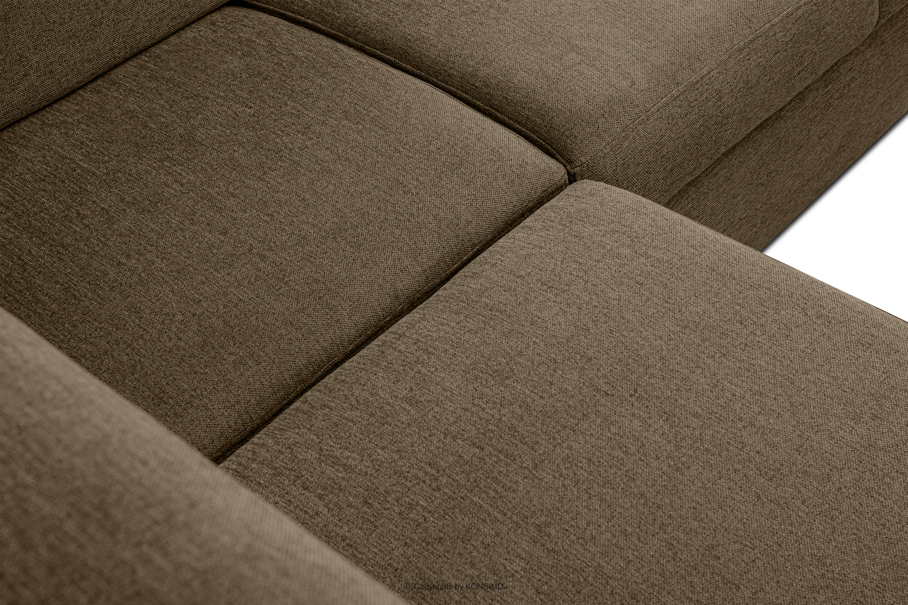 Odolná, ľahko udržiavateľná v čistote, svetlohnedá pravá rohová pohovka s kontajnerom na lôžkoviny, vyrobená z pevných a odolných materiálov, z kolekcie moderného nábytku RATLO je návrhom pre náročných. Ľahko sa rozkladá a je vybavená veľkým boxom, je ideálna do malých bytov. Na dotyk príjemná tkaná látka je mimoriadne odolná voči oderu a poškodeniu.
