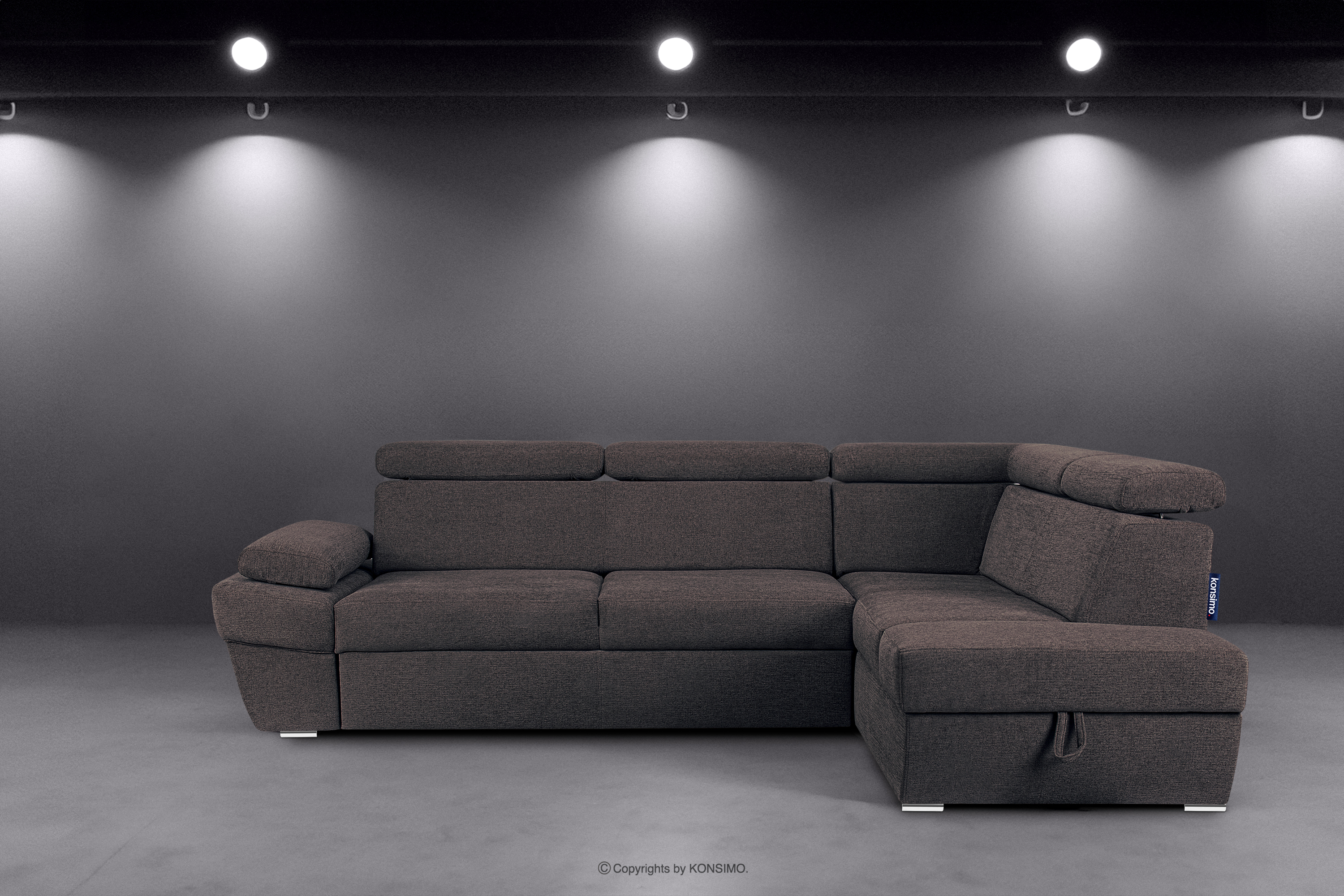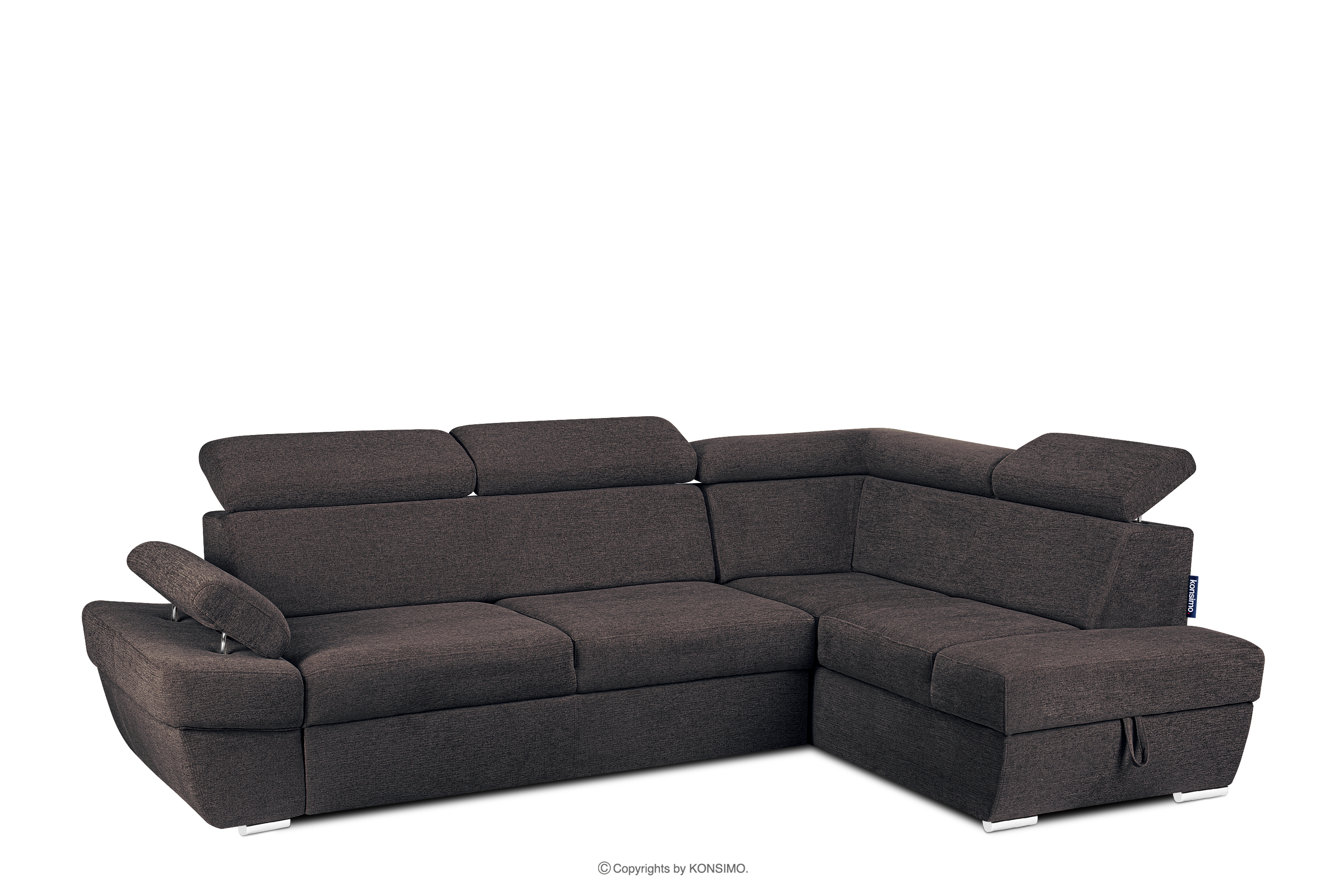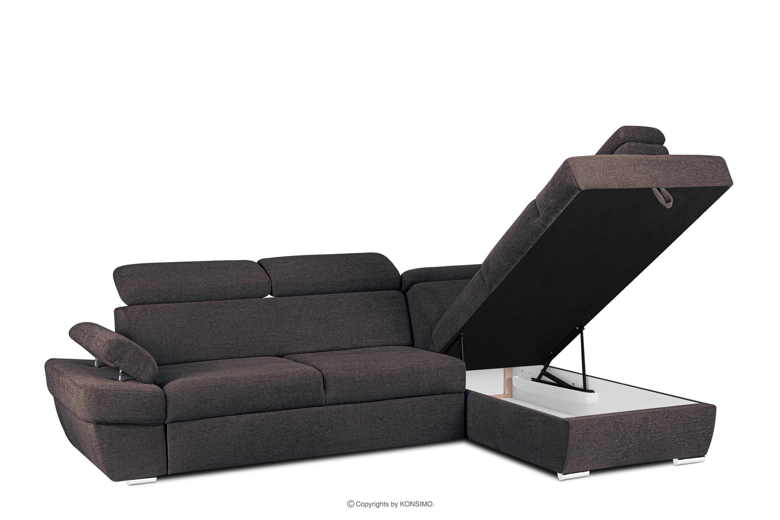 Odolná, ľahko udržiavateľná v čistote, táto tmavomodro-hnedá rozkladacia rohová pohovka s kontajnerom na bielizeň na pravej strane je vyrobená z pevných a odolných materiálov, z kolekcie moderného nábytku RATLO je návrhom pre náročných. Ľahko sa rozkladá a je vybavená veľkým boxom, je ideálna do malých bytov. Na dotyk príjemná tkaná látka je mimoriadne odolná voči oderu a poškodeniu.