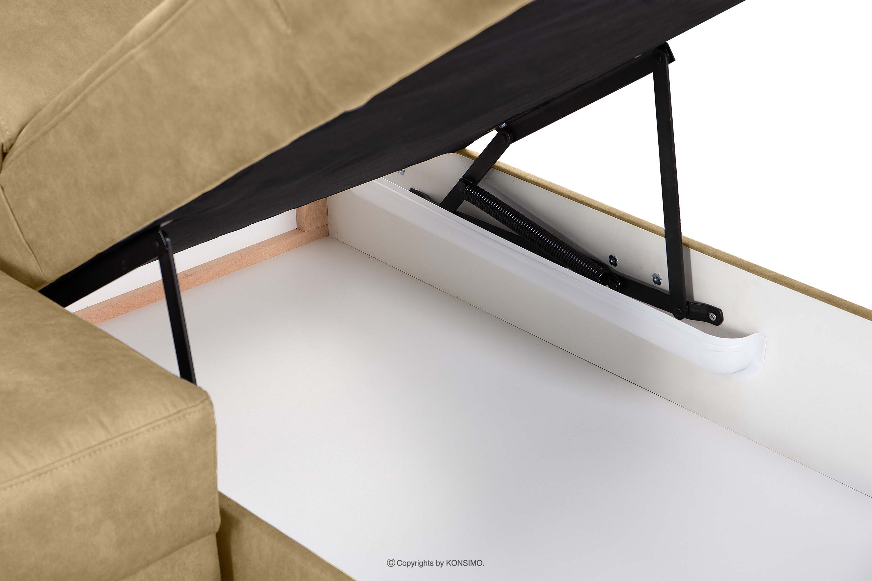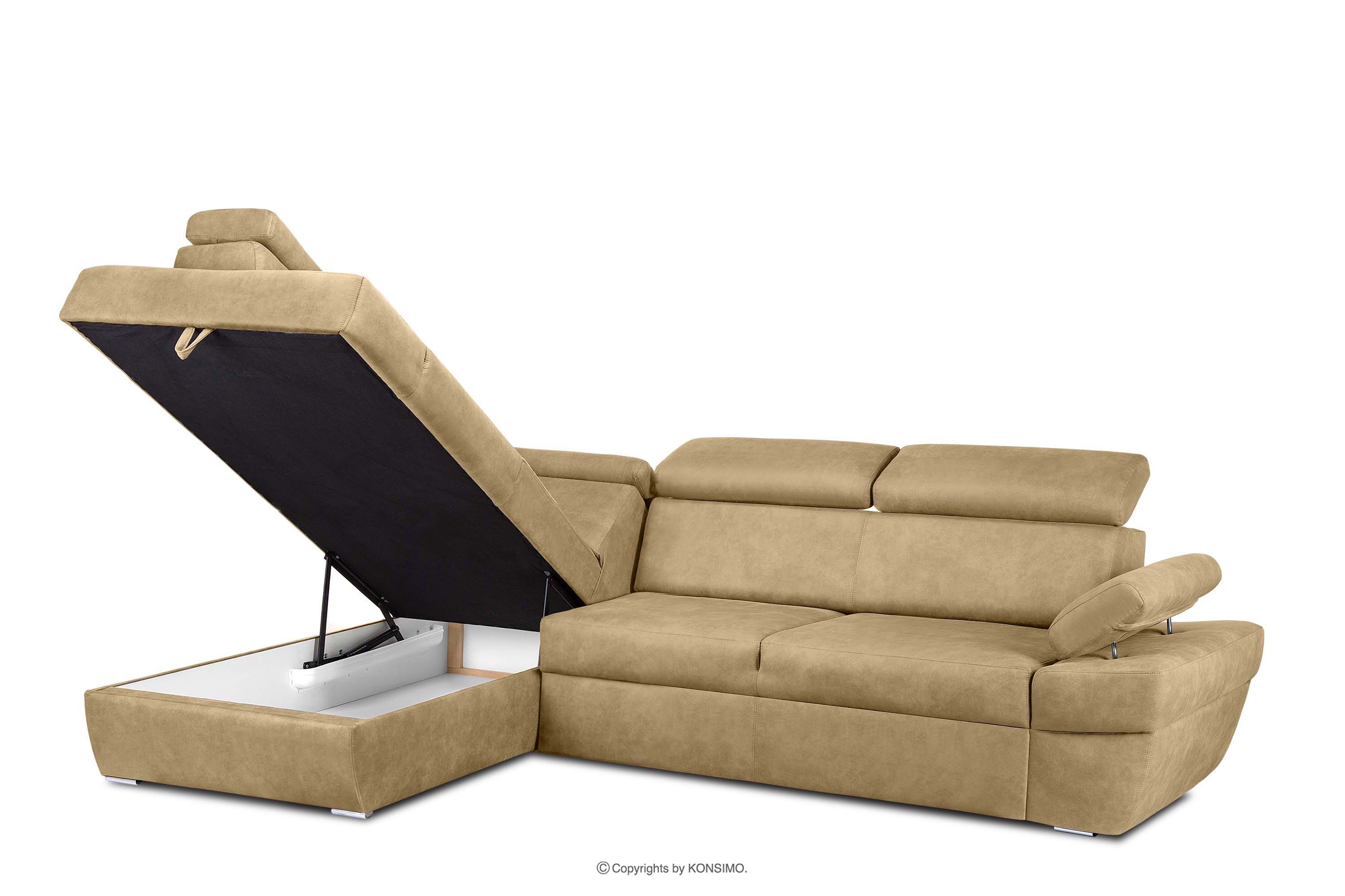 Odolná, ľahko sa udržiava v čistote, vyrobená z pevných a odolných materiálov, rohová pohovka s funkciou spania v látke pripomínajúcej kožu pieskovej farby vľavo z kolekcie moderného nábytku RATLO je návrhom pre náročných. Ľahko sa rozkladá a je vybavená veľkou truhlicou, je ideálna do malých bytov. Čalúnenie z látky pripomínajúcej kožu je mimoriadne odolné voči oderu a poškodeniu.