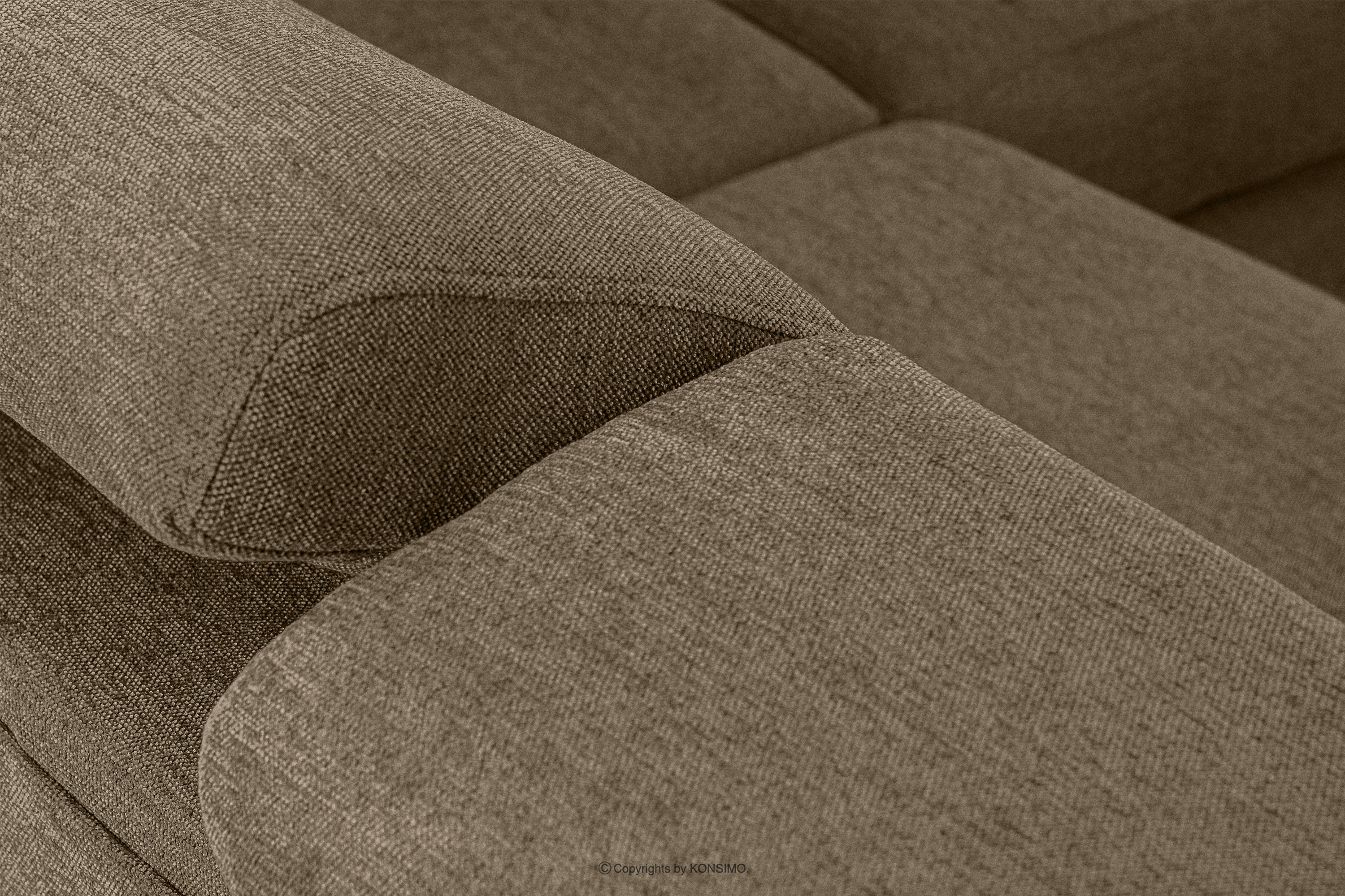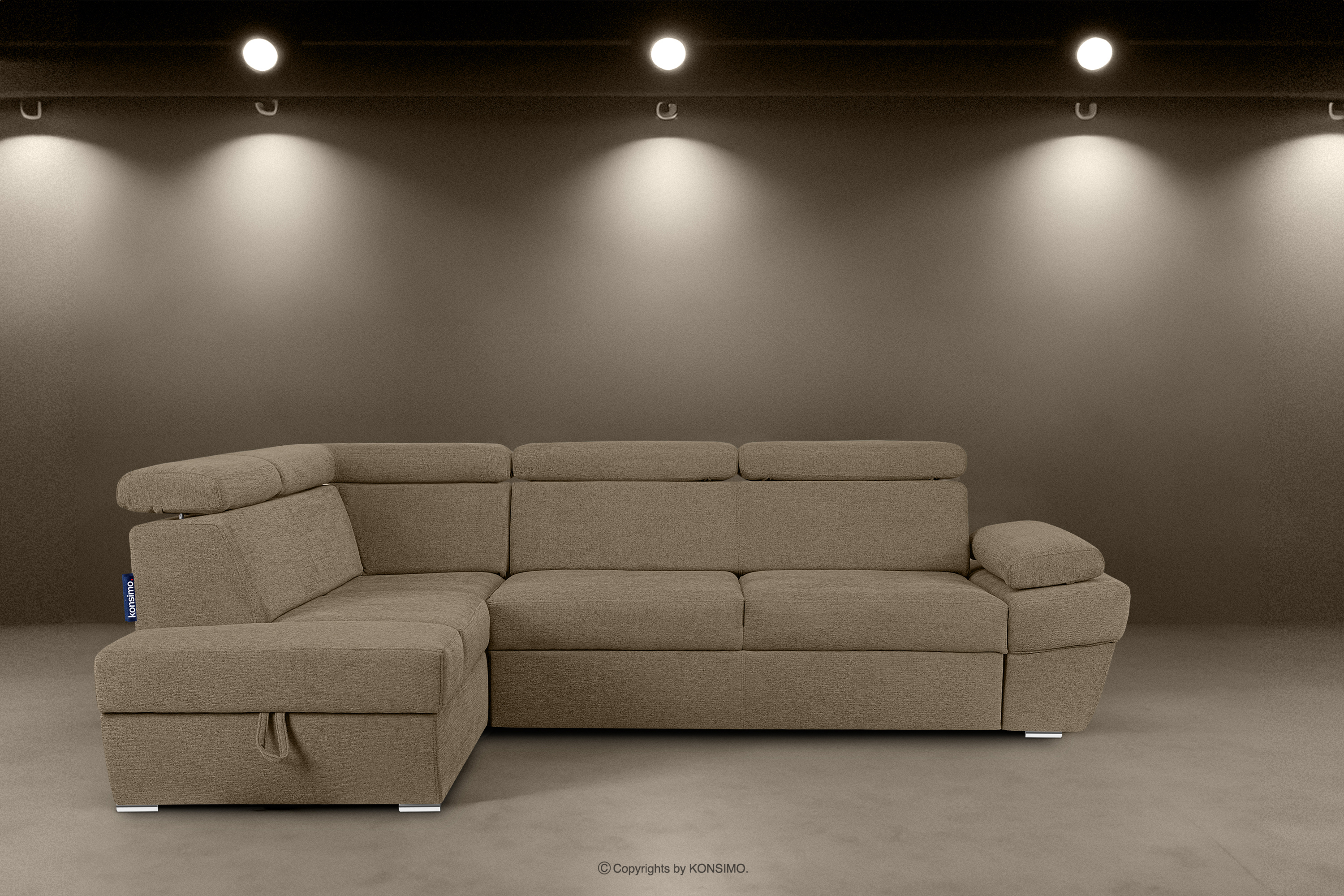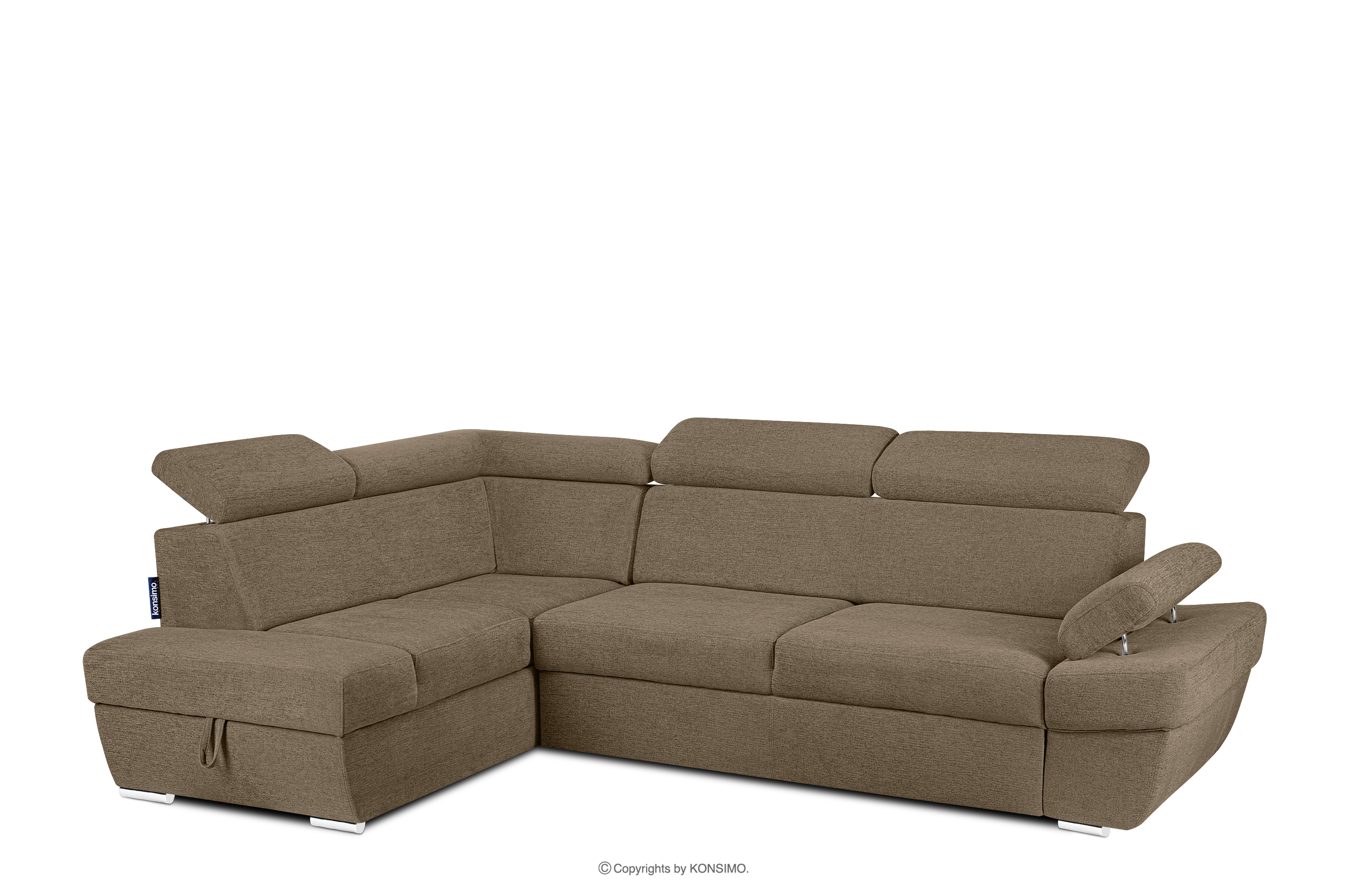 Odolná, ľahko čistiteľná rohová pohovka s funkciou spania a kontajnerom na lôžkoviny svetlohnedej farby vľavo, vyrobená z pevných a odolných materiálov, z kolekcie moderného nábytku RATLO je návrhom pre náročných. Ľahko sa rozkladá a je vybavená veľkou truhlicou, je ideálna do malých bytov. Na dotyk príjemná tkaná látka je mimoriadne odolná voči oderu a poškodeniu.