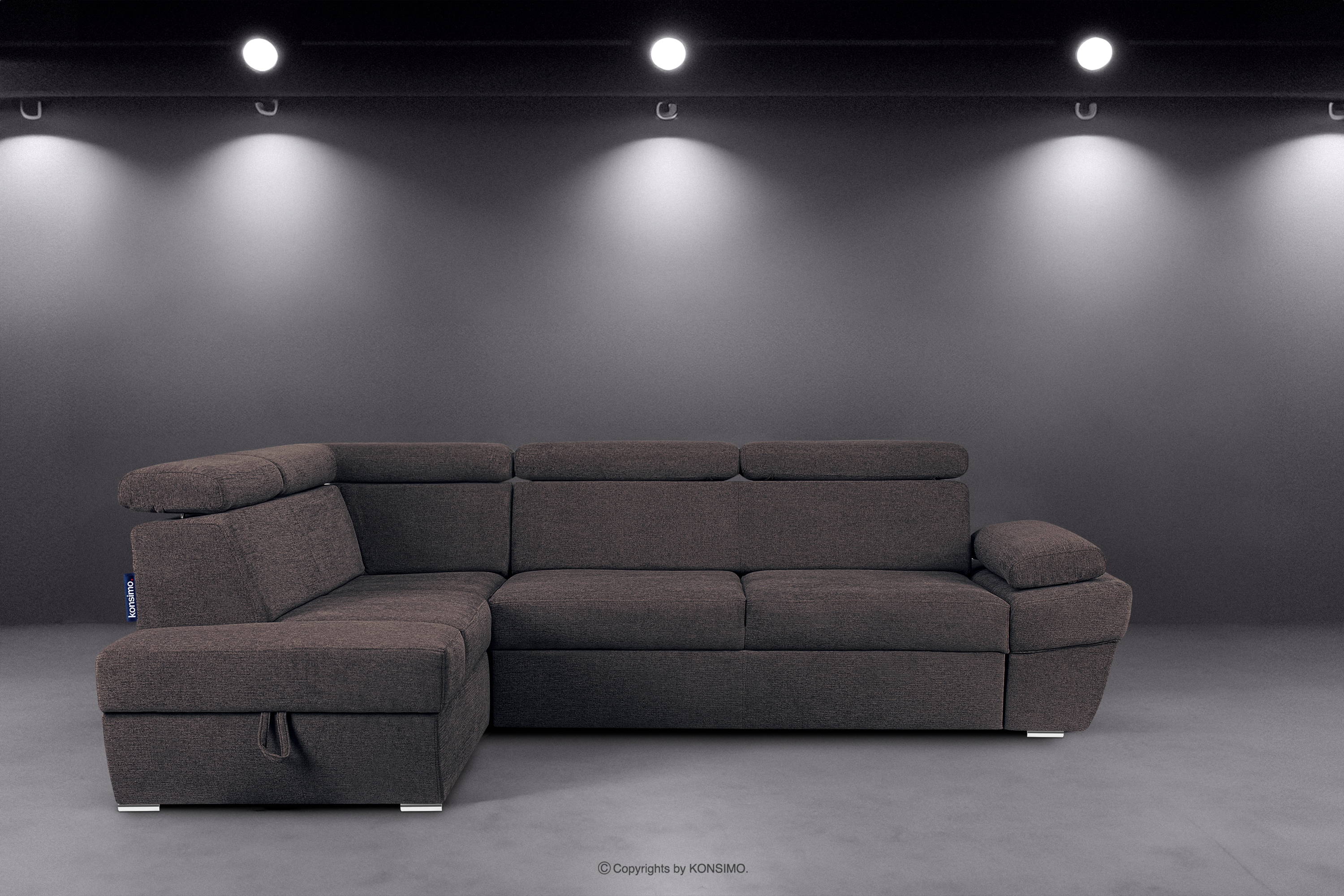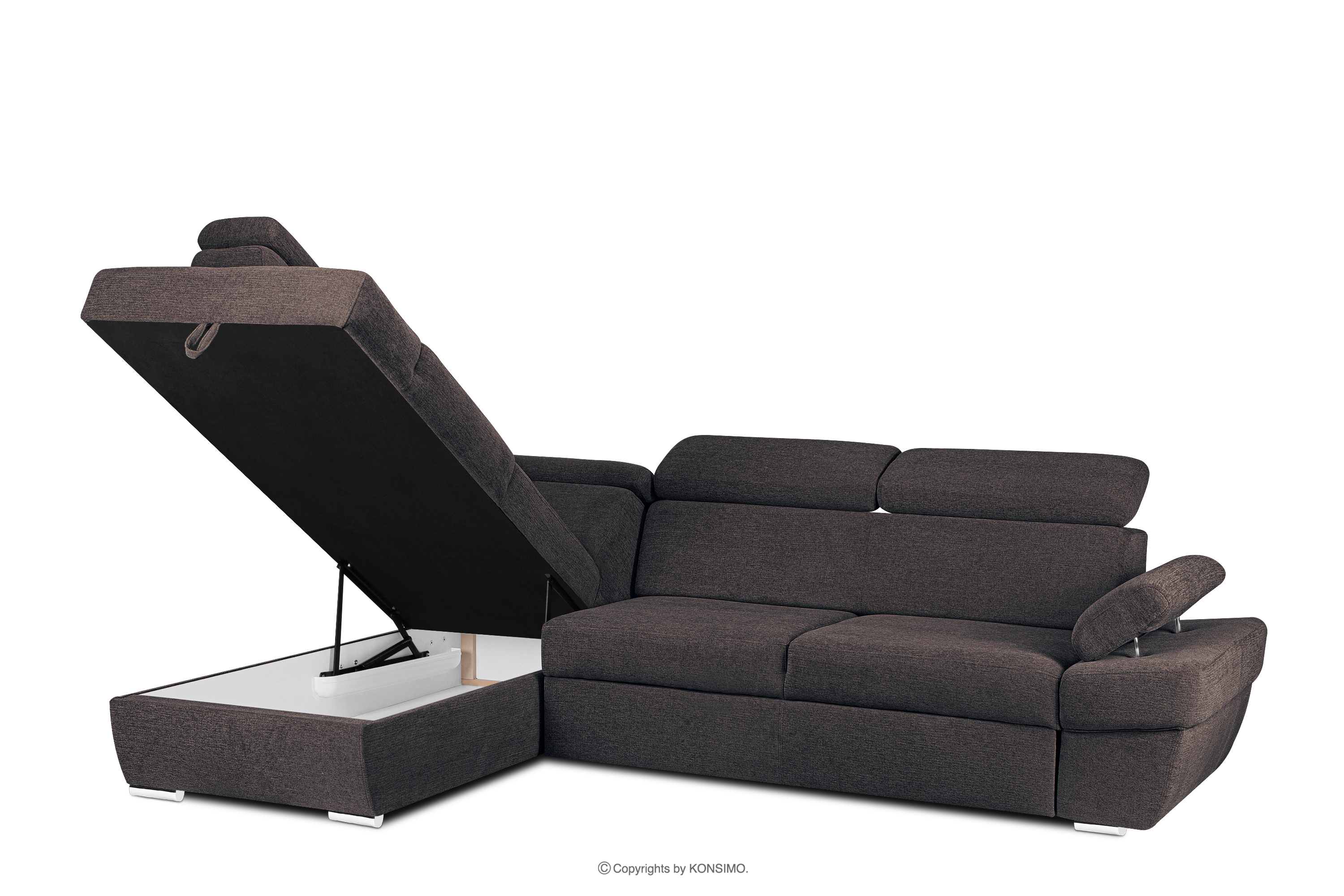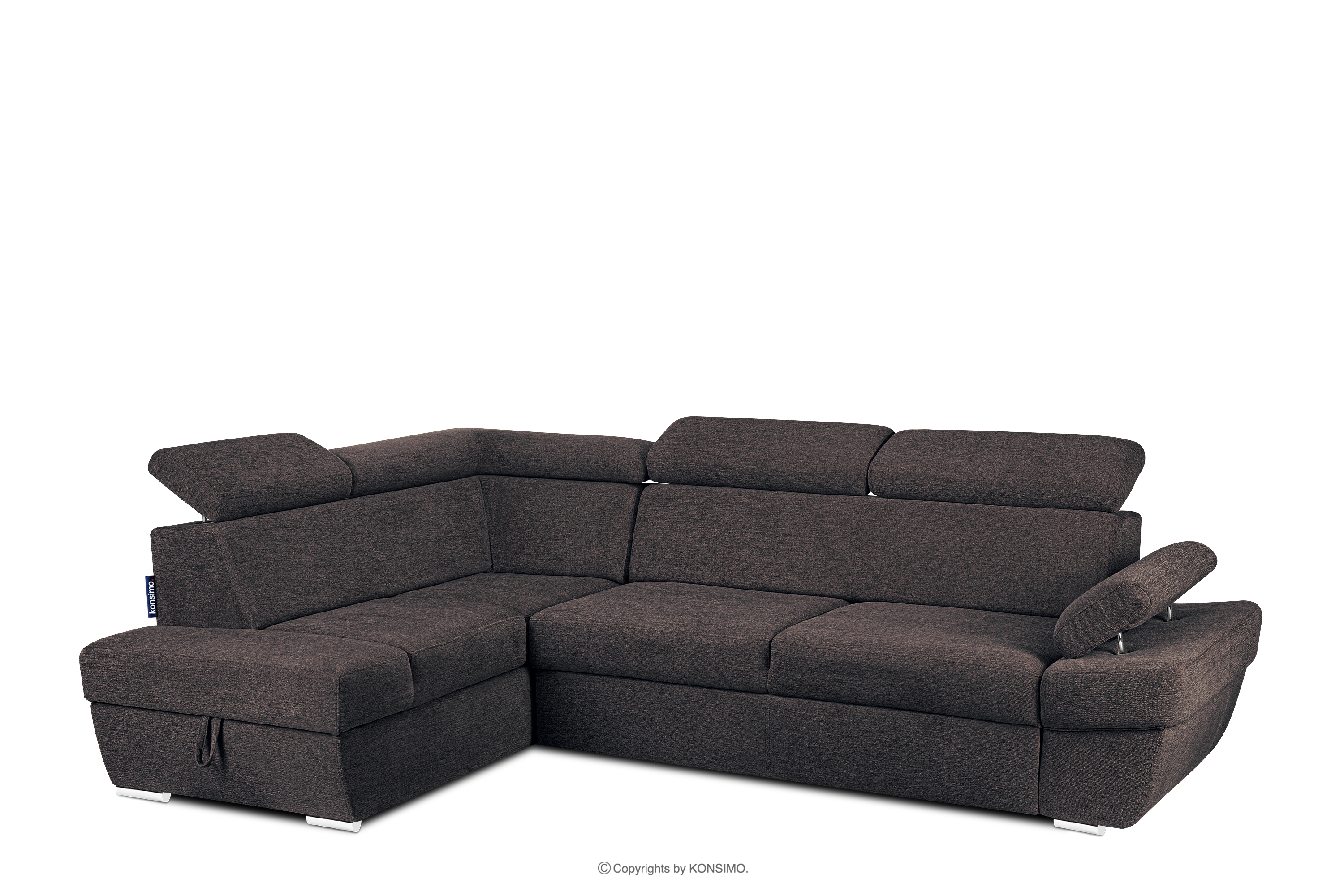 produktu Rohová pohovka s funkciou spania a kontajnerom na posteľnú bielizeň tmavomodrá/hnedá vľavo