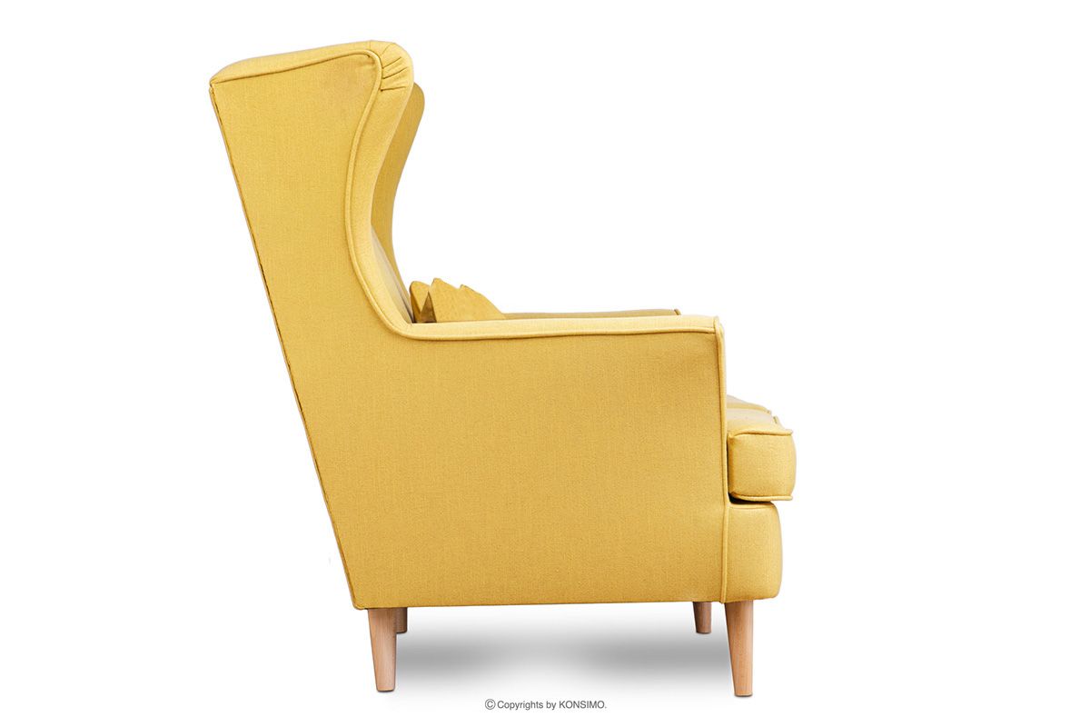 Výnimočne pohodlná, pevná škandinávska dvojpohovka žltá na nožičkách z kolekcie klasického nábytku STRALIS sa osvedčí v domácich interiéroch, ako aj v hoteloch či reštauráciách. Komfort používania zvyšuje na dotyk príjemné, kvalitné čalúnenie z odolnej tkanej látky. Stabilnú konštrukciu podopierajú nohy z masívneho dreva. Stredne tvrdé sedadlo a optimálne tvarované mäkké operadlo a boky sú zárukou relaxu a vynikajúceho odpočinku každý deň.