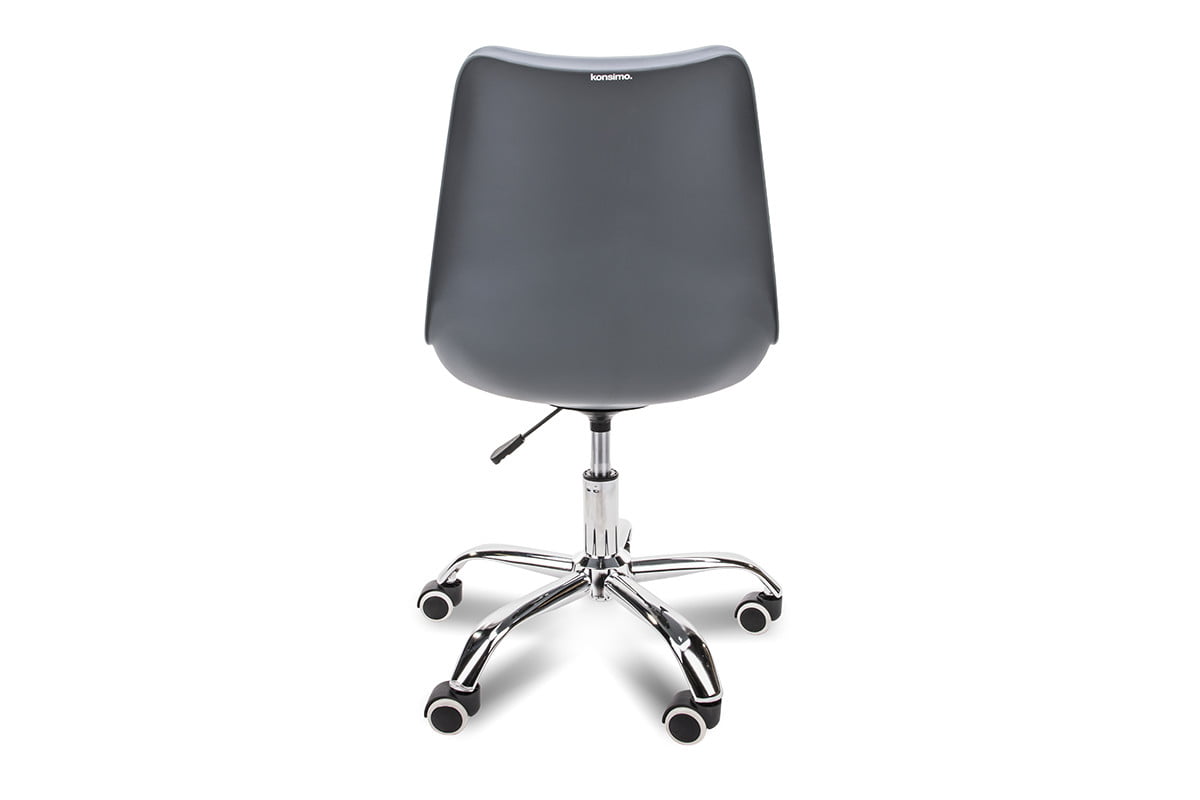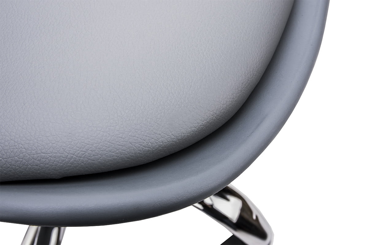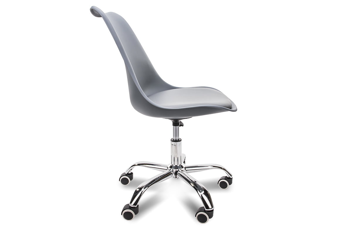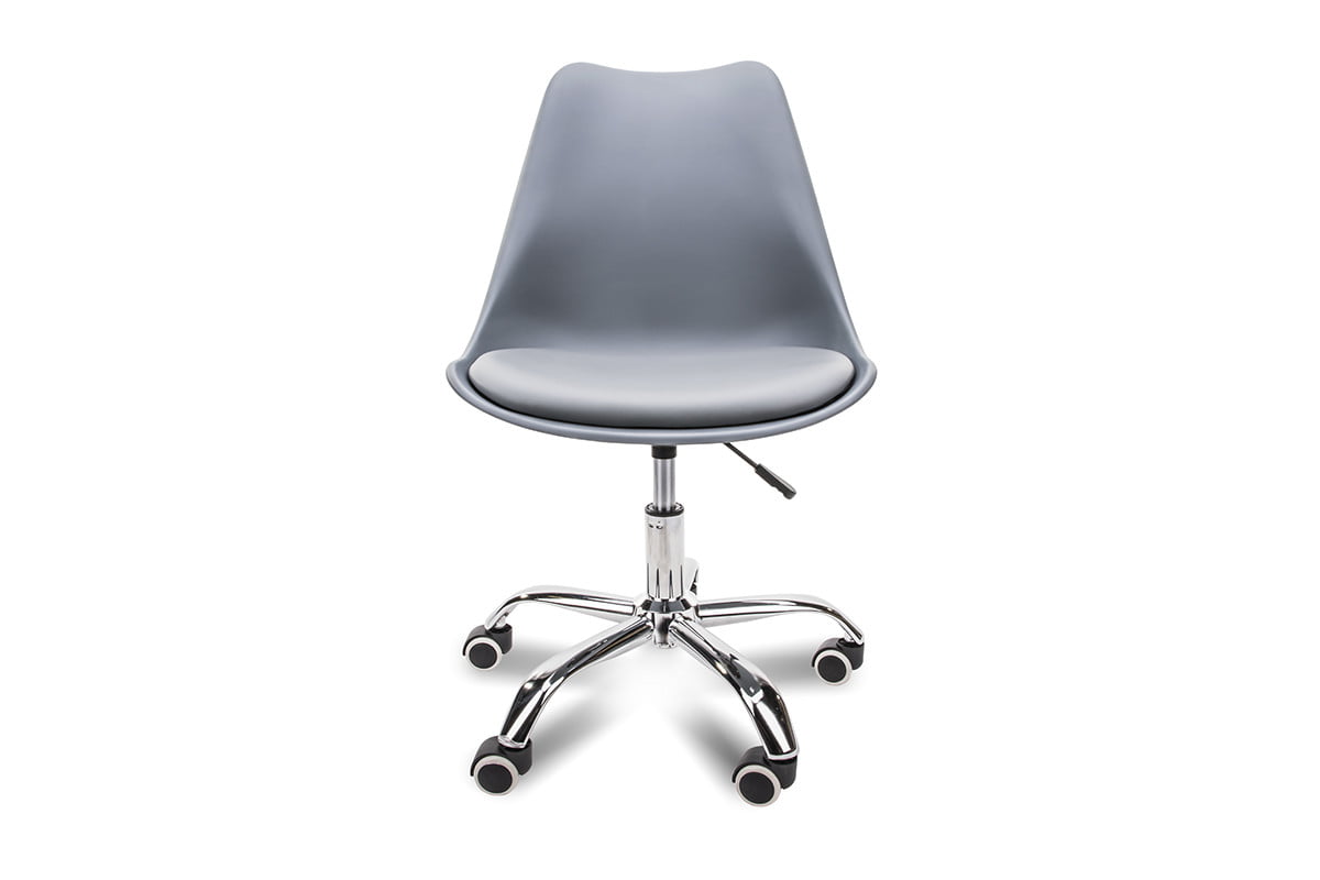 Extrémne funkčná a krásna šedá otočná stolička ideálna do modernej kancelárie, pracovne alebo izby pre mládež. Odolná kovová konštrukcia zaručuje dobrú stabilitu a pevný otočný mechanizmus zatraktívnia prácu pri stole. Malé kolieska na konci päťhviezdičkovej základne sú v bezpečí na podlahe. Sedačka je potiahnutá ekokožou, vďaka čomu vyzerá veľmi štýlovo a je veľmi príjemná na dotyk.