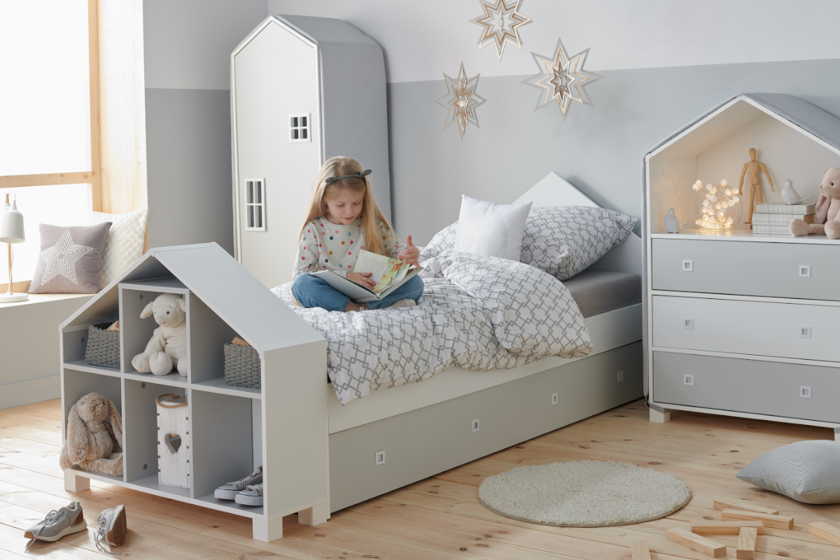 MIRUM Objav celú kolekciu Knižnica domček so šuplíkom pre chlapca, šedá- farba bílá/šedá
