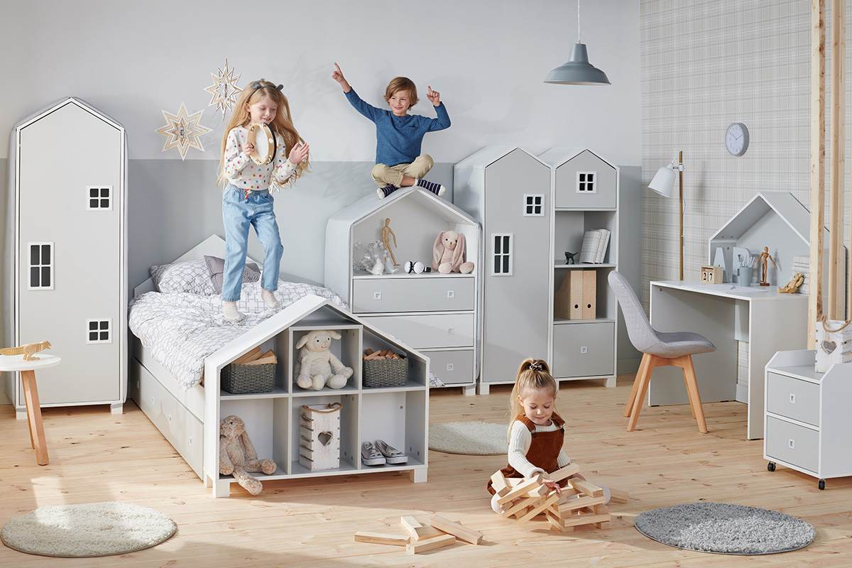 MIRUM Objav celú kolekciu Detská šatníková skriňa domček s policami šedá- farba bílá/šedá