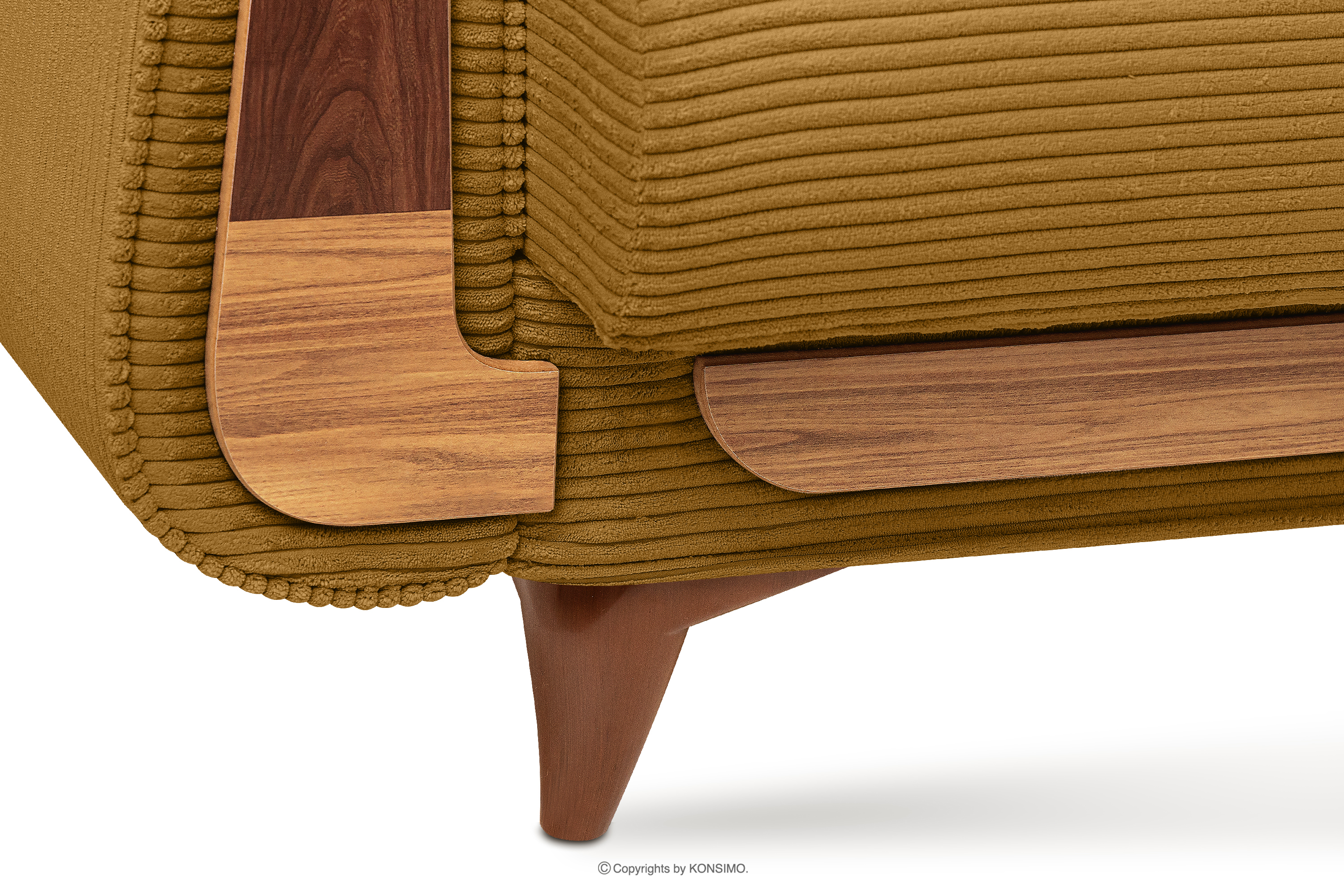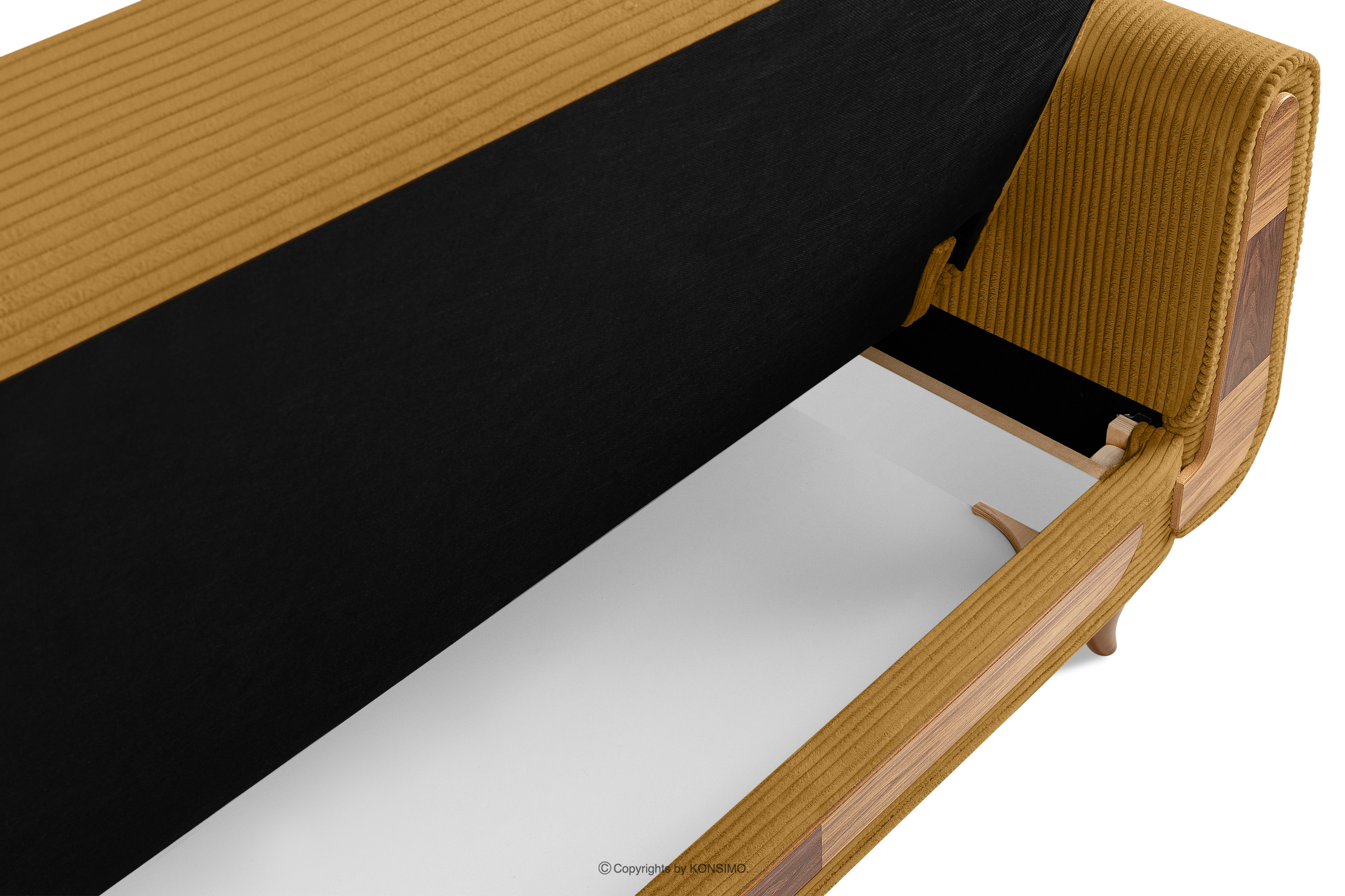 Trojmiestna rozkladacia pohovka v manšestrovej žltej látke je kus nábytku vo vintage štýle. Bola vyrobená tak, aby spĺňala tie najvyššie očakávania. Svoje dokonalé miesto si nájde aj v elegantných a loftových izbách. Látka použitá na čalúnenie pohovky je veľmi príjemná na dotyk a ľahko sa čistí. Veľkou výhodou je aj funkcia spania a nádoba na uloženie posteľnej bielizne, ktorá rozhodne uľahčuje udržiavanie poriadku.