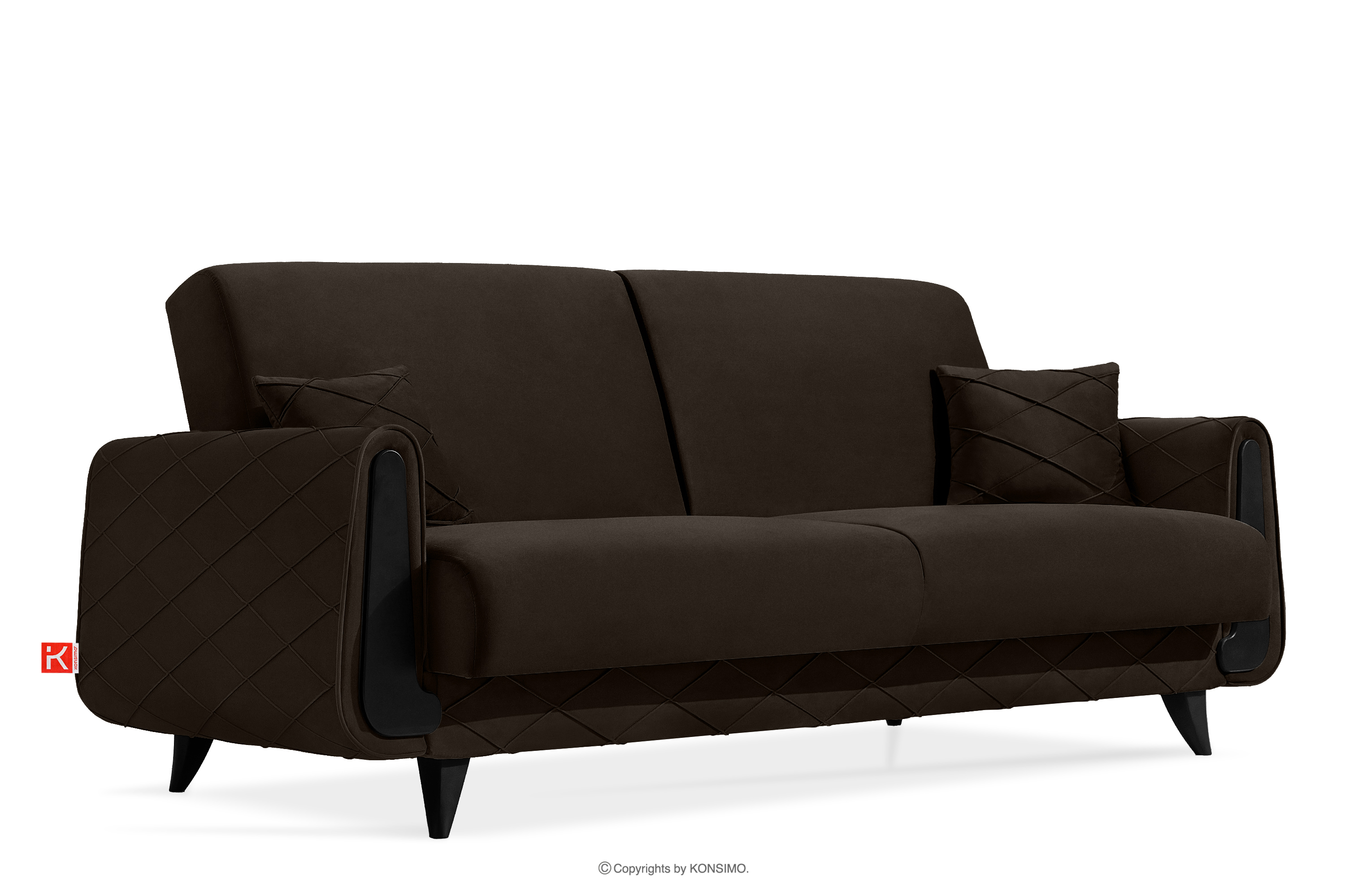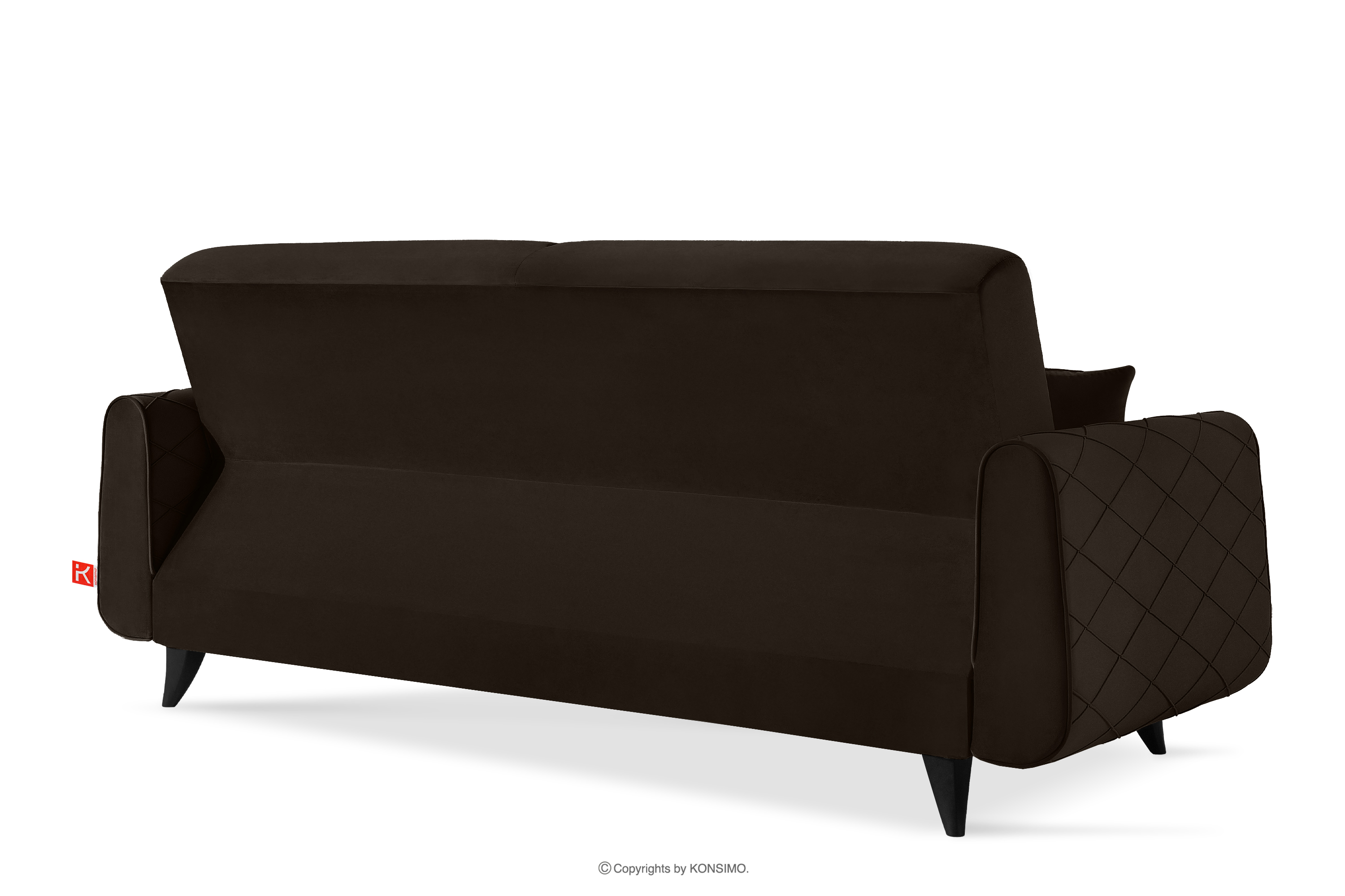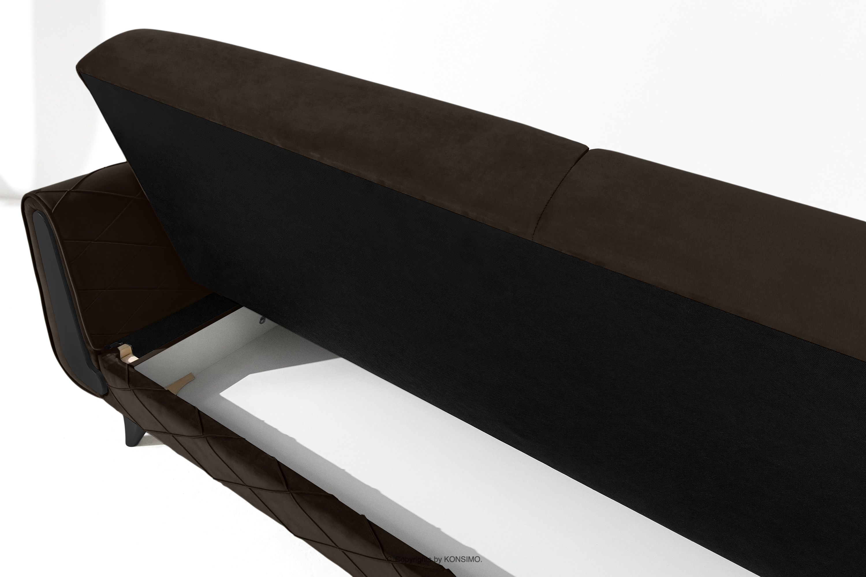 Elegantná hnedá velúrová pohovka je kus nábytku vo vintage štýle. Bola vyrobená tak, aby spĺňala tie najvyššie očakávania. Svoje dokonalé miesto si nájde aj v elegantných a loftových izbách. Látka použitá na čalúnenie pohovky je veľmi príjemná na dotyk a ľahko sa čistí. Veľkou výhodou je aj funkcia spania a nádoba na uloženie posteľnej bielizne, ktorá rozhodne uľahčuje udržiavanie poriadku.