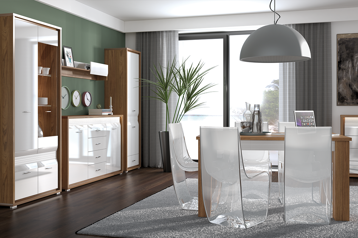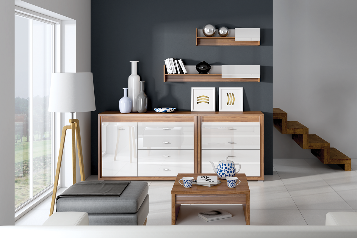 Nábytok využíva ABS hrany, ktoré sú nielen odolné voči nepriaznivým vonkajším faktorom, ale sú aj ekologické. Nábytok je vybavený chrómovými úchytkami a nožičkami, čo im dodáva exkluzívny vzhľad. Táto kolekcia zaujme zaujímavým kontrastom čiel v bielom lesku a korpuse vo farbe prírodného orecha. SULA je nábytok vyrobený z kvalitných materiálov, ktorý určite obohatí váš interiér. Kombinujú odolnosť a estetický vzhľad.