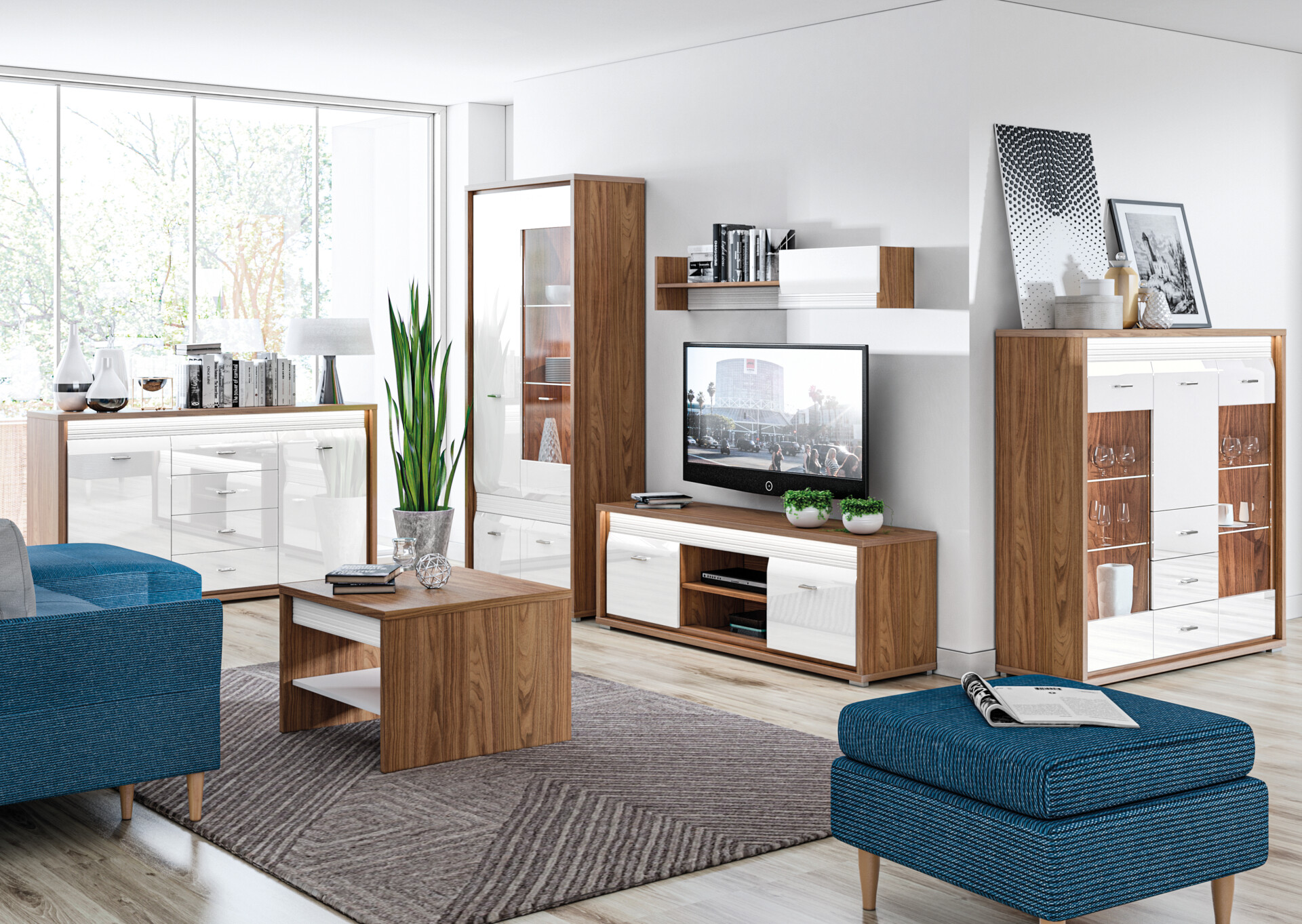 Voliteľné LED osvetlenie 11067.17.147 - 1-žiarovka11067.18.400 - 1-žiarovka11067.19.147 - 2-žiarovka11067.20.147 - 3-žiarovka11067.21.100 - originálne napájanie 1 Je vybavená netradičným dekorom dostupným v dvoch farebných variantoch - biela a prírodný orech. Laminovaná MDF doska, z ktorej je tento nábytok vyrobený, je neštandardne hrubá - 28 mm, čo im dodáva mimoriadnu odolnosť. Vyznačuje sa tiež odolnosťou voči trvalému znečisteniu, zmene farby alebo poškriabaniu.