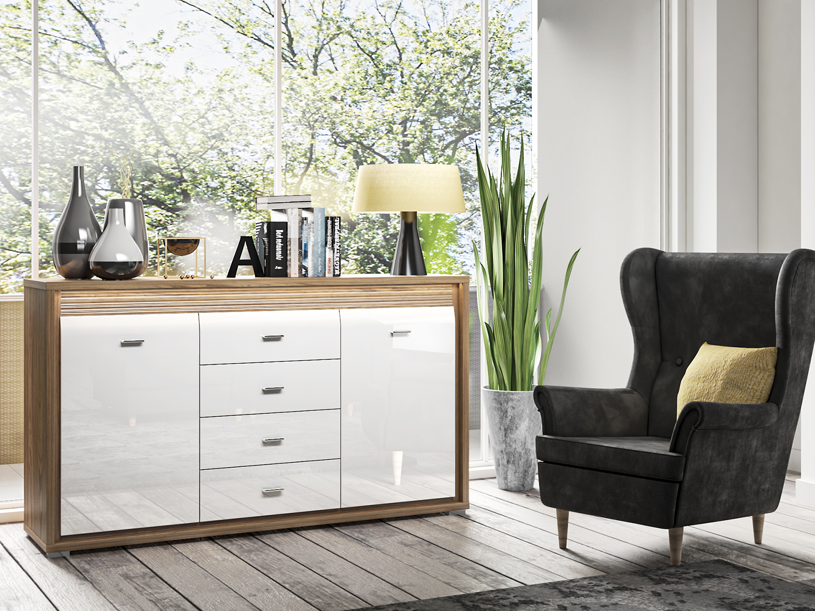 Nábytok využíva ABS hrany, ktoré sú nielen odolné voči nepriaznivým vonkajším faktorom, ale sú aj ekologické. Nábytok je vybavený chrómovými úchytkami a nožičkami, čo im dodáva exkluzívny vzhľad. Táto kolekcia zaujme zaujímavým kontrastom čiel v bielom lesku a korpuse vo farbe prírodného orecha. SULA je nábytok vyrobený z kvalitných materiálov, ktorý určite obohatí váš interiér. Kombinujú odolnosť a estetický vzhľad.