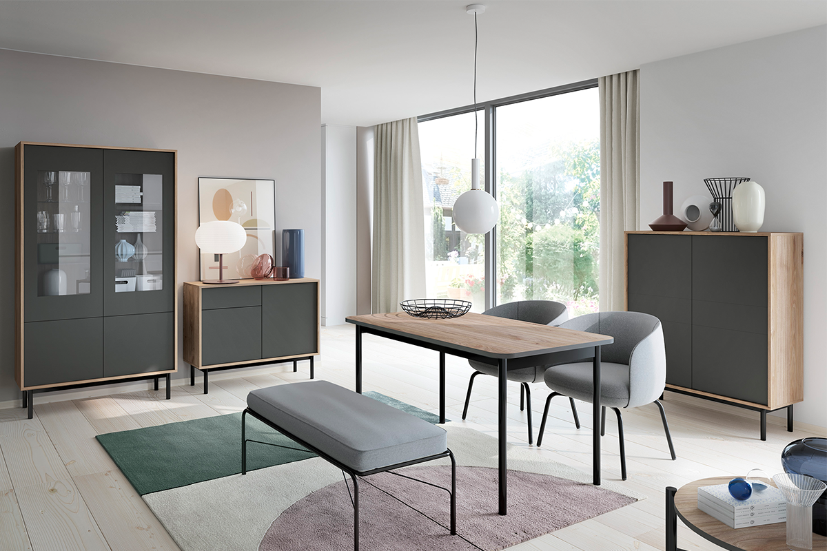 Moderný nábytok sa vyznačuje odolnosťou a životnosťou po mnoho rokov Moderná farebná kombinácia: čierna a imitácia prírodného dreva sa skvele hodí do miestností, ktoré sú zariadené v modernom štýle. Priestranný bytový nábytok z kolekcie VARIA je kombináciou moderného štýlu a praktických riešení interiérového designu. Tmavé čelá dodávajú interiéru hĺbku. Zaujímavý kontrast tvoria korpusy, ktoré sú vedené vo farbe prírodného dubového dreva.