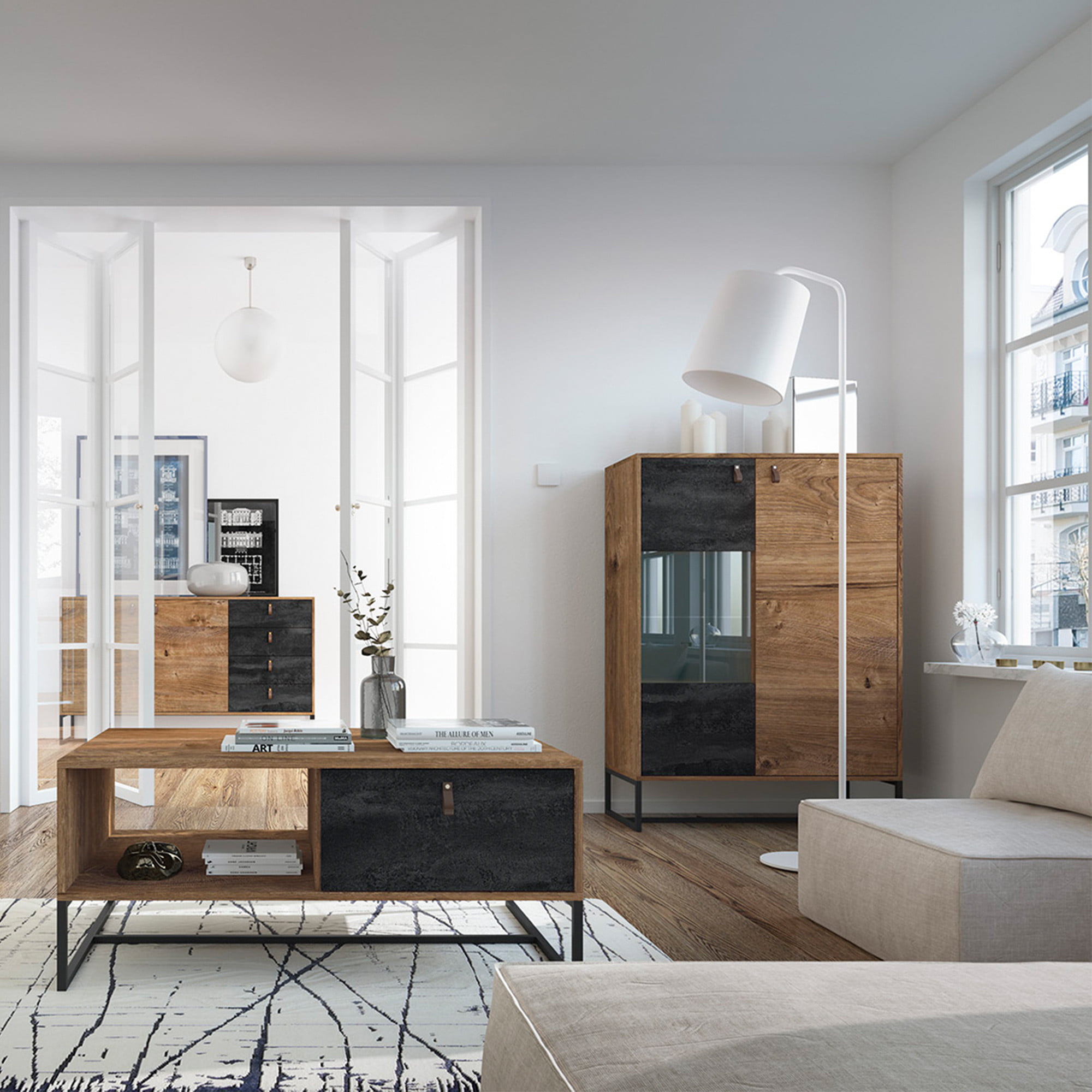 Voliteľné LED osvetlenie 11087.08.147 Dubová komoda z kolekcie RUGO kombinuje rovnováhu dreva a čiernej, lomená predným tvrdeným sklom. Transparentný prvok prináša novú kvalitu a charakter, vďaka čomu je kus nábytku atraktívnejší a jedinečný. Použitie vitríny je ideálne na vystavenie skla alebo rodinných pamiatok. Celok je možné dodatočne umocniť LED osvetlením, ktoré rozžiari interiér a je príjemnou ozdobou miestnosti.
