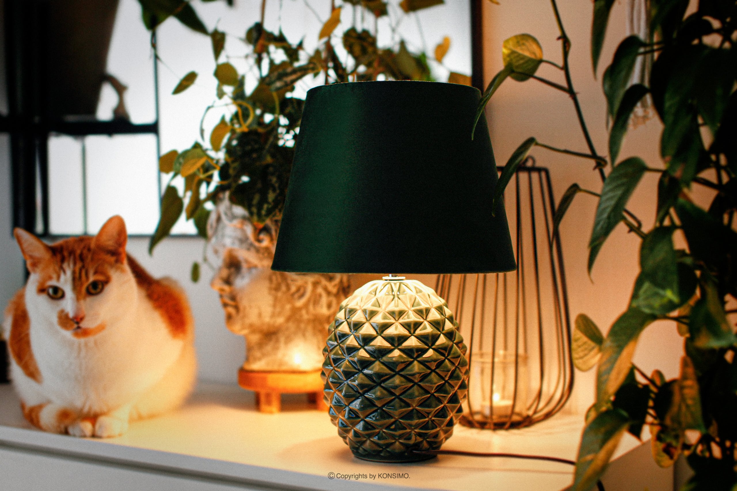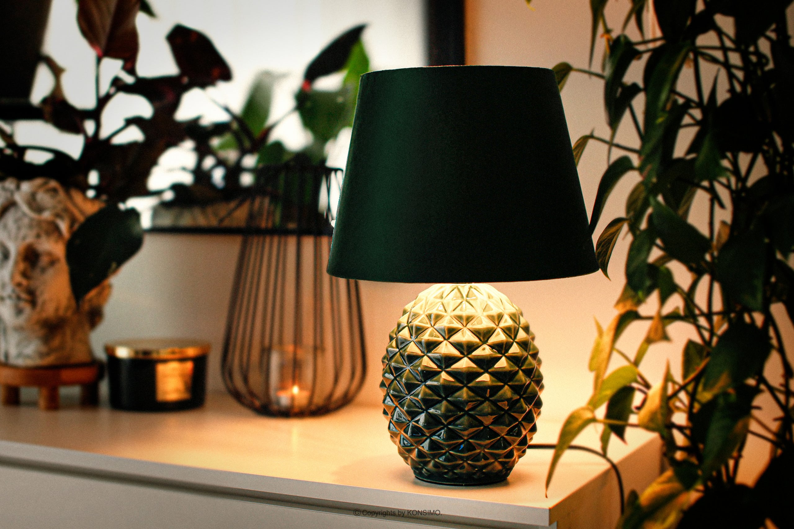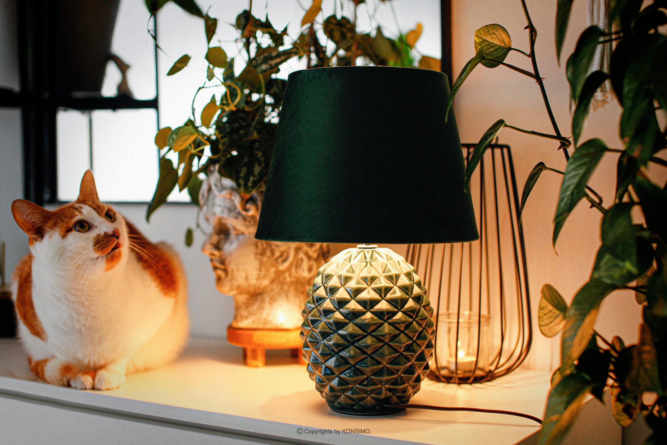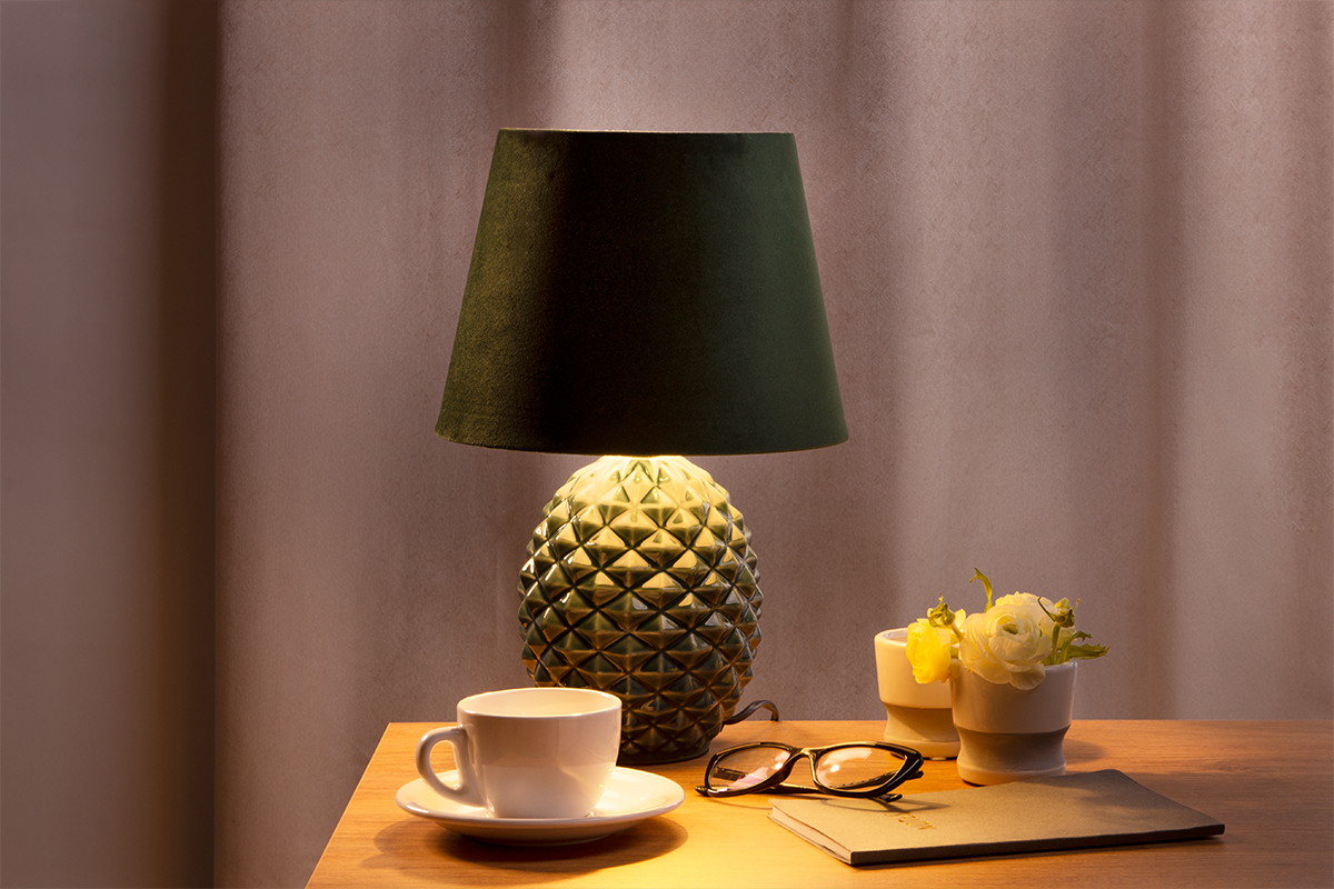 Zelená stolná lampa je elegantným a štýlovým doplnkom vášho interiéru. Stolová lampa FRUCTU má dekoratívnu základňu z keramiky. Je veľmi elegantný a krásne dozdobí priestor v obývacej izbe, spálni alebo predsieni. Farba fľaškovo zelená sa bude hodiť do mnohých interiérov, napríklad v modernom, loftovom a elegantnom štýle.