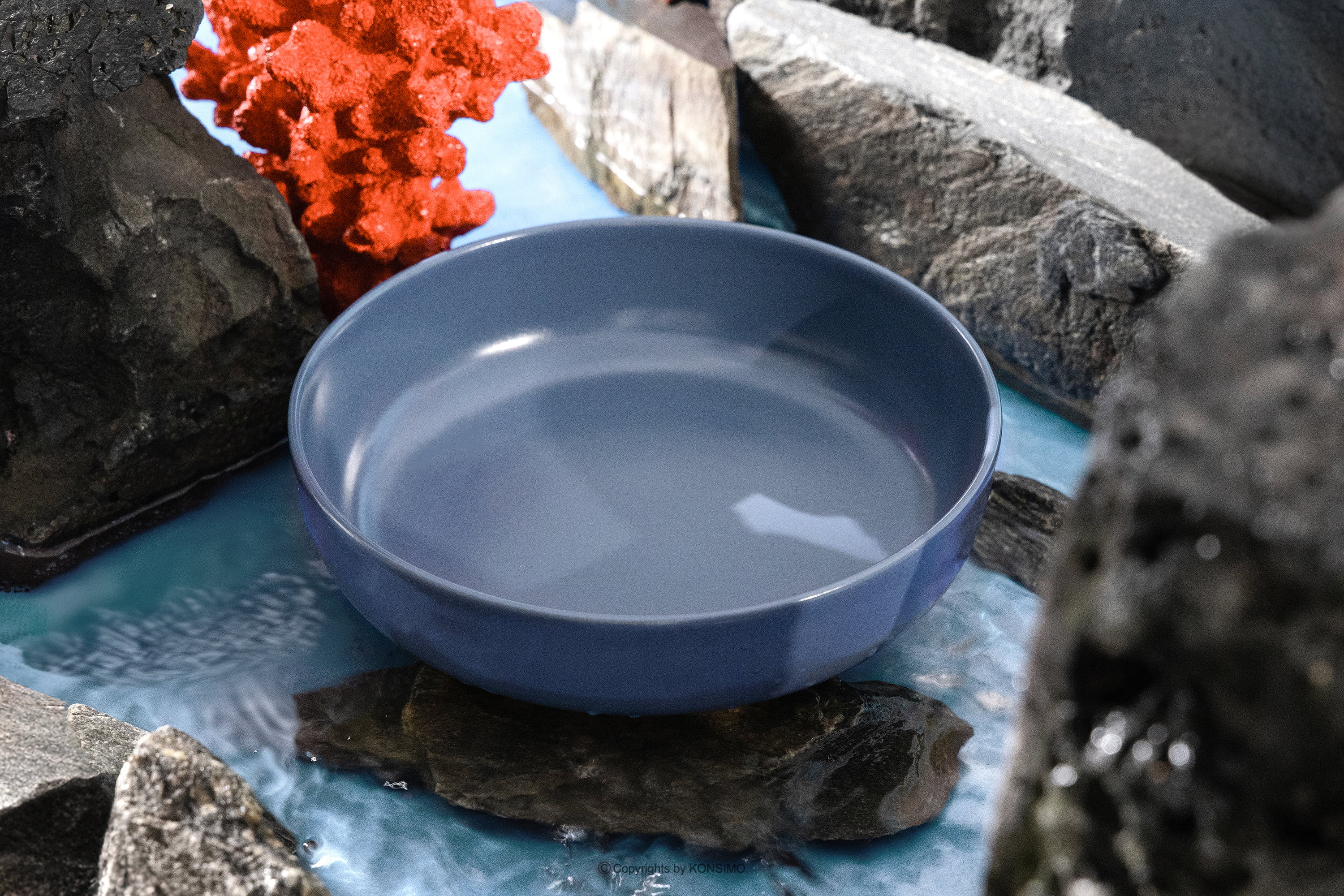 Modrá jedálenská súprava 6os. (18 el.) vyrobená z keramiky najvyššej kvality upúta pozornosť svojou mimoriadnou eleganciou a nespornou odolnosťou voči akémukoľvek prípadnému poškodeniu. Matná povrchová úprava a minimalistické oblé tvary jej dodávajú jedinečný charakter, vďaka čomu sa dokonale hodí do moderných loftových interiérov aj tradičných jedálenských aranžmánov. Vďaka tejto nezvyčajnej kombinácii štýlu a funkčnosti je táto súprava dokonalou voľbou pre elegantný stôl pri slávnostných príležitostiach aj pri každodennom používaní, kde podčiarkuje výnimočný vkus a životný štýl.
