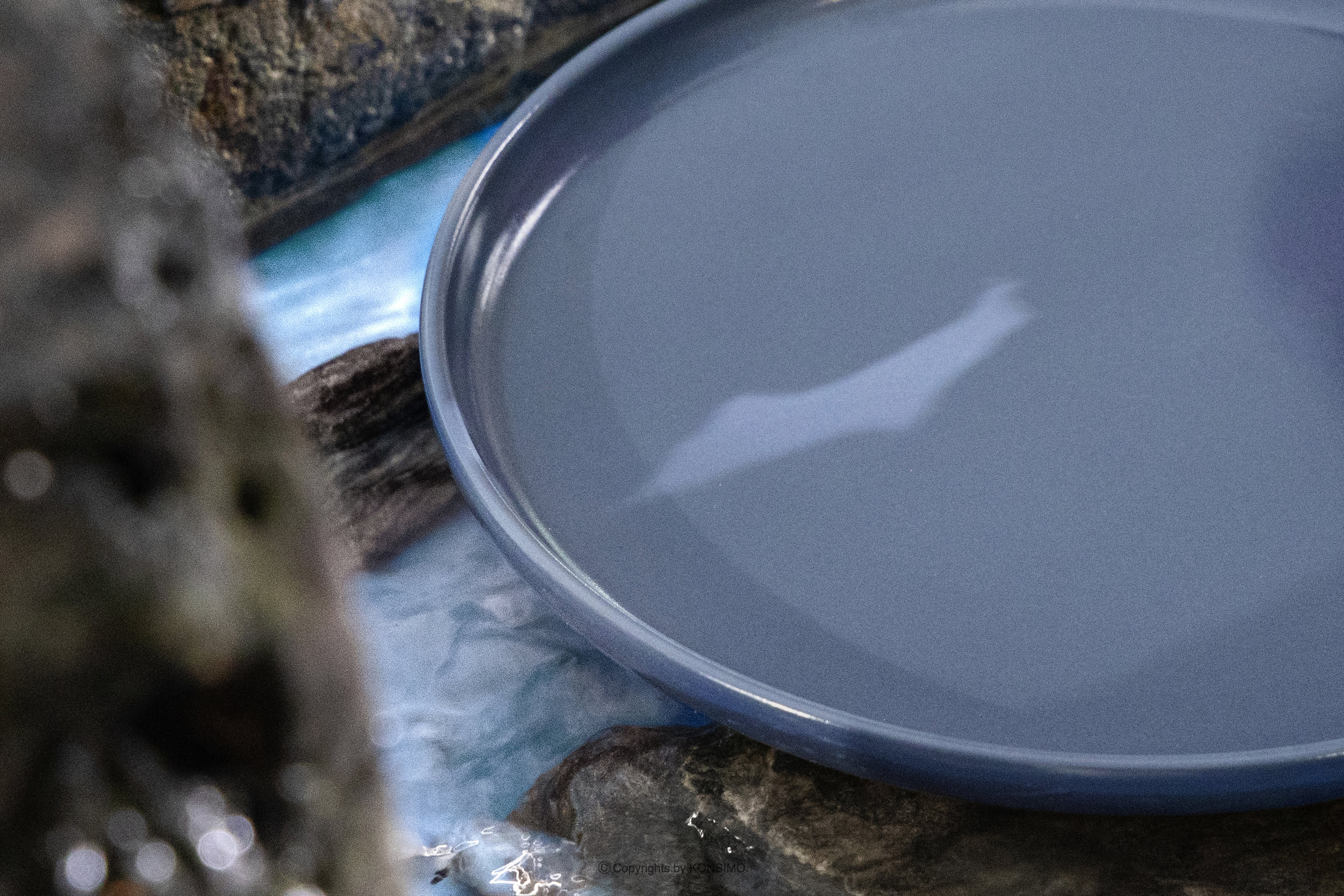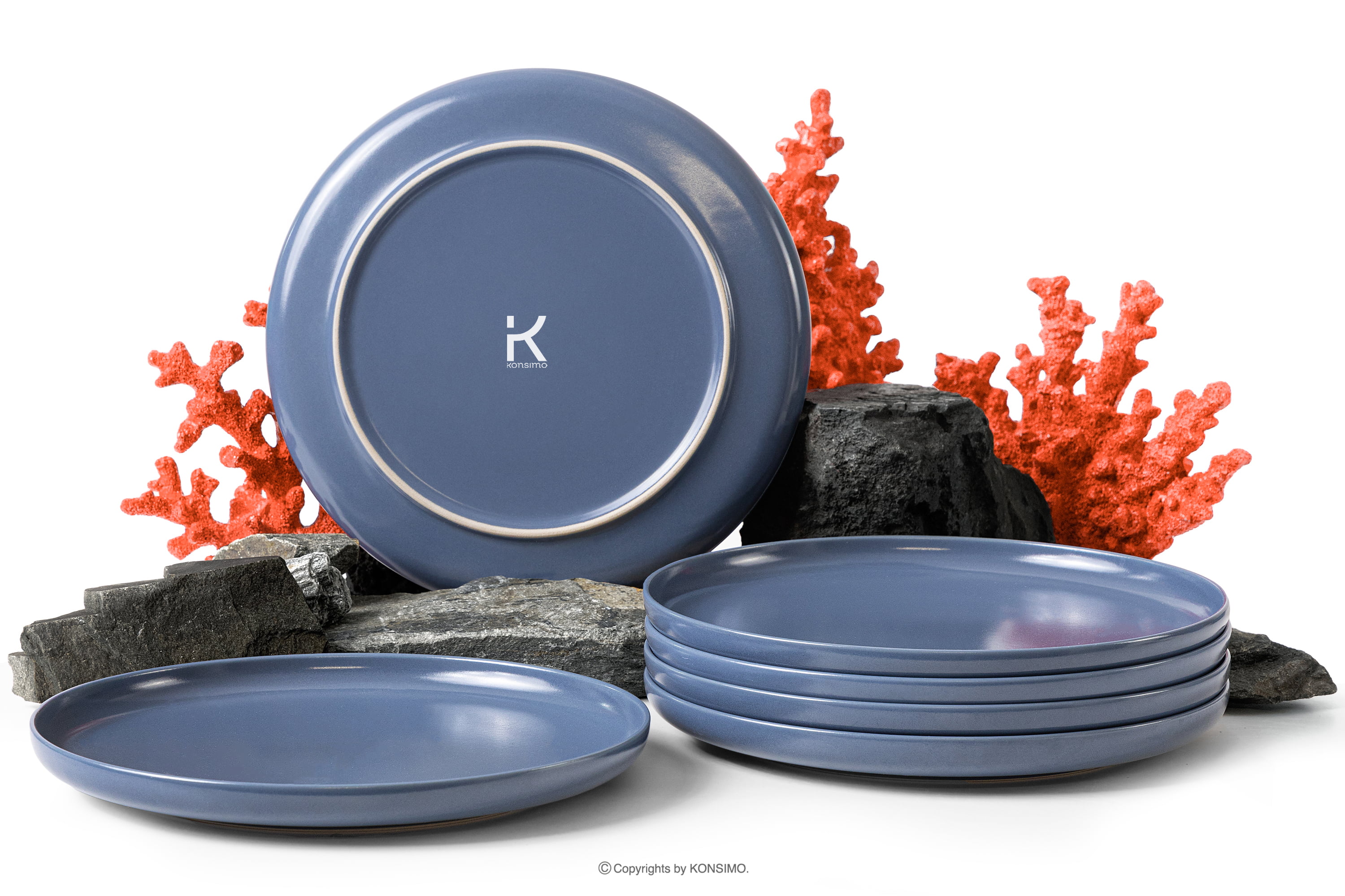 Modrá súprava 6 ks jedálenských tanierov, vyrobená z výnimočnej keramiky, ktorá spĺňa najvyššie štandardy kvality, priťahuje pozornosť svojou výnimočnou eleganciou a zároveň vykazuje pozoruhodnú odolnosť voči akémukoľvek možnému poškodeniu. Matná povrchová úprava a minimalistické oblé tvary jej dodávajú jedinečný a univerzálny charakter, vďaka čomu sa dokonale hodí do moderných, loftových aj tradičných jedální.