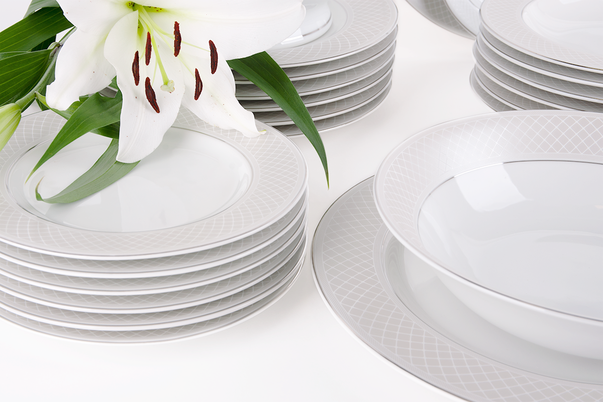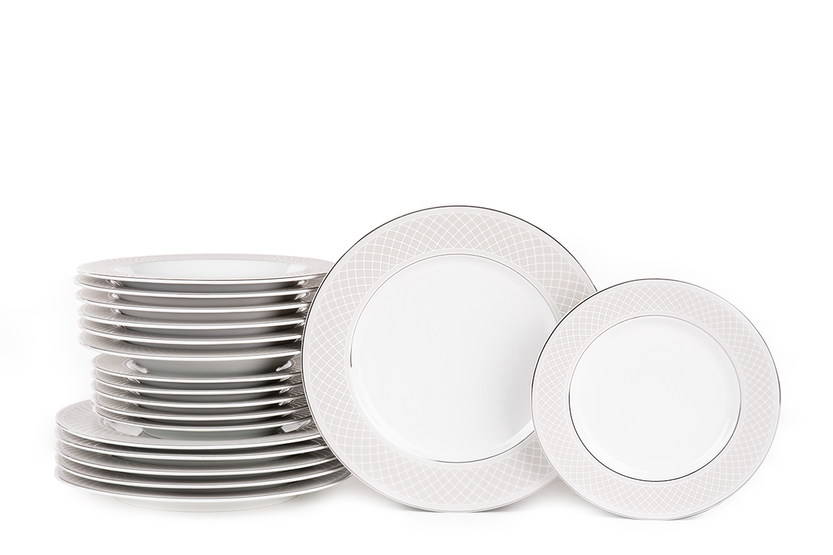 produktu Jedálenská súprava poľský porcelán 18 dielov biely / platinový vzor pre 6 osôb