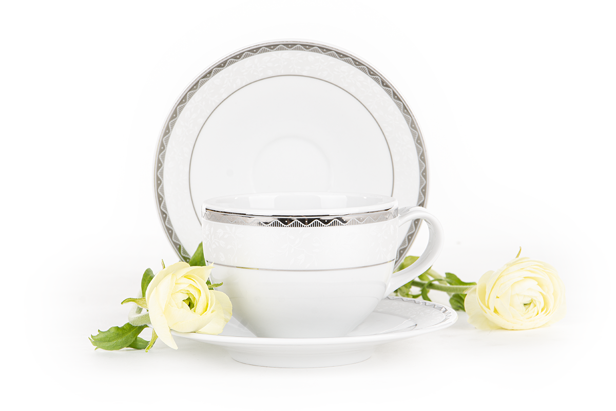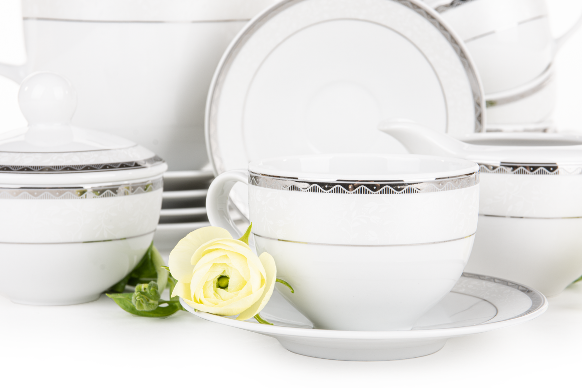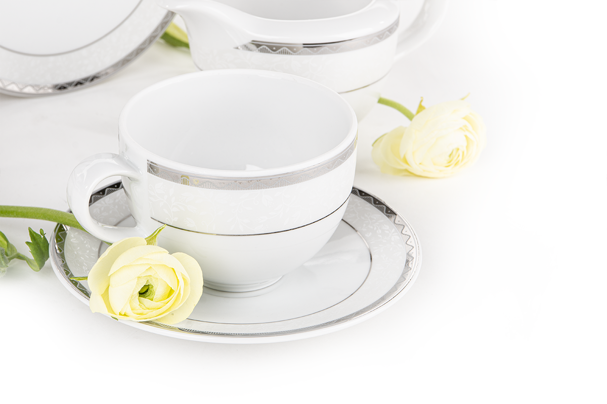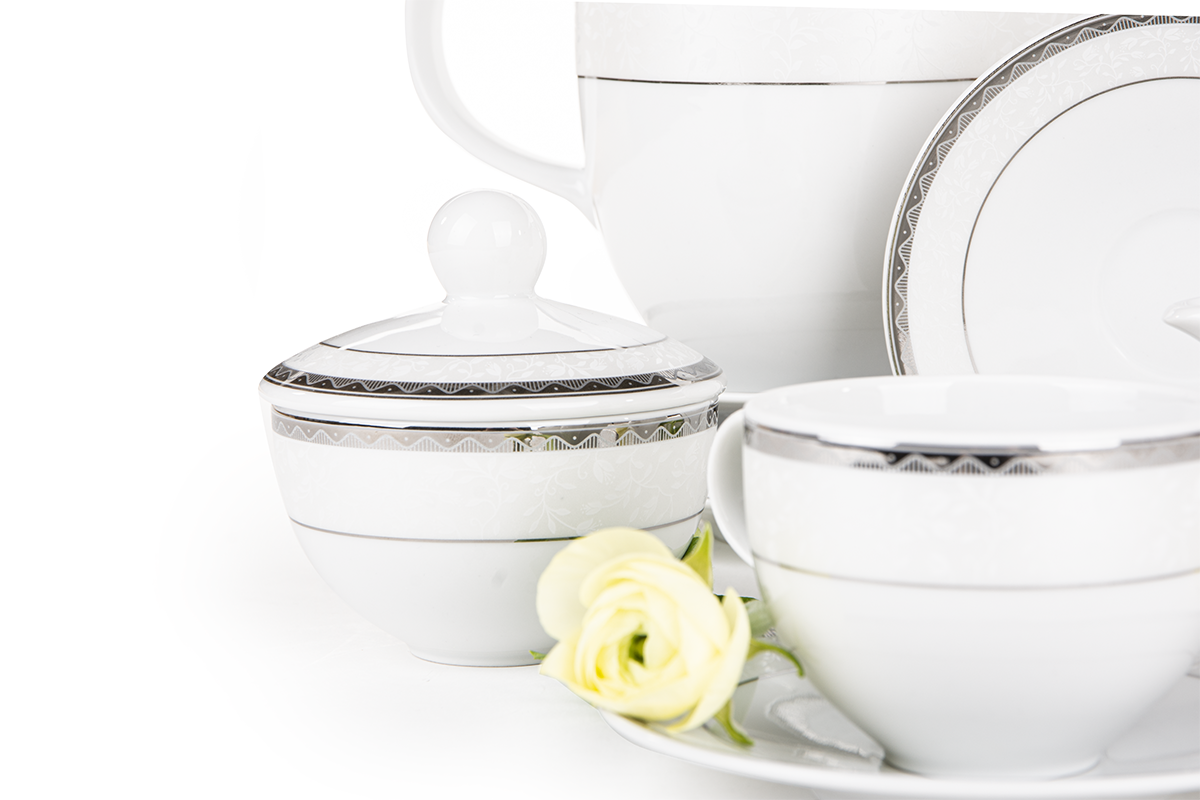 AMELIA PLATYNA Kávová porcelánová súprava pre 6 osôb, 9 dielov biela/ platinový vzor