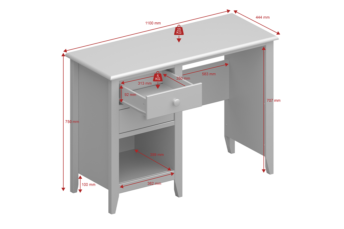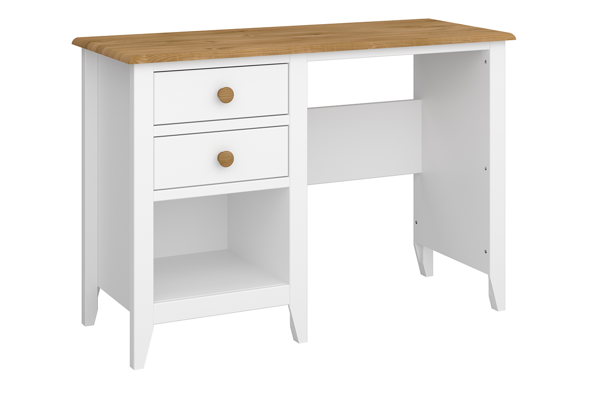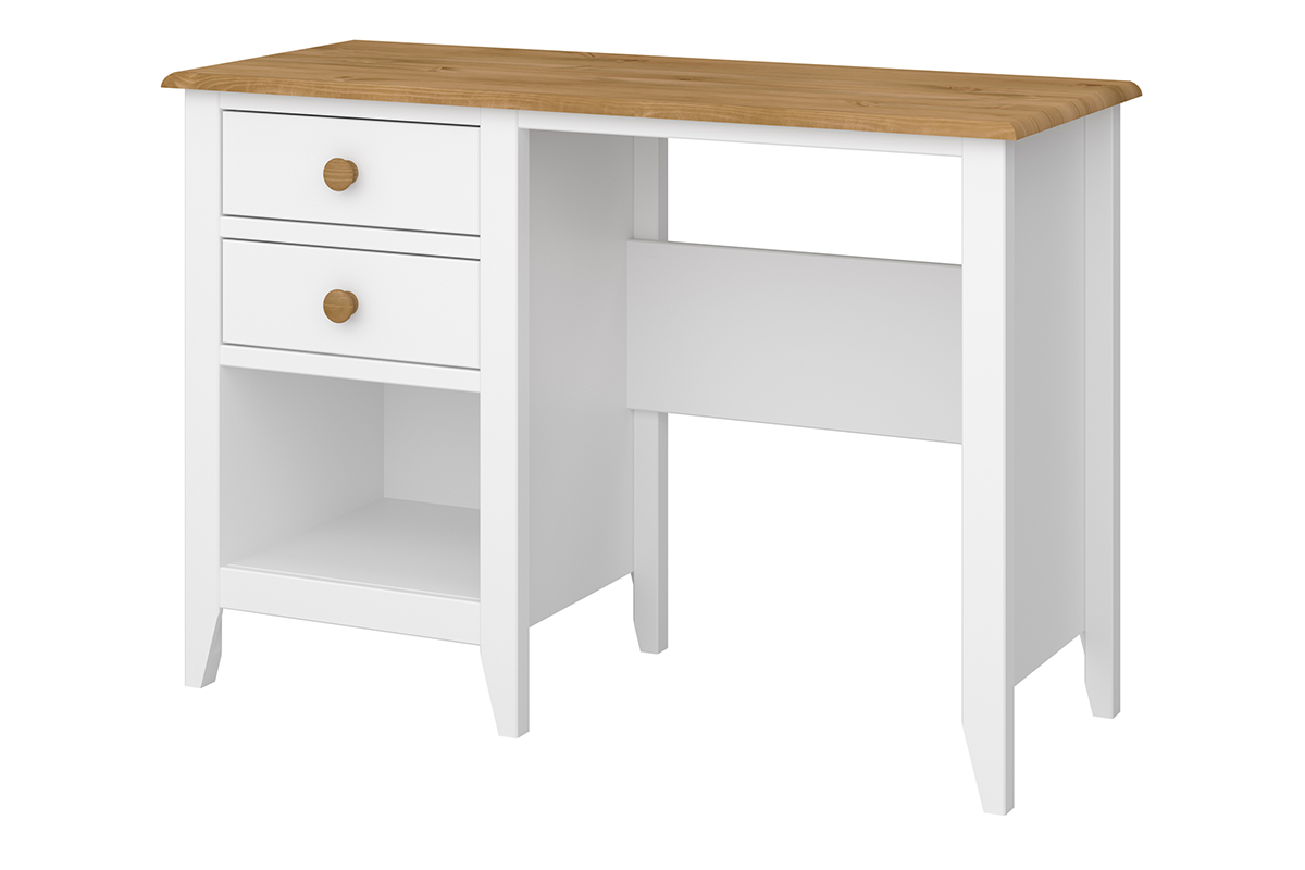 Predovšetkým je vybavený širokou stolnou doskou (110 x 44,4 cm), na ktorú môžete umiestniť dôležité predmety - medzi ostatnými . počítač, kalendár alebo dokumenty. Má tiež dve priestranné zásuvky a veľkú policu, ktorá je umiestnená priamo pod nimi, takže na pracovisku môžete ľahko udržovať poriadok.