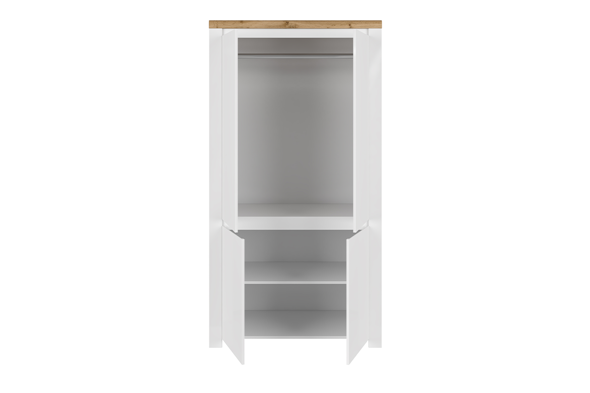 Šatníková skriňa by mala byť priestranná a funkčná, preto naša ponuka z kolekcie Damino obsahuje ako pohodlné, hlboké police, tak tyč na zavesenie dlhších kusov oblečenia. Toto riešenie umožňuje uskladniť všetky druhy oblečenia – od zimných kabátov, cez letné maxi šaty až po basic tričká. Šatníková skriňa je zachovaná, rovnako ako celá kolekcia Damino, v klasickom jednoduchom dizajne.