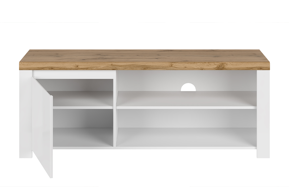 DAMINO Objav celú kolekciu Elegantná biela TV skrinka s policami do obývacej izby- farba bílý lesk/dub wotan