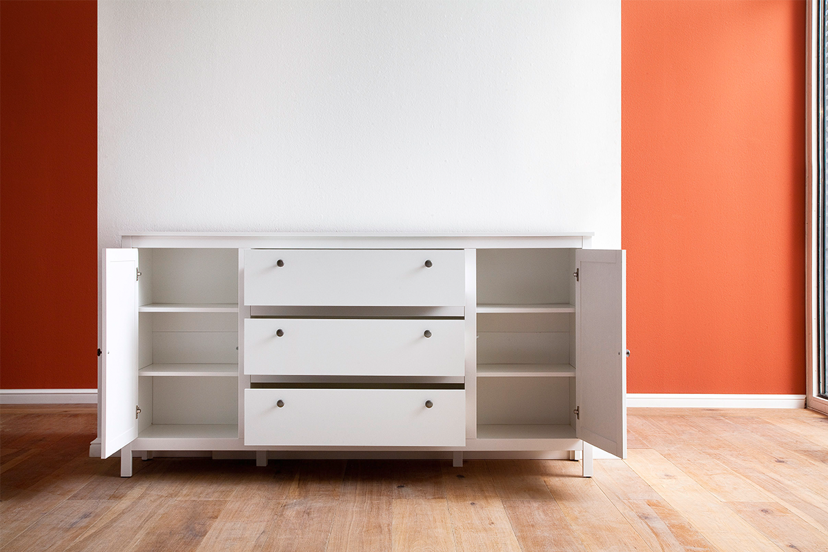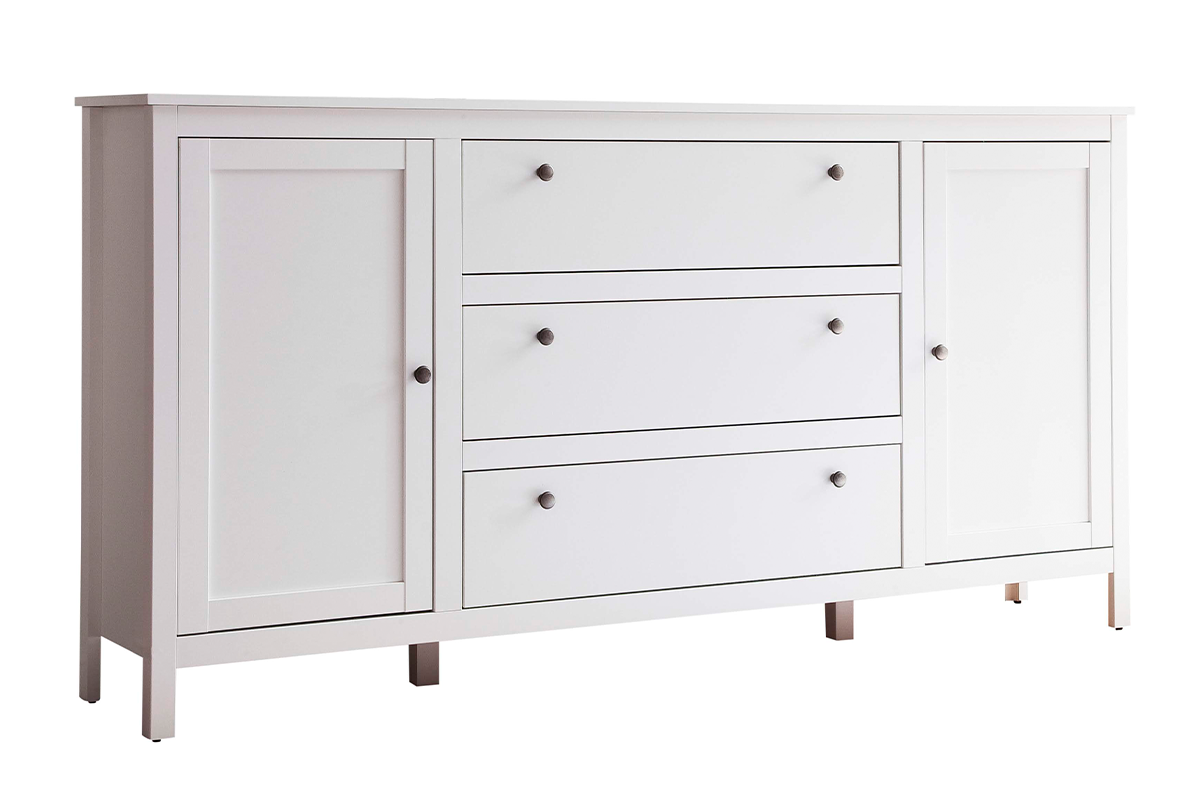 Biela veľká komoda je ideálnym riešením do obývačky alebo spálne. Korpus nábytku je rozdelený na tri časti, dve uzavreté skrinky s dvoma policami na pravej a ľavej strane a jednu centrálnu s tromi výsuvnými zásuvkami. Napriek svojim rozmerom - 183x98x38 cm - nepôsobí objemná komoda Farge ťažkopádnym" dojmom vďaka štíhlym nožičkám vo farbe nábytku, ktoré ju opticky odľahčujú.
