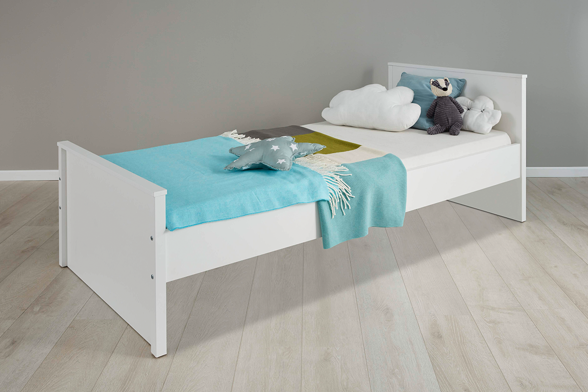 Jednoduchá biela posteľ doplní spálňu v modernom, elegantnom štýle. Štandardný rozmer tohto kusu nábytku - 90x200 - umožňuje vybrať si matrac podľa svojich potrieb a pohodlia zo širokej ponuky výrobkov dostupných na trhu. Rám môže slúžiť ako posteľ do izby mladého človeka alebo ako doplnkový kus nábytku napríklad vo veľkej šatni alebo v izbe pre hostí.