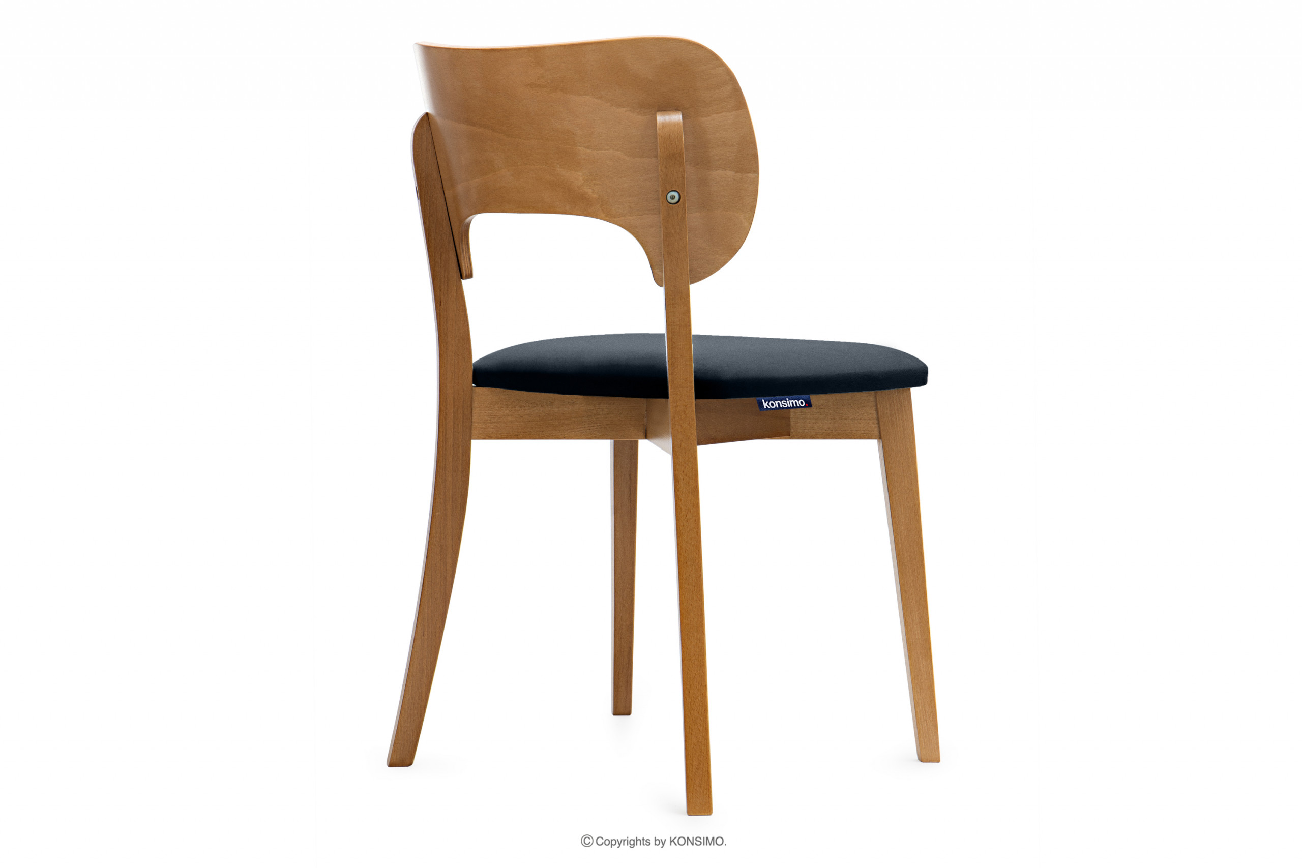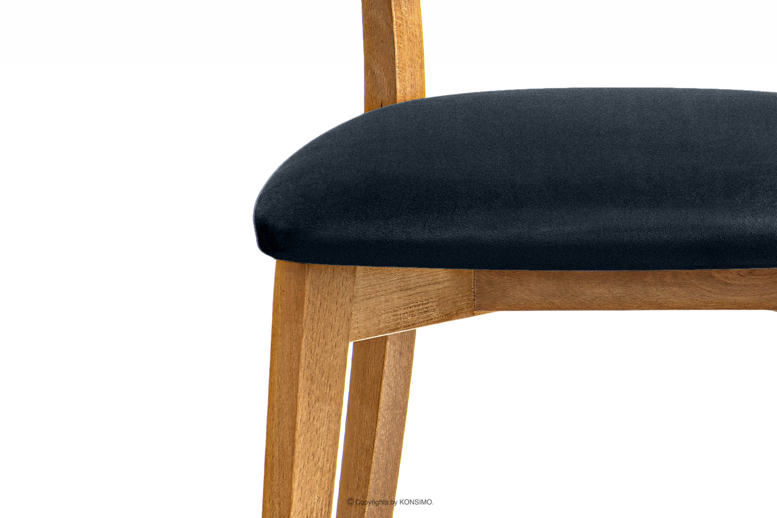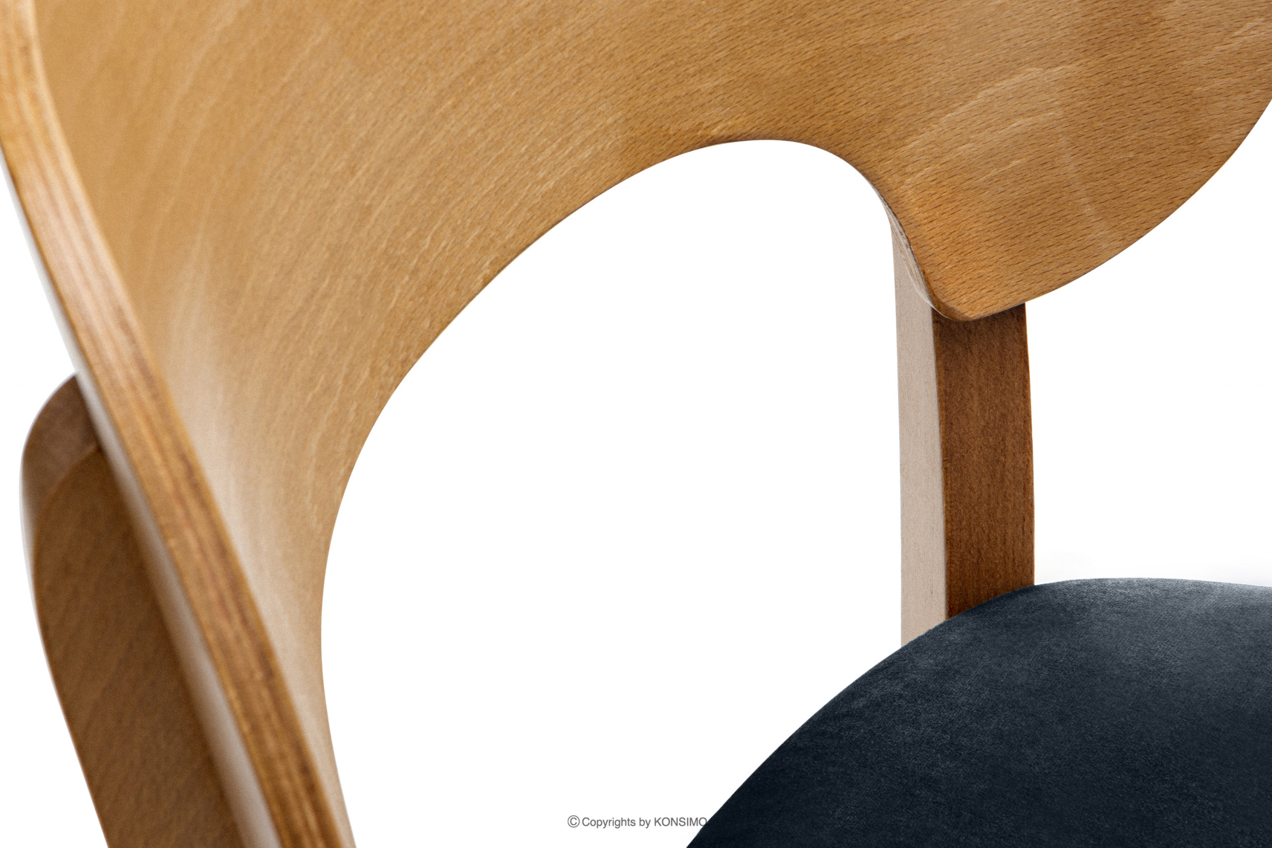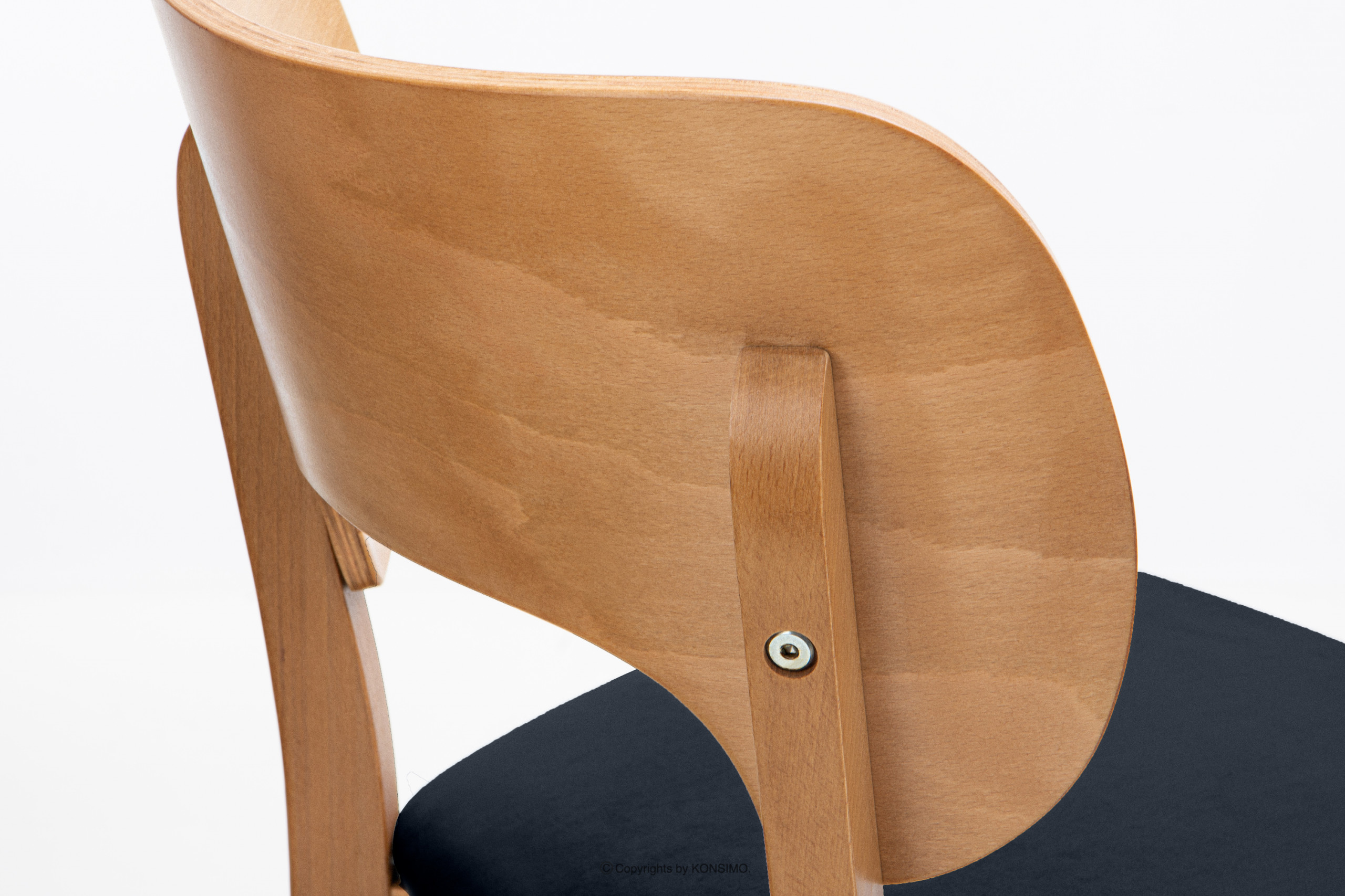 Sedadlo stoličky je vyplnené polyuretánovou penou a čalúnené zamatovou látkou. Ľahko sa udržiava v čistote a látka je príjemná na dotyk. Mierne zakrivený sedák navyše poskytuje pohodlie a je prispôsobený používateľovi. Samozrejme, plní aj estetickú funkciu a spolu s mierne zakrivenými nohami vyzerá skvele.