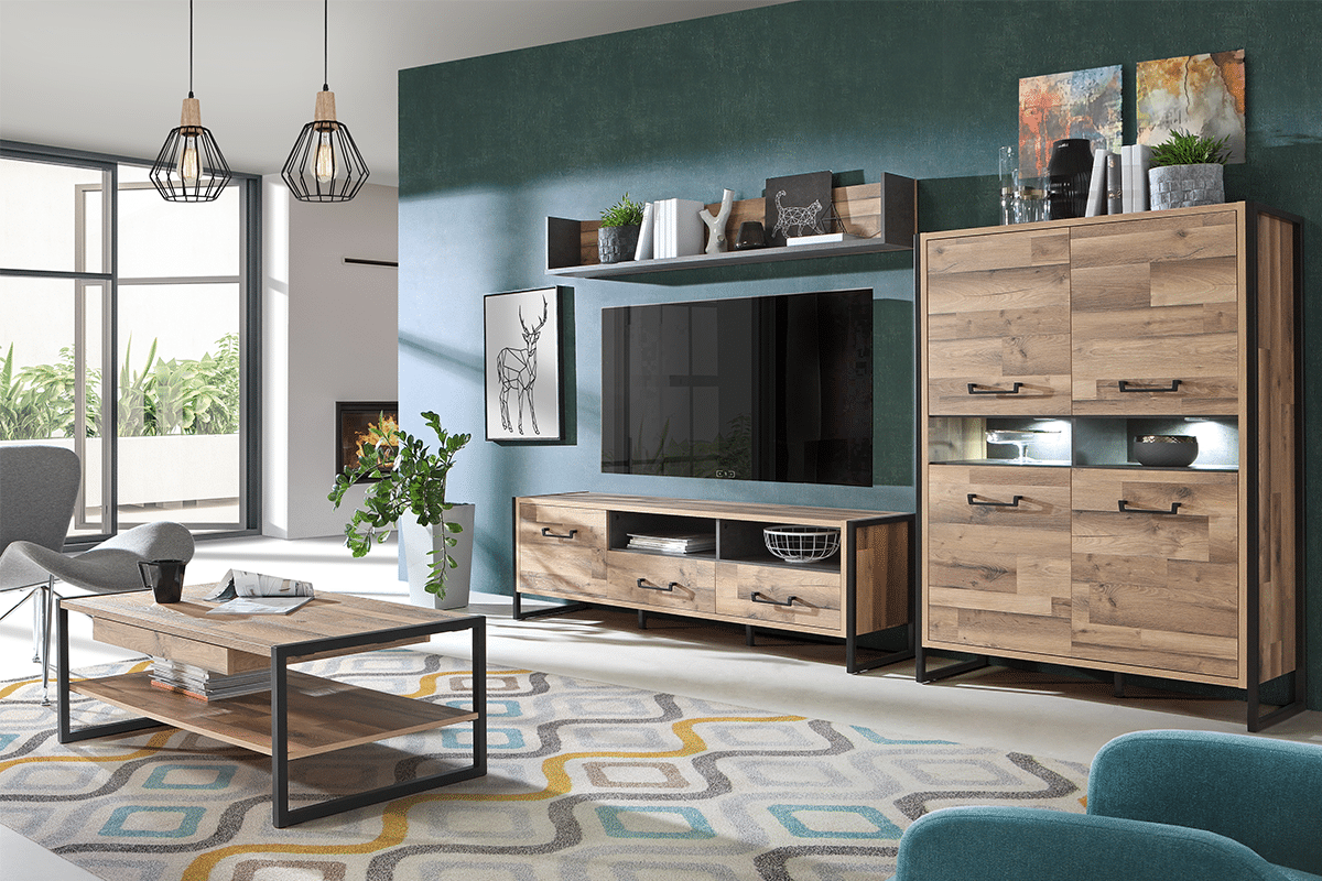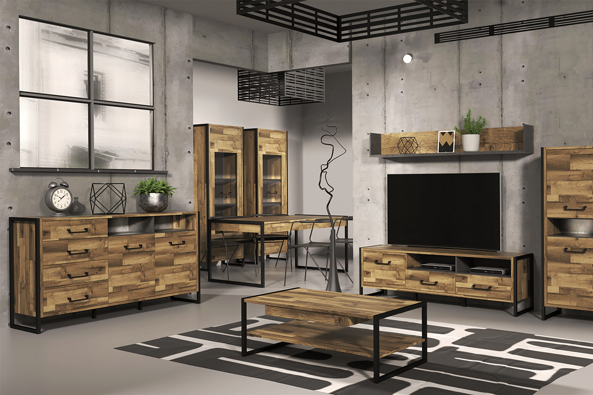 HUD Objav celú kolekciu Industriálna TV skrinka- farba dub dub/tmavě šedá