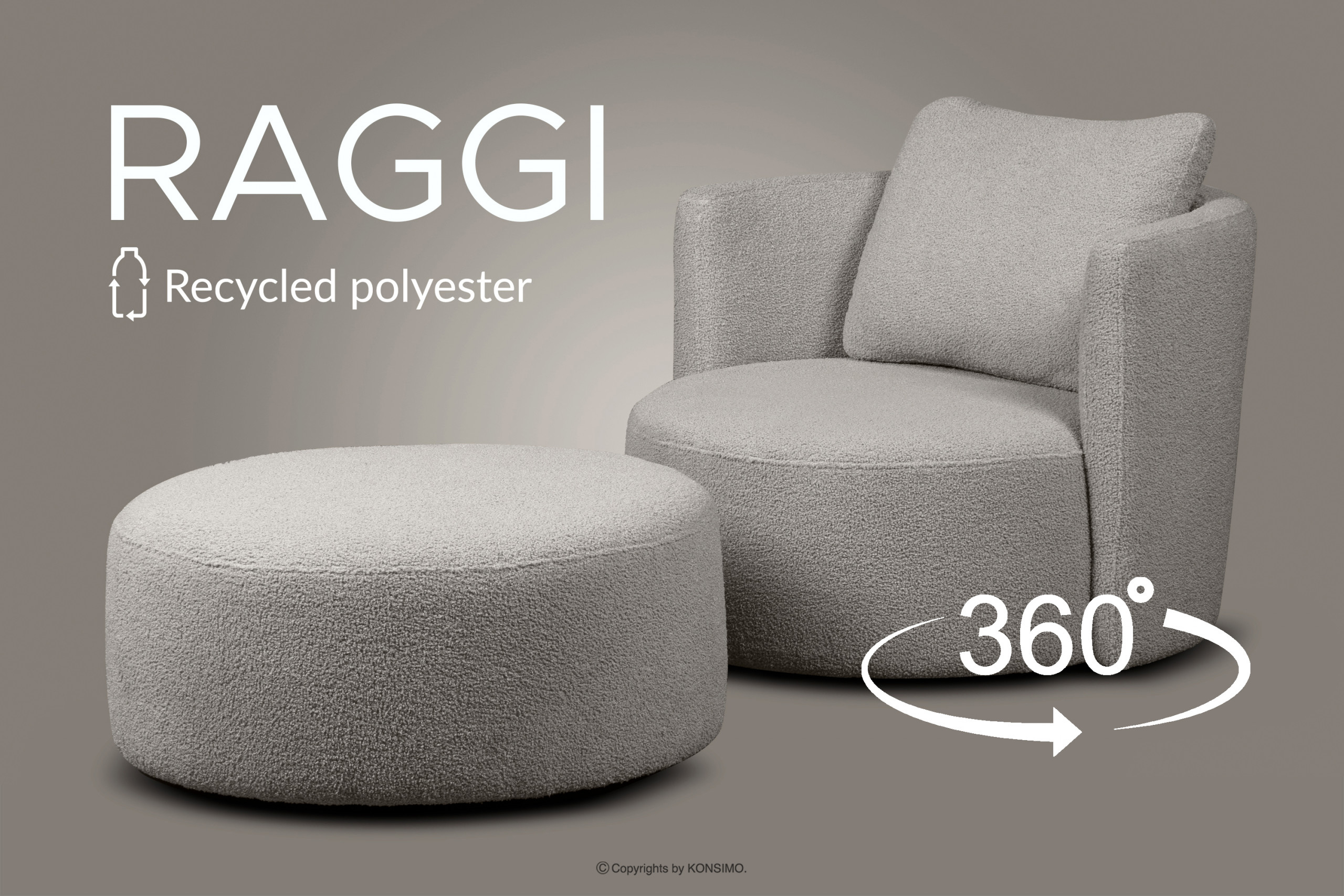 Neobvyklá kolekcia nábytku RAGGI v modernistickom štýle poteší priaznivcov módneho a neobvyklého usporiadania. Nábytok je vyrobený z vysokokvalitných materiálov, a preto je zaručená jeho dlhá životnosť. Hoci sú materiály vysoko kvalitné, celá kolekcia bola vyrobená spôsobom šetrným k životnému prostrediu. Kolekcia RAGGI zahŕňa kreslá a pufy. Okrem toho je celá kolekcia k dispozícii v šiestich farbách: krémová, svetlo béžová, tmavosivá, tmavobéžová, béžová, svetlo sivá. Všetky výrobky boli vyrobené vo farbách ladiacich so zvyškom kolekcie, aby ju dopĺňali. Farby boli vybrané tak, aby ste si mohli vybrať tú správnu pre svoj interiér.