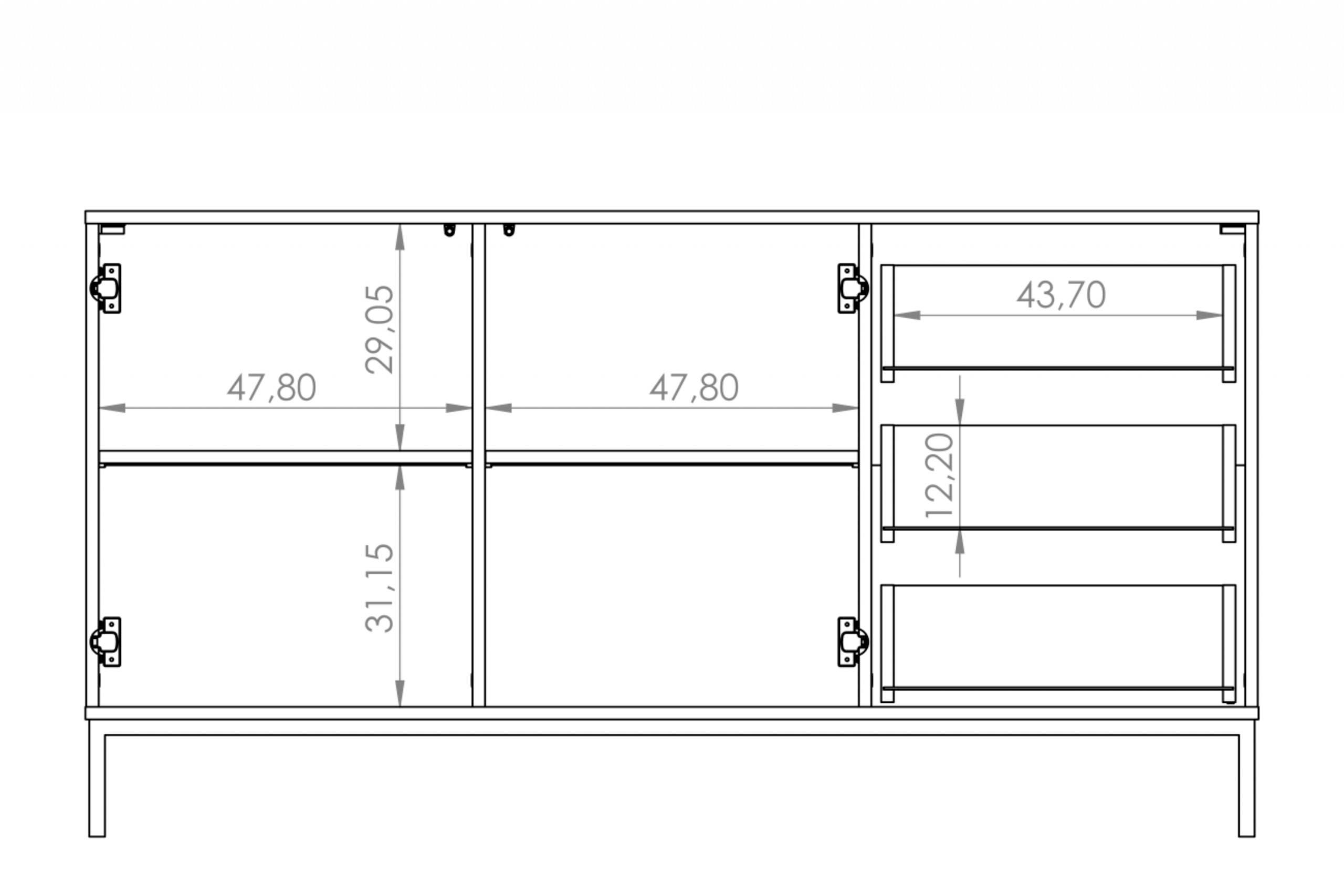 Komoda je vyrobená z drevotrieskovej dosky, ktorá zaručuje stabilitu a odolnosť na dlhé roky, zatiaľ čo zadný panel je vyrobený z HDF. Má tri priestranné zásuvky s výsuvmi na dne, takže nevypadávajú, sú robustné a menej viditeľné ako štandardné zásuvky. Komoda má aj dve skrinky s otváracími dvierkami. Každá z nich má poličku, ktorá uľahčuje udržiavanie poriadku a organizácie.