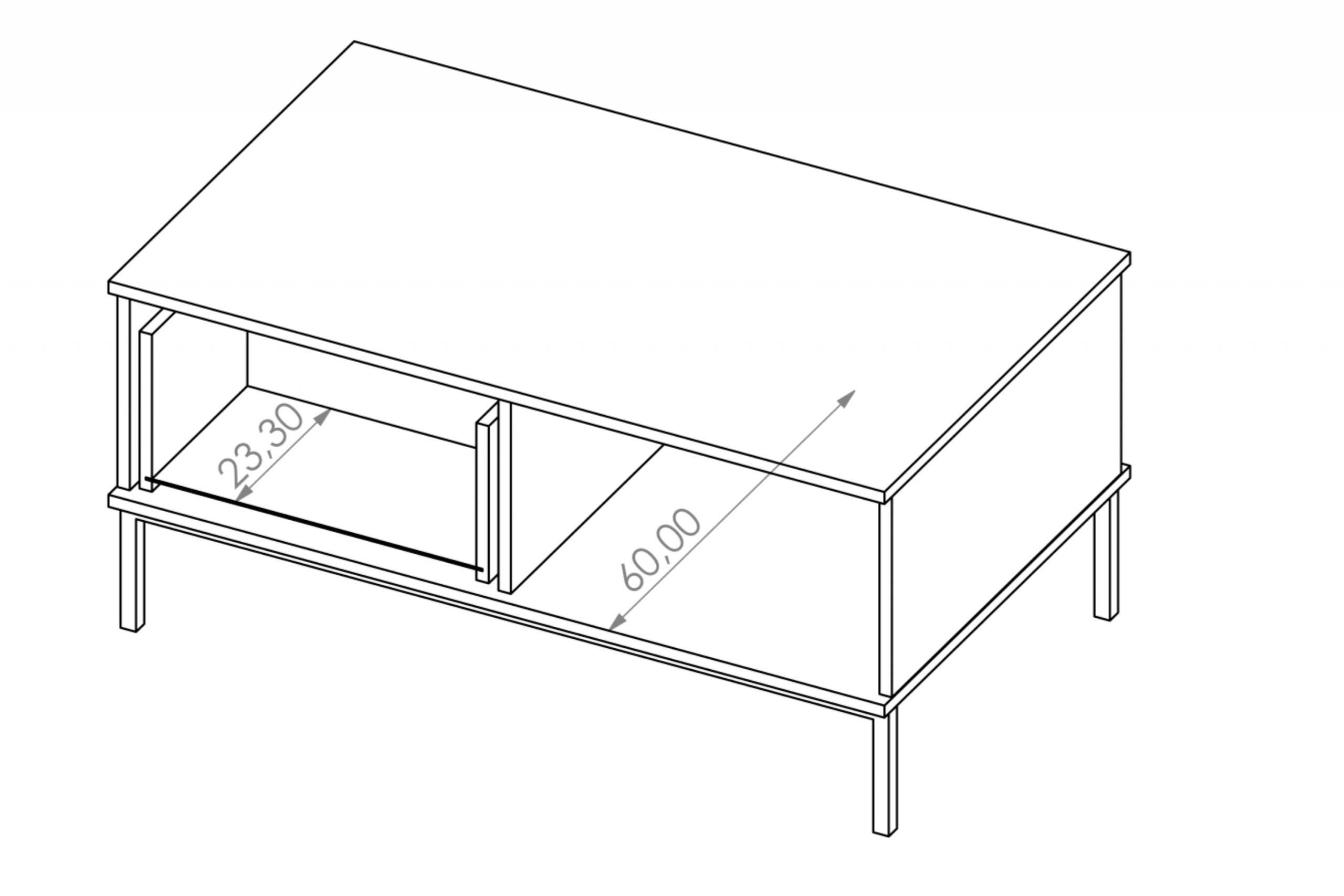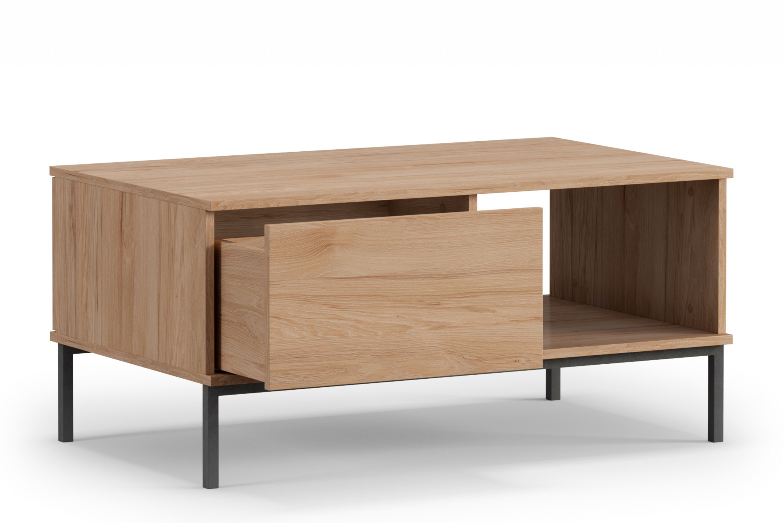 Konferenčný stolík je vyrobený z drevotrieskovej dosky, ktorá zaručuje stabilitu a odolnosť na dlhé roky, a zadná doska je vyrobená z HDF. Má dve zásuvky so spodnými koľajničkami, takže nevypadávajú, sú robustné a menej viditeľné ako štandardné zásuvky. Možno ich použiť na odkladanie praktických predmetov, ako sú diaľkové ovládače alebo noviny, a udržiavať tak v miestnosti poriadok.
