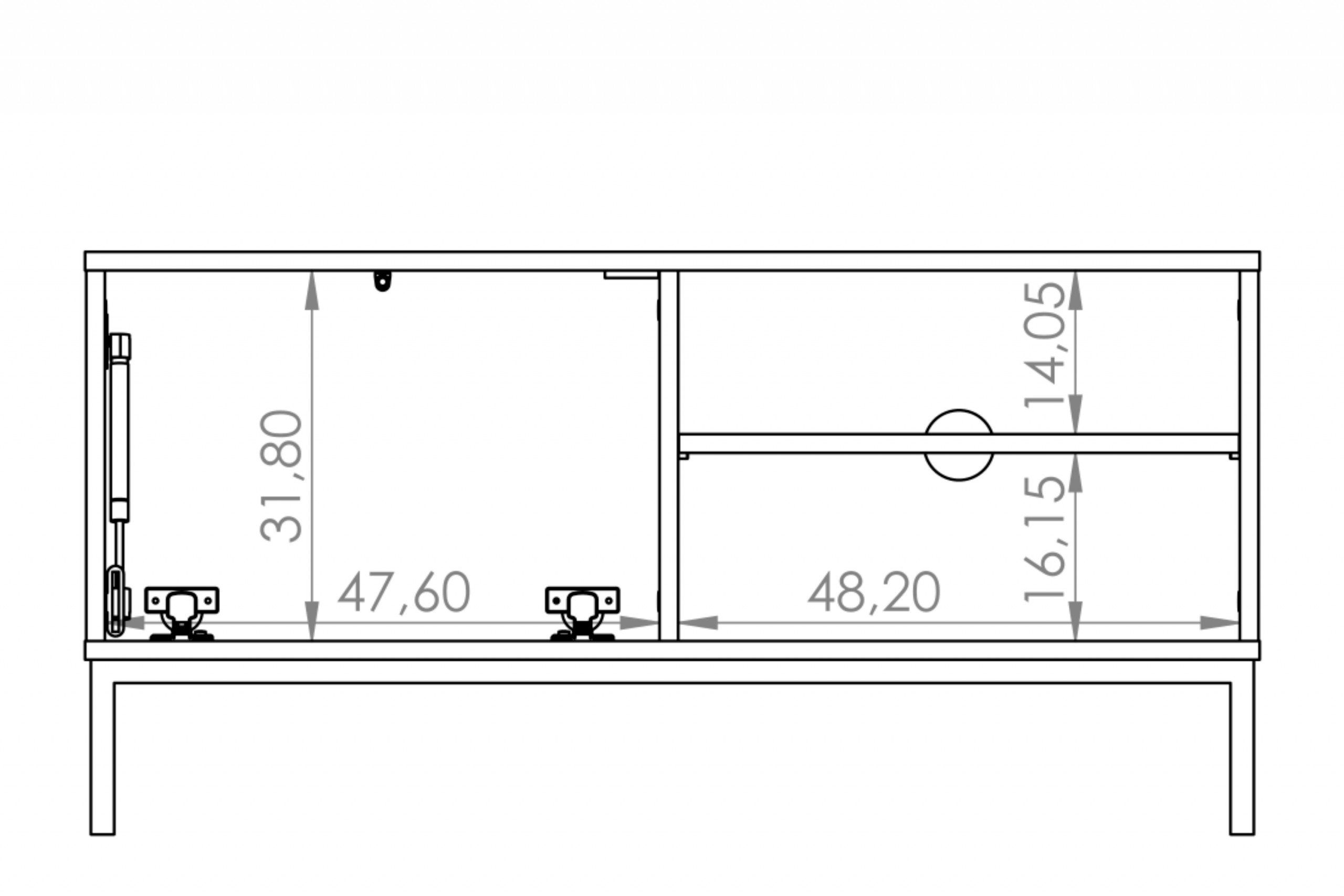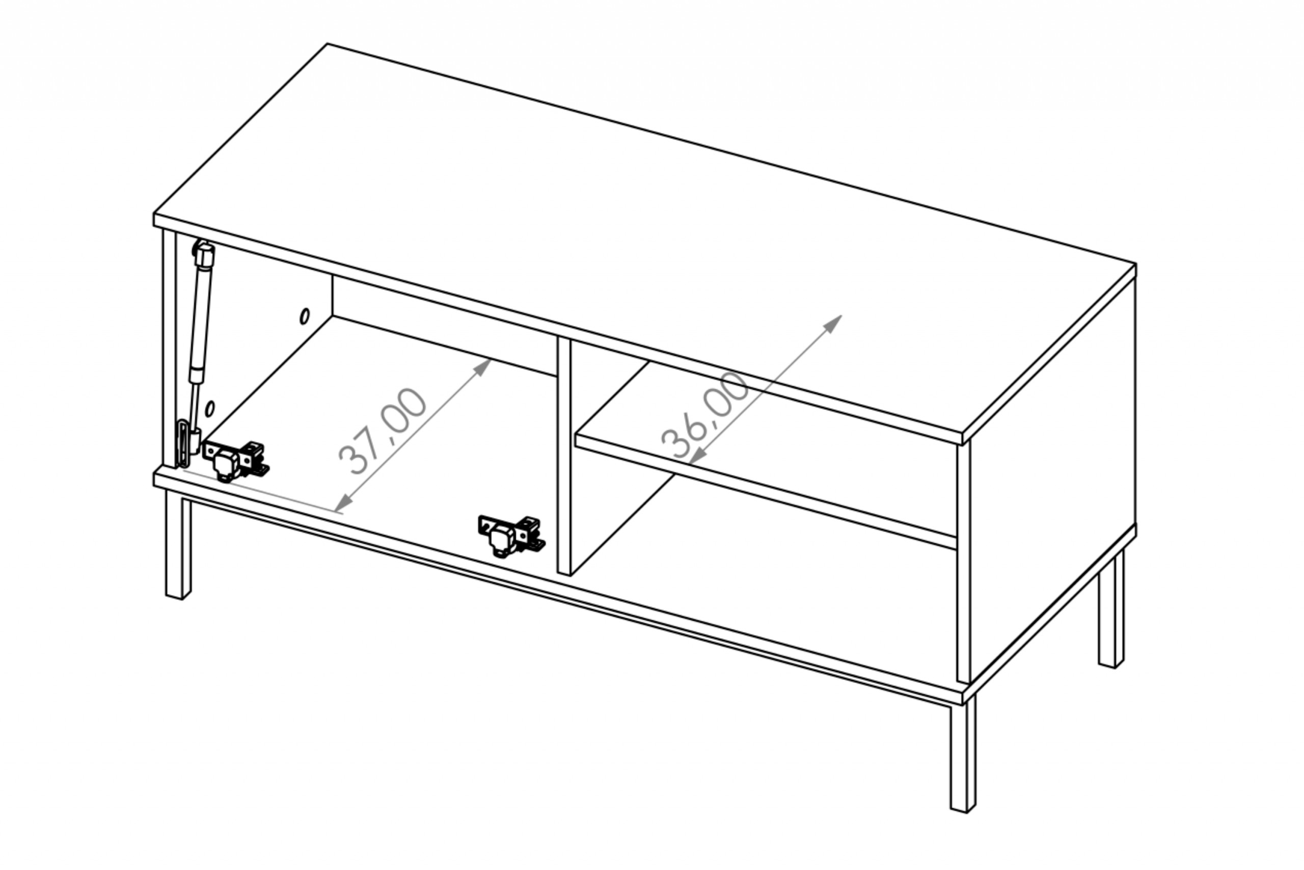 Stôl je vyrobený z drevotrieskovej dosky, ktorá zaručuje stabilitu a odolnosť na dlhé roky, zatiaľ čo zadná stena je vyrobená z HDF. Na pravej strane má poličku, zatiaľ čo na ľavej strane sú výklopné dvere podopreté plynovou fľašou. Malá veľkosť skrine RTV umožňuje jej umiestnenie v malých miestnostiach.