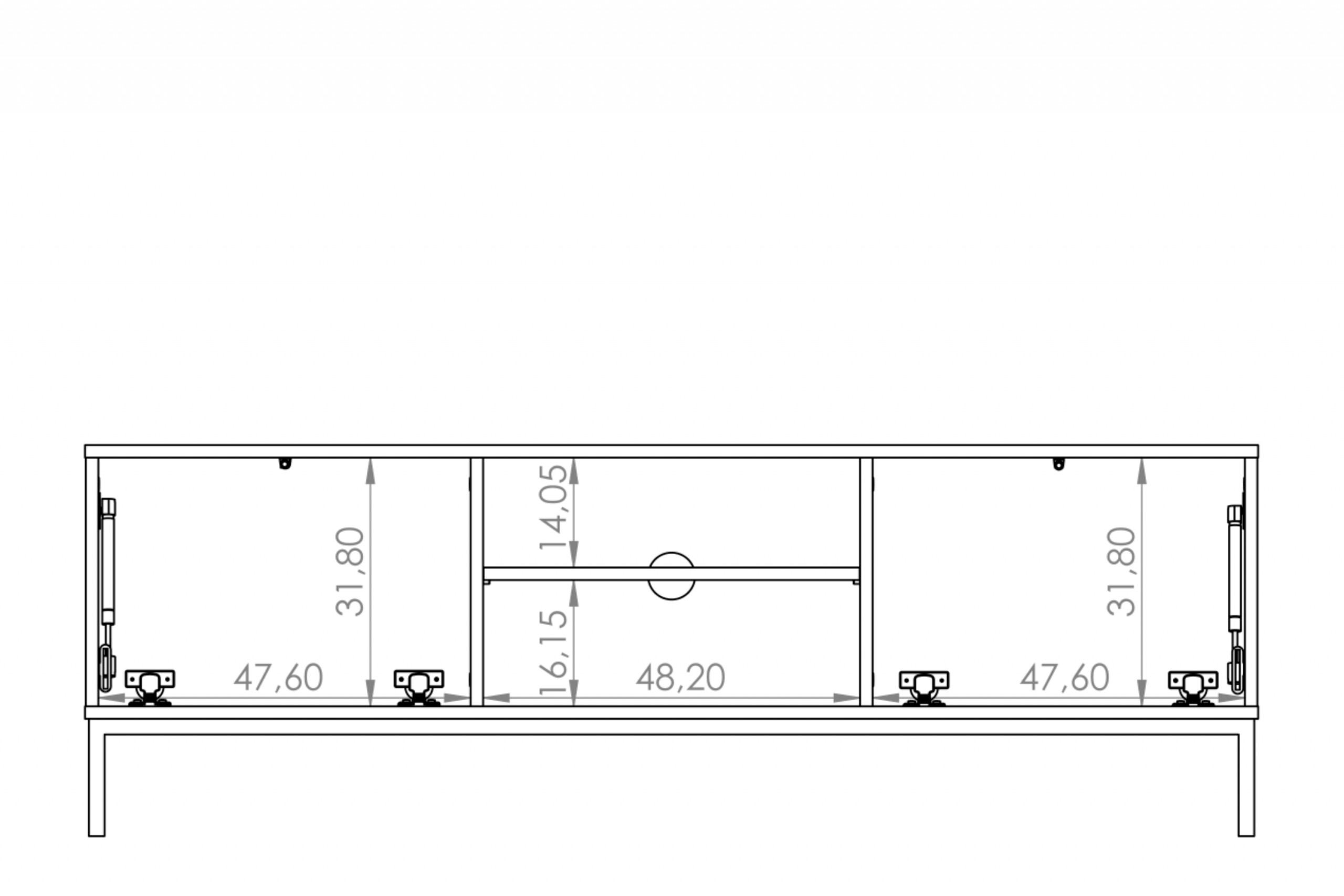 Biela široká skrinka RTV s policami do obývačky je veľmi funkčný kus nábytku so zaujímavým dizajnom. Nemá žiadne zbytočné ozdoby ani kľučky, dvere sa otvárajú metódou push-to-open. Na poličku možno umiestniť set-top box, konzoly alebo iné predmety dennej potreby. Skriňa RTV je umiestnená na vysokých kovových nohách. Udržiavanie poriadku v miestnosti je vďaka nim jednoduchšie a čistiaci robot sa bez problémov zmestí pod nábytok.